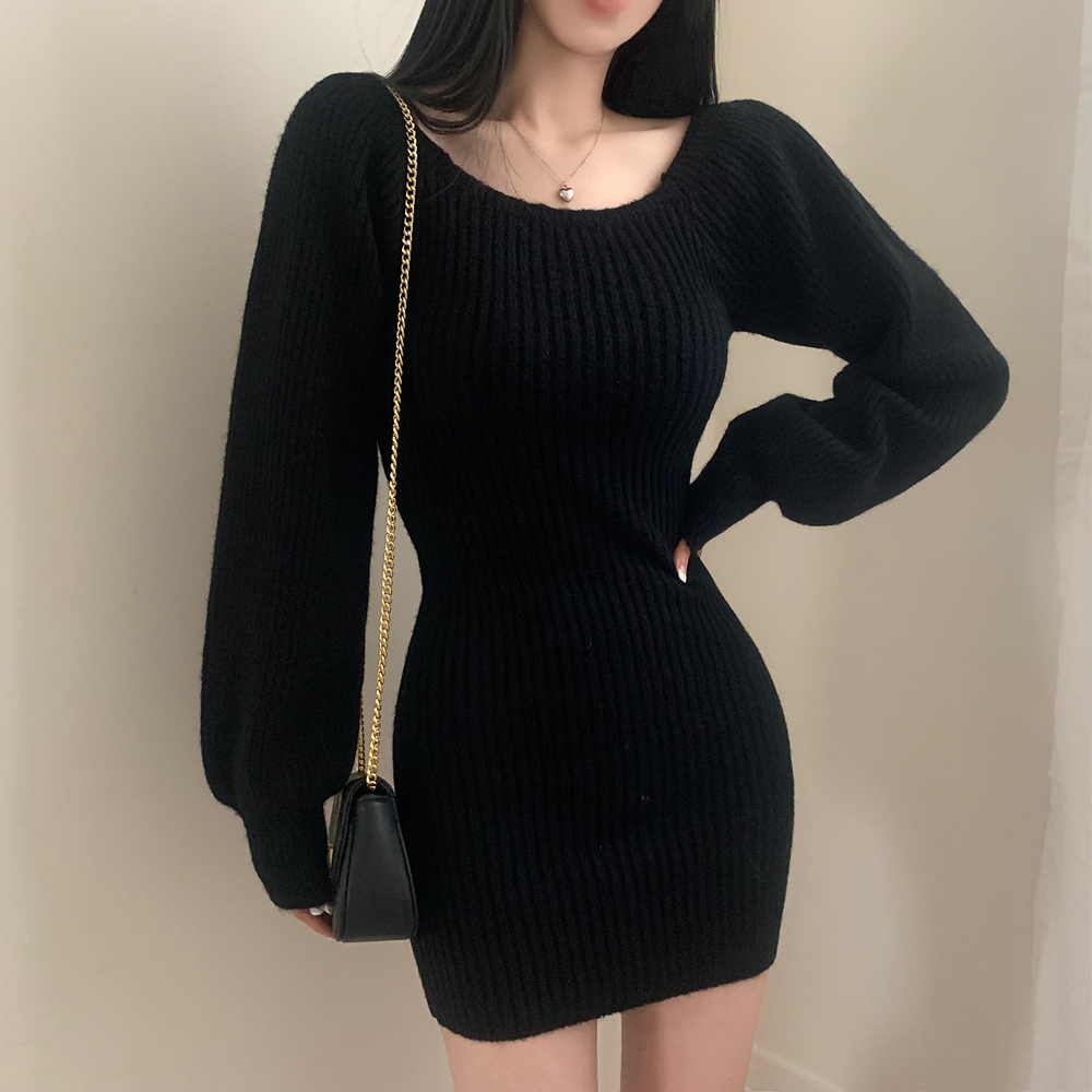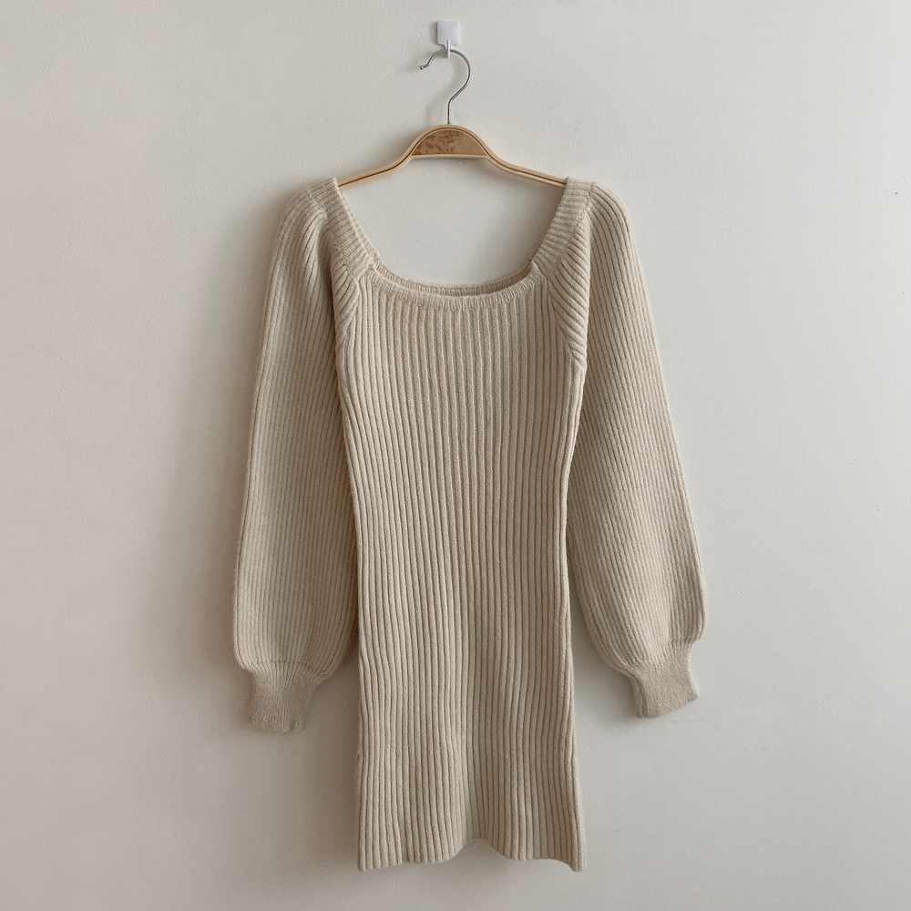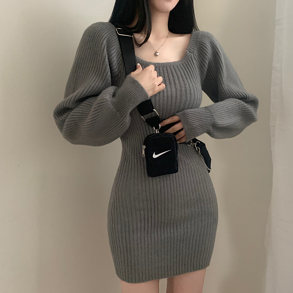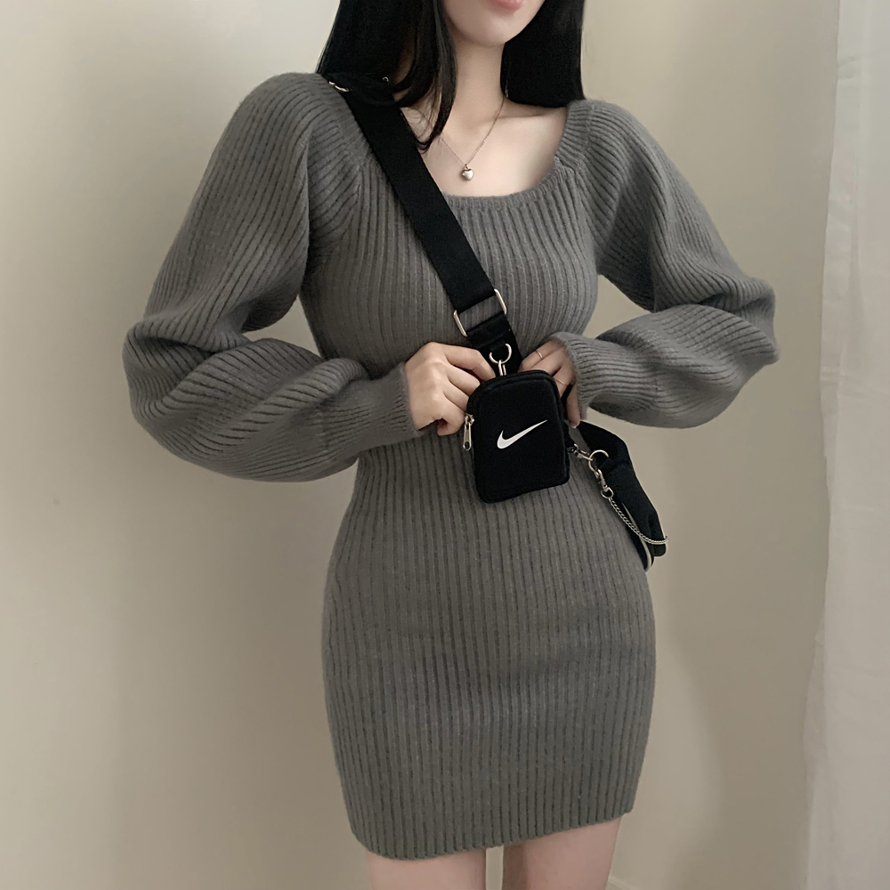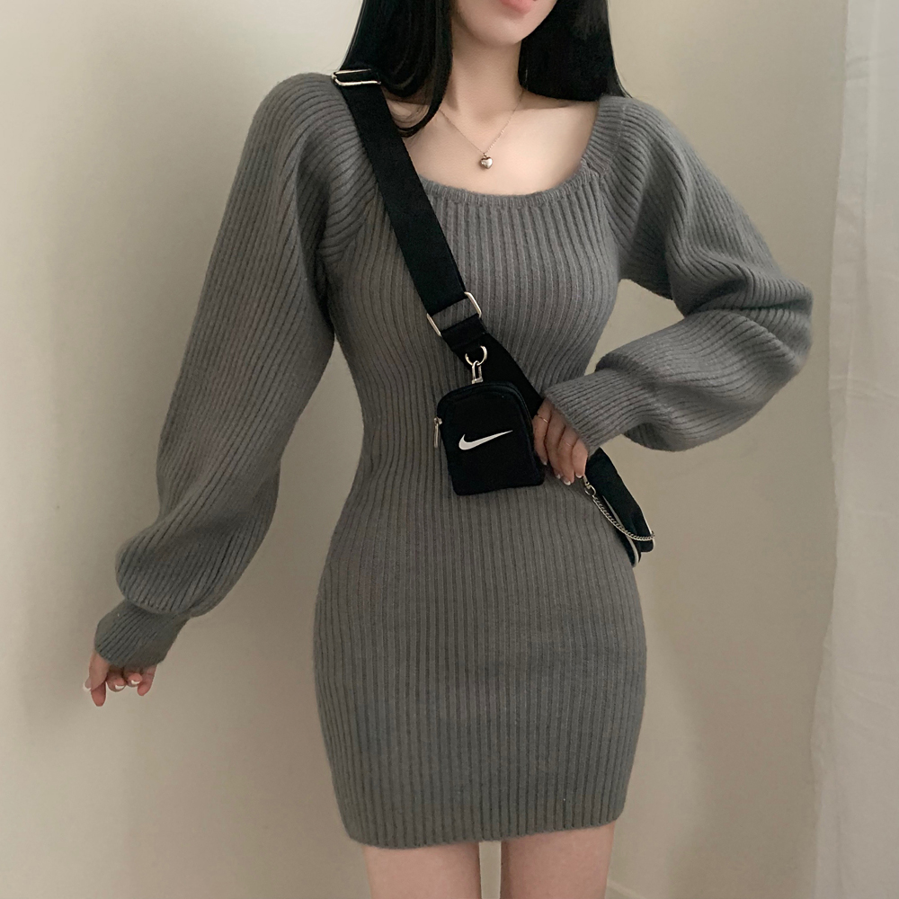 SOP127204 남심저격 스퀘어넥 퍼프 골지 긴팔 미니 원피스