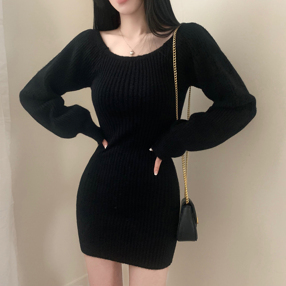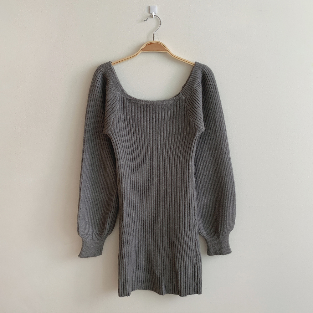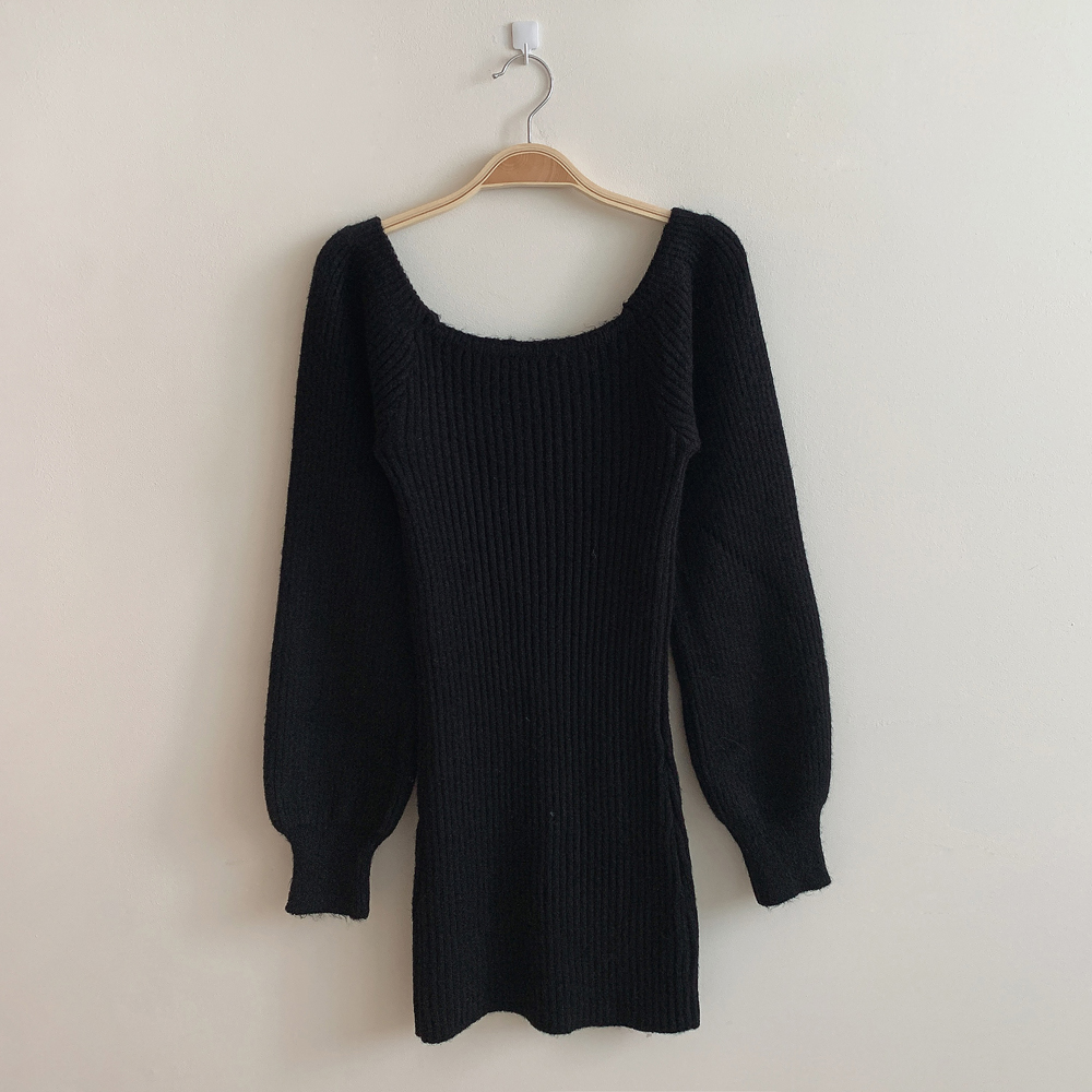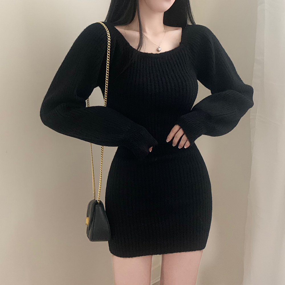 SOP127204 남심저격 스퀘어넥 퍼프 골지 긴팔 미니 원피스