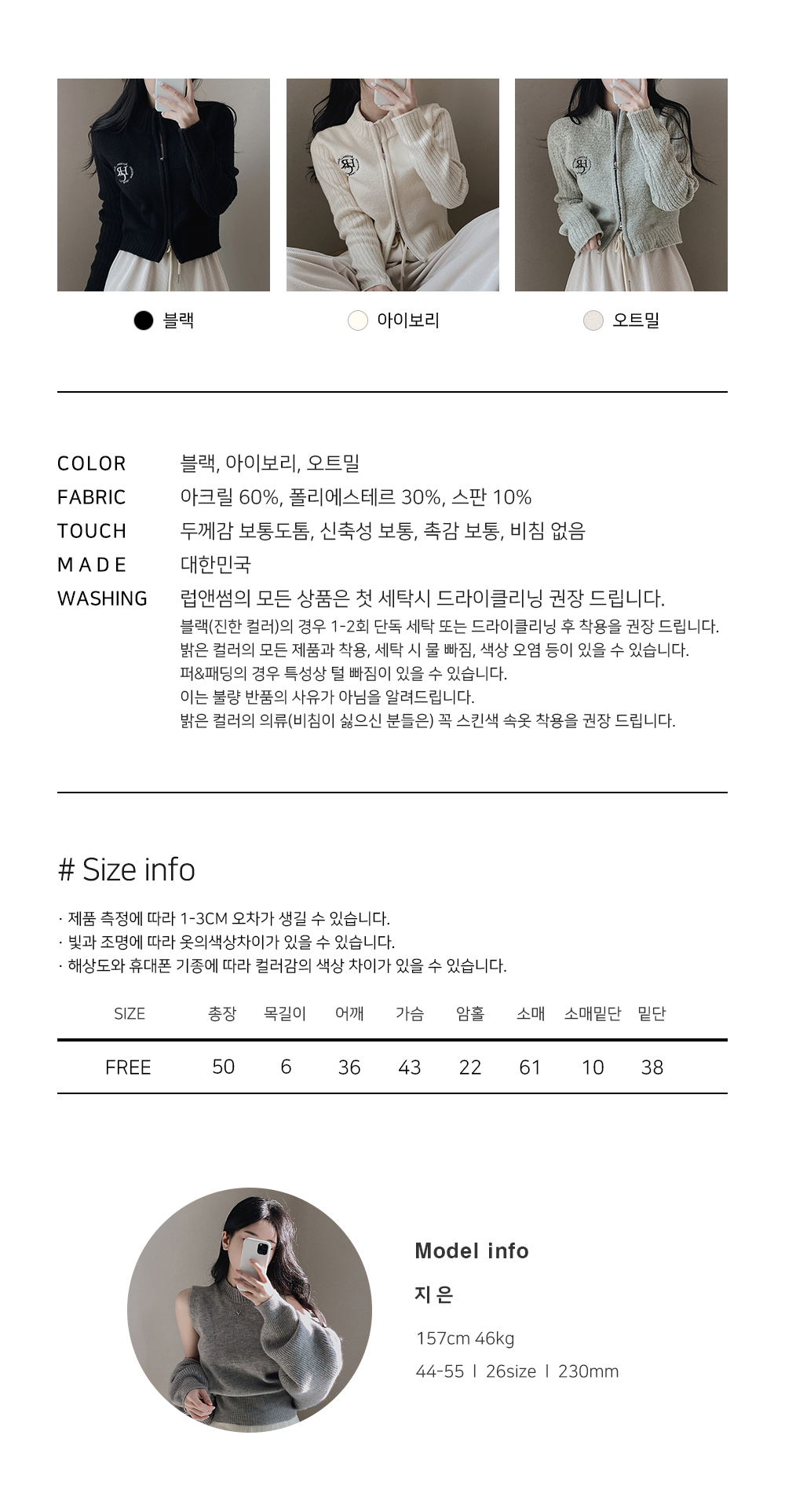 | 素材 | 아크릴(60%), 폴리,폴리에스터(30%), 스판,스판덱스(10%) |