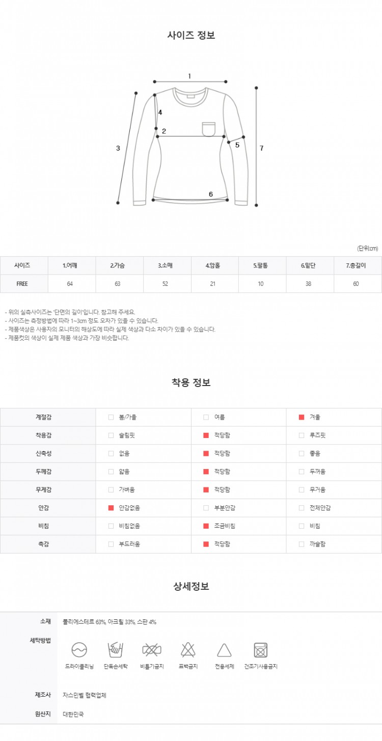 | 素材 | 폴리,폴리에스터(63%), 스판(4%), 아크릴(33%) |