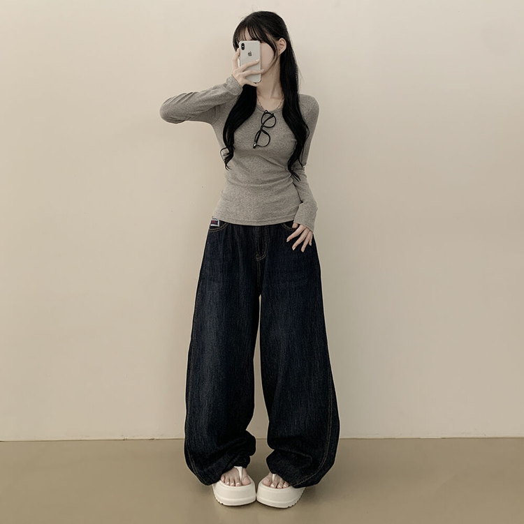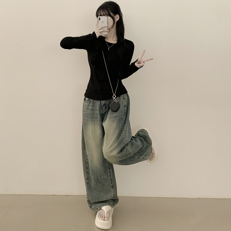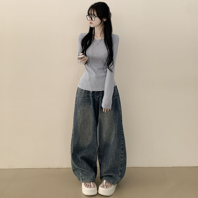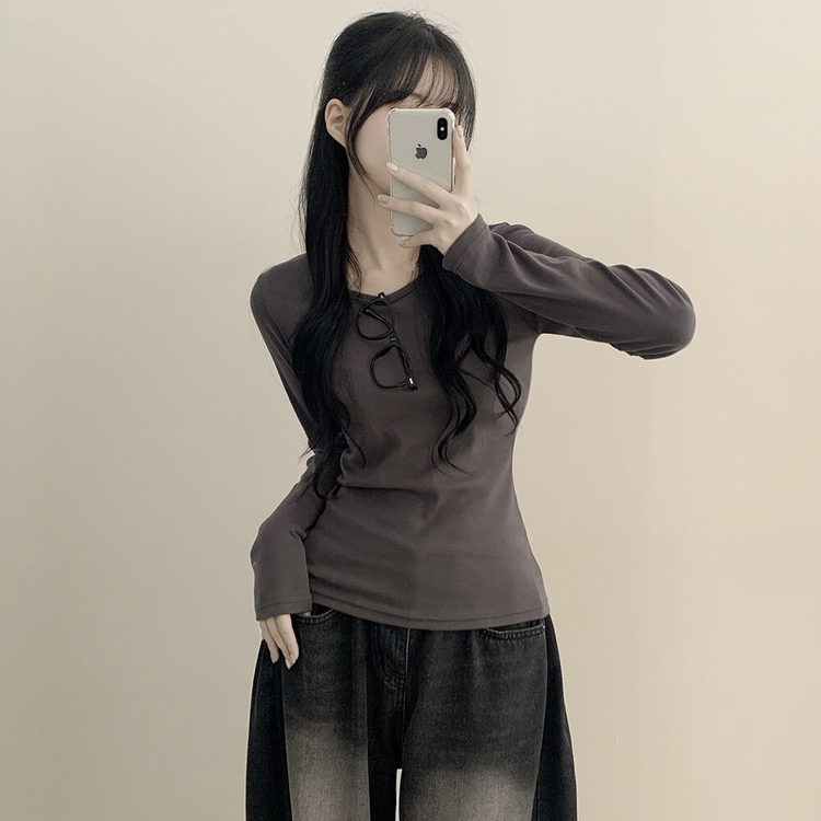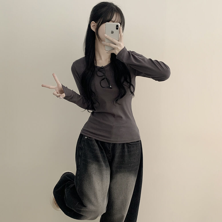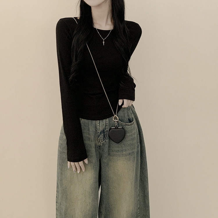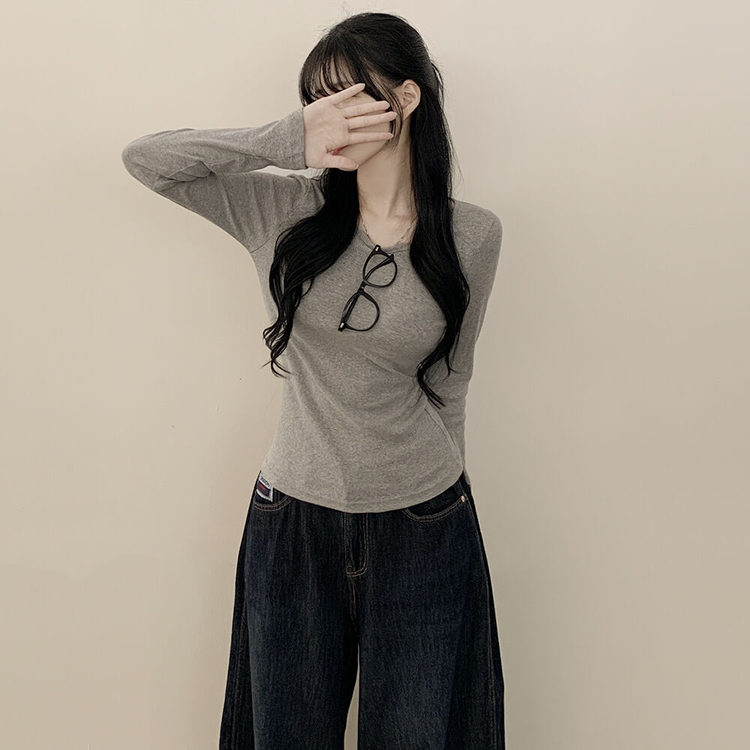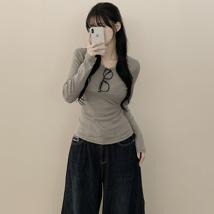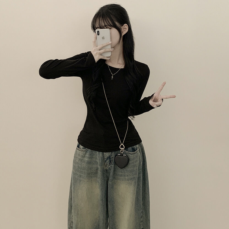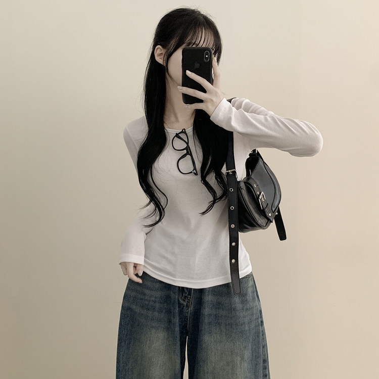 STS57471 허얇골넓 슬림 무지 라운드 유넥 허리잘록 긴팔티셔츠