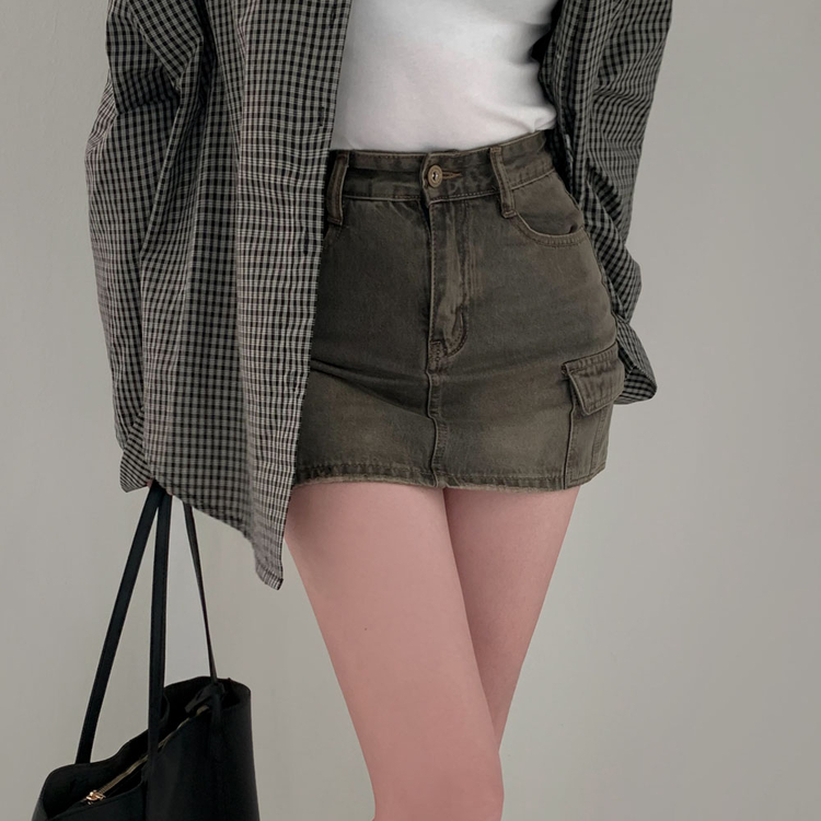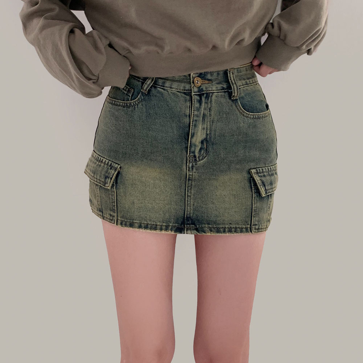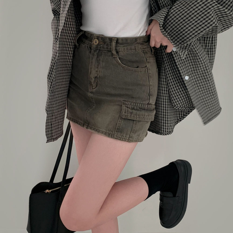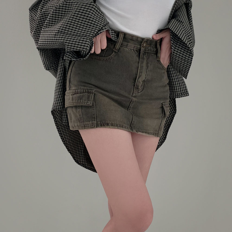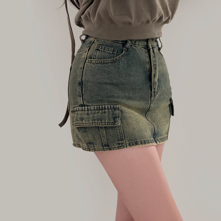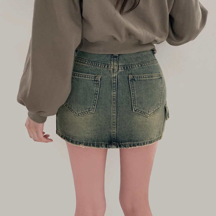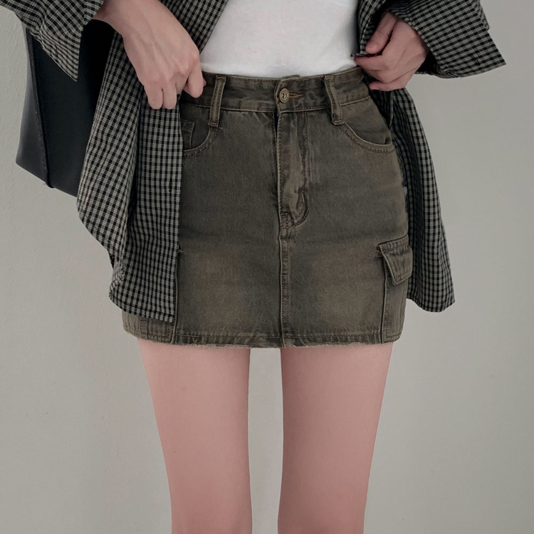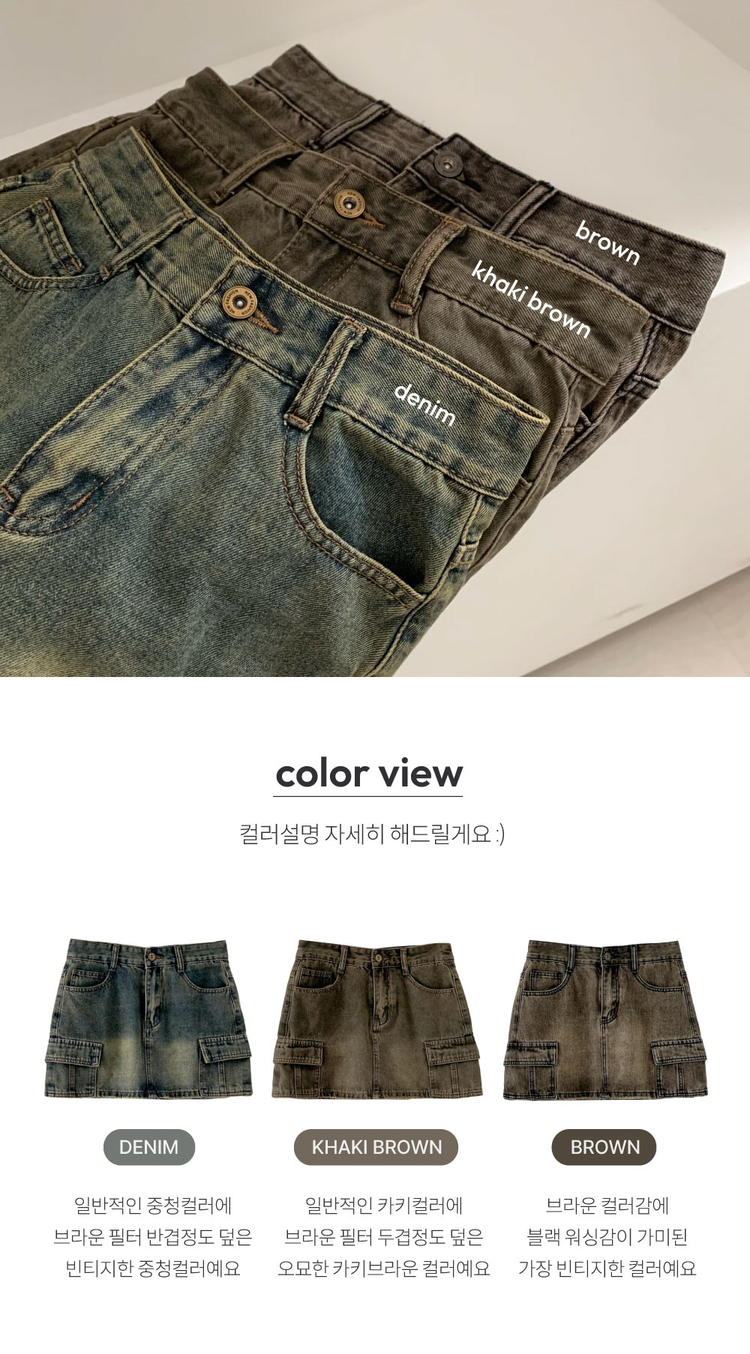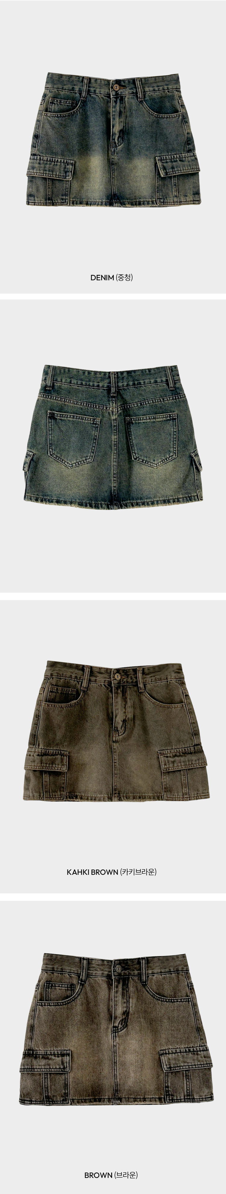 SSK19408 브라운 필터낀 듯한 색감 빈티지 카고 미니멀 데님 스커트 3color