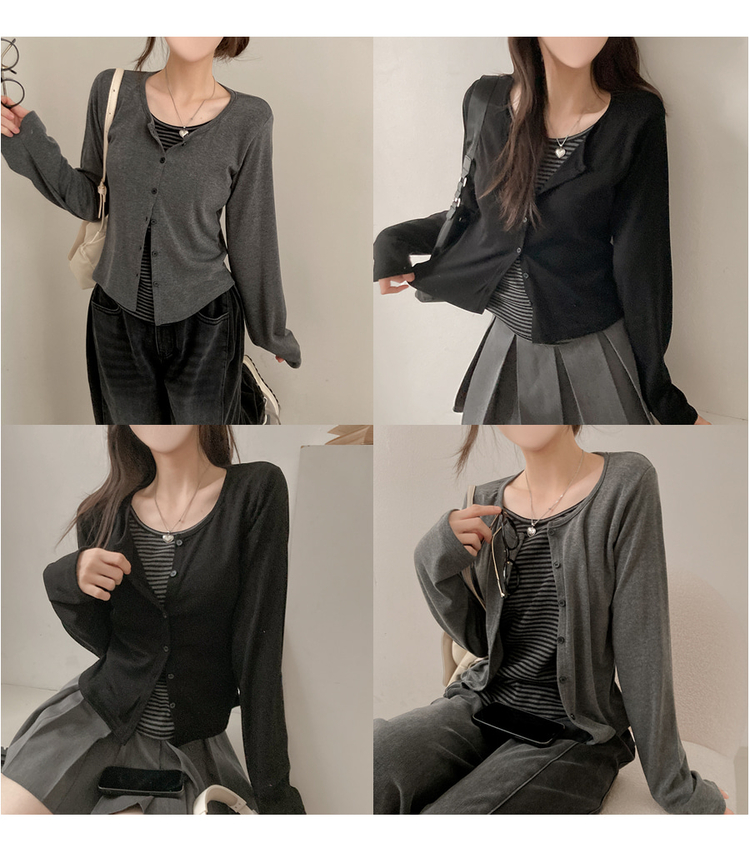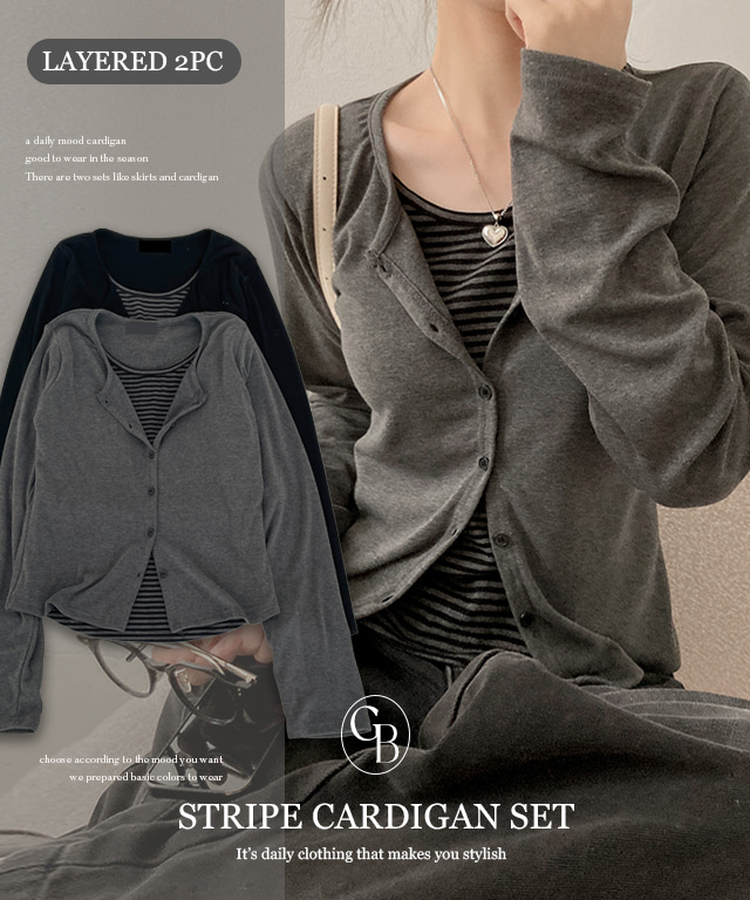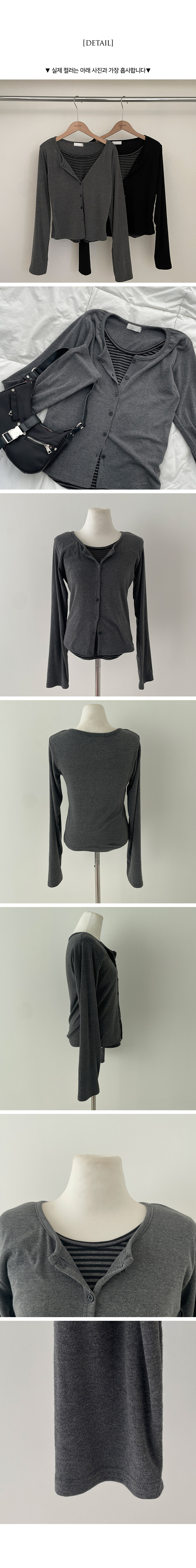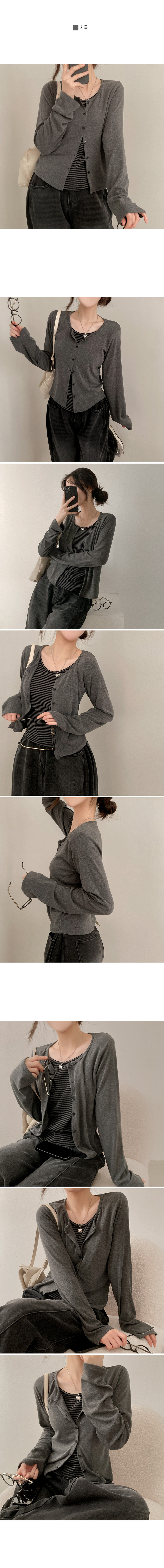 STS61528 마렛 일체형 스트라이프 단가라 레이어드 굴림 긴팔 가디건 티셔츠