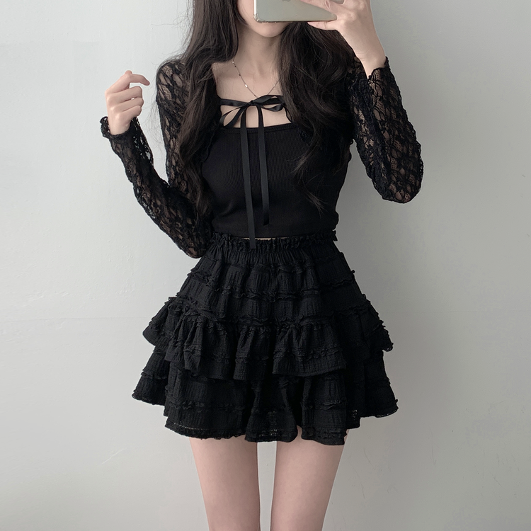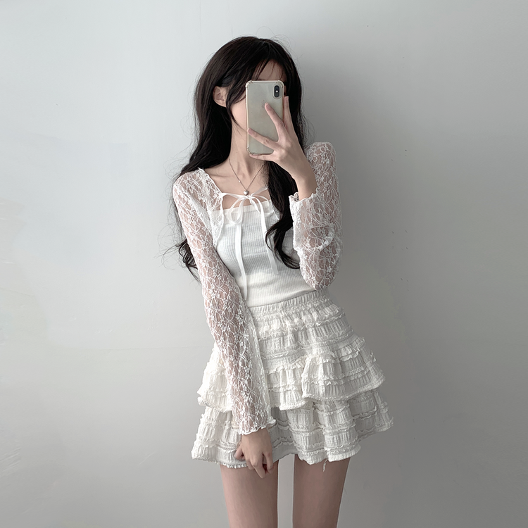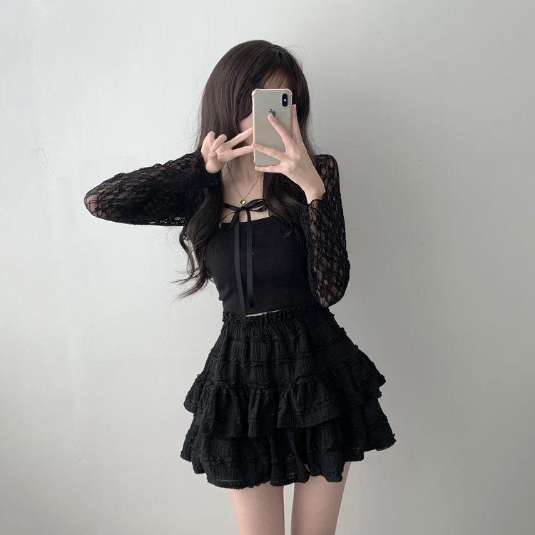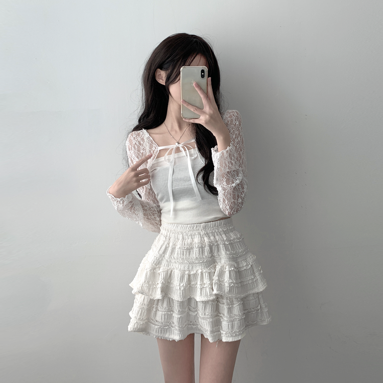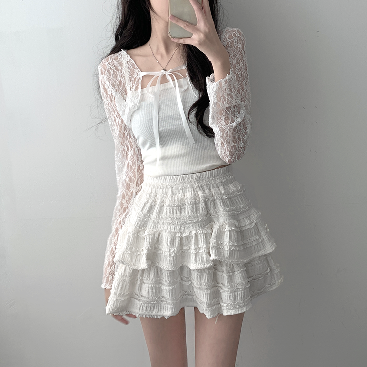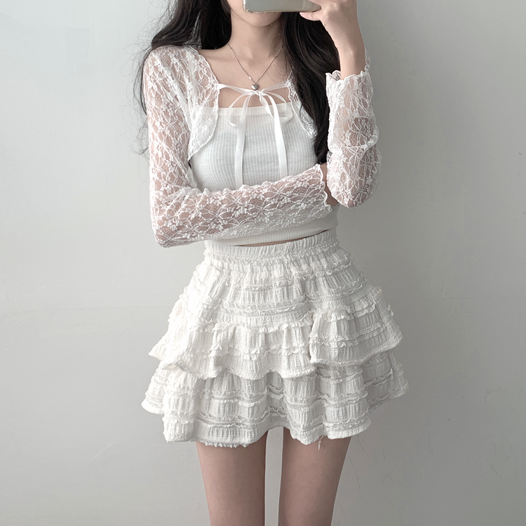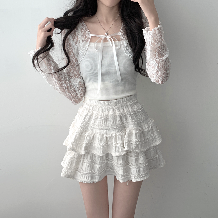 SOP27369 가디건품절 주문폭주감사세일 리본 플라워 시스루 볼레로 가디건휘핑 밴딩 캉캉 미니 스커트 투피스 A33