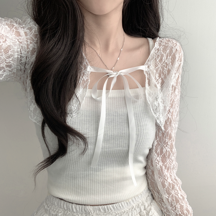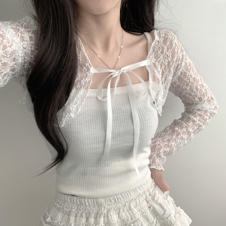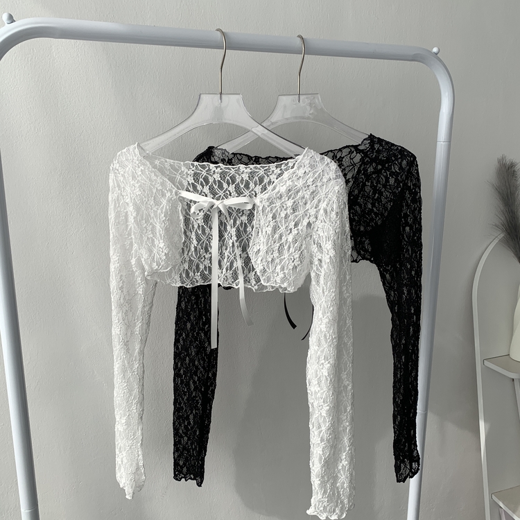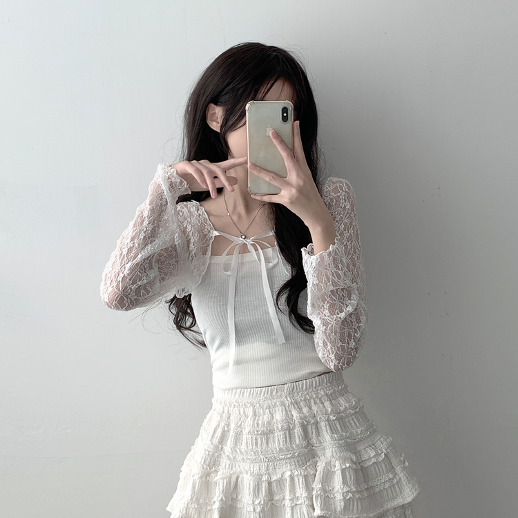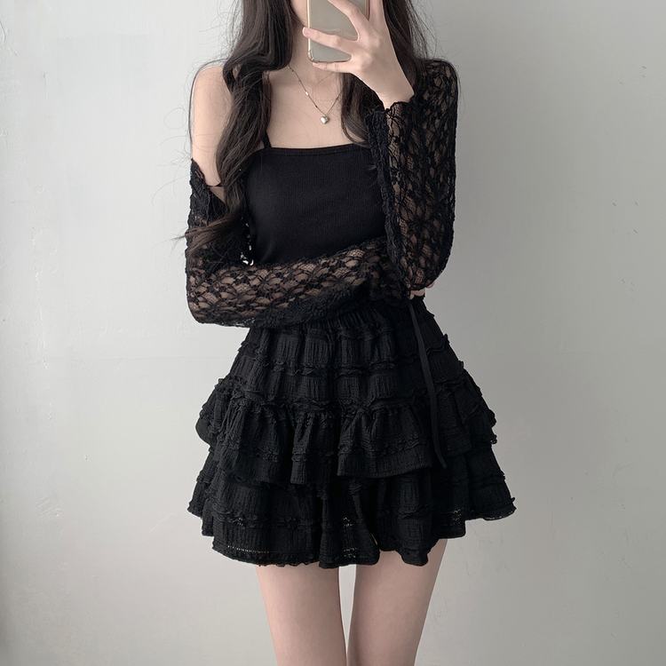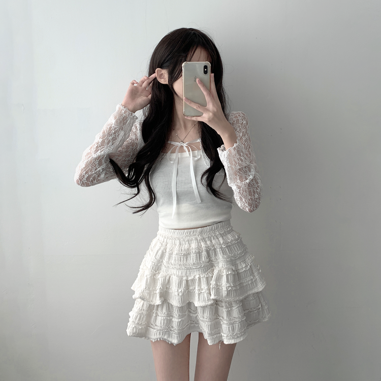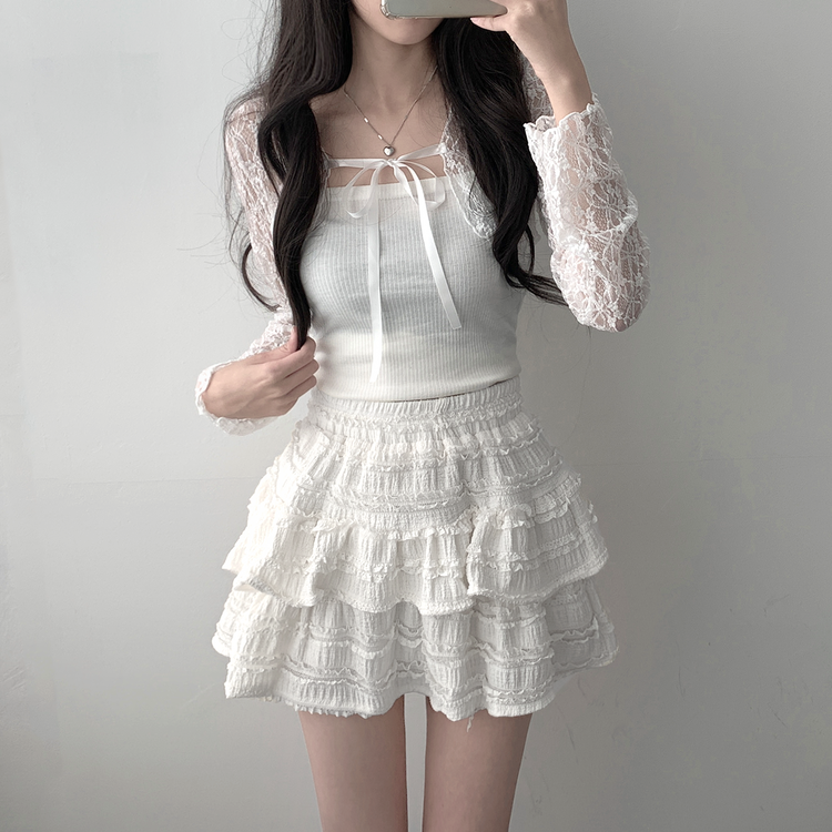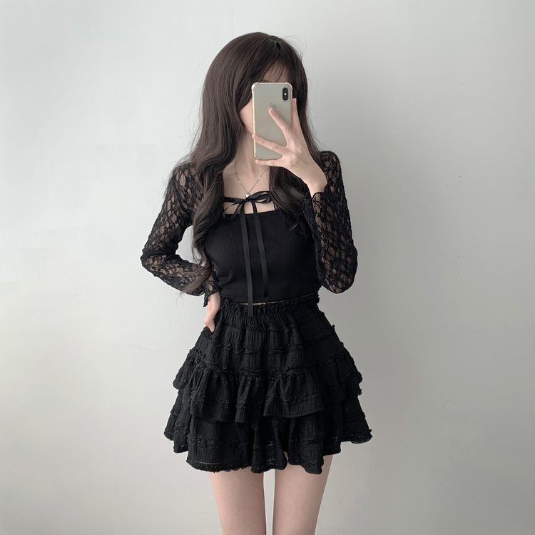 SOP27369 가디건품절 주문폭주감사세일 리본 플라워 시스루 볼레로 가디건휘핑 밴딩 캉캉 미니 스커트 투피스 A33