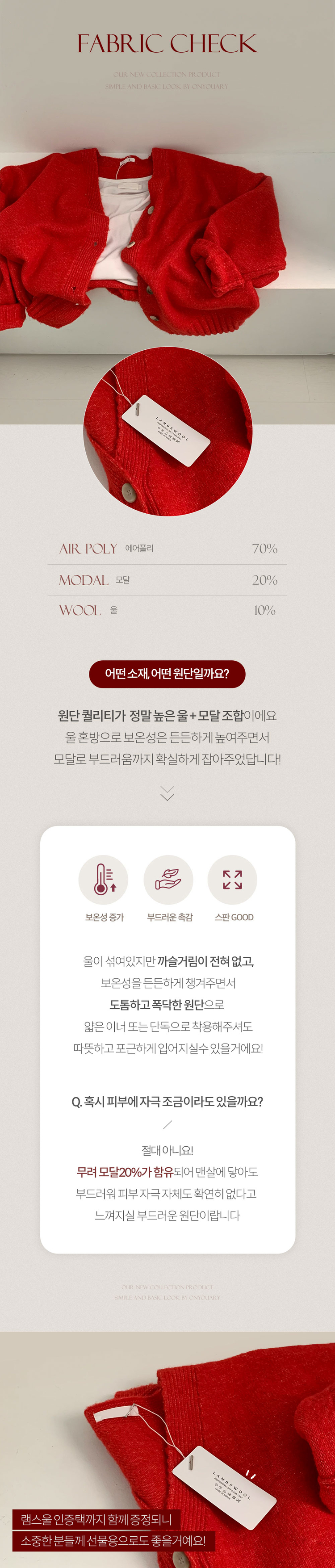 | 素材 | 에어폴리(70%), 모달(20%), 울(10%) |