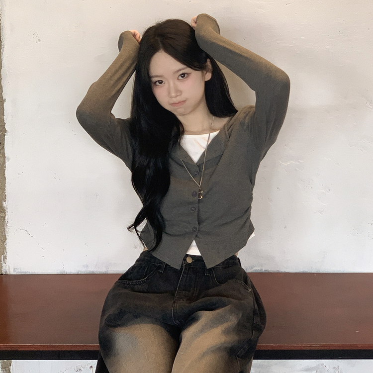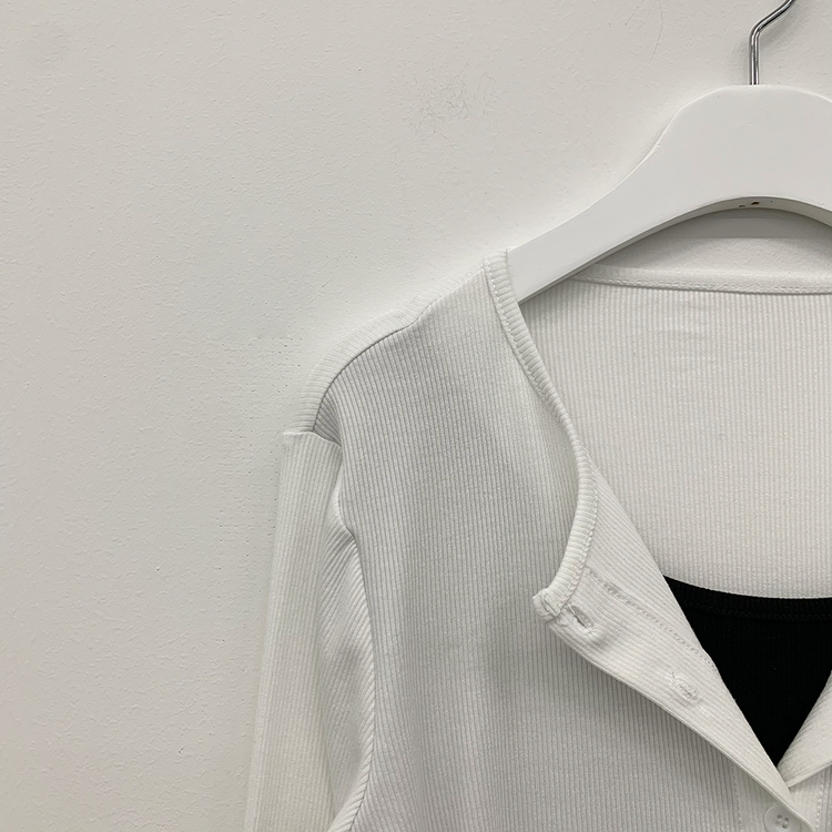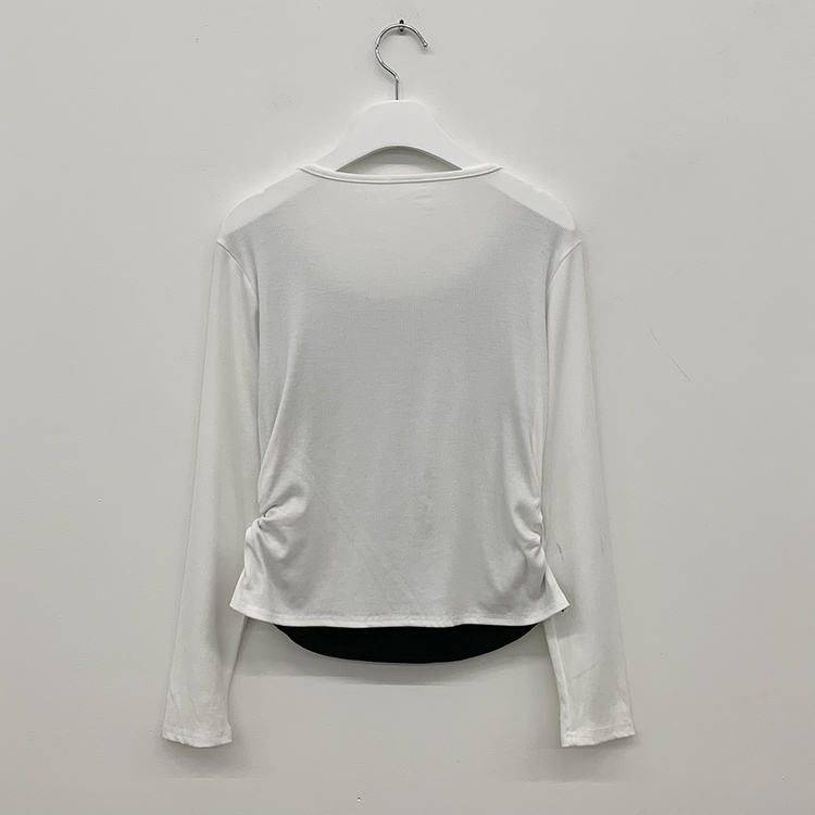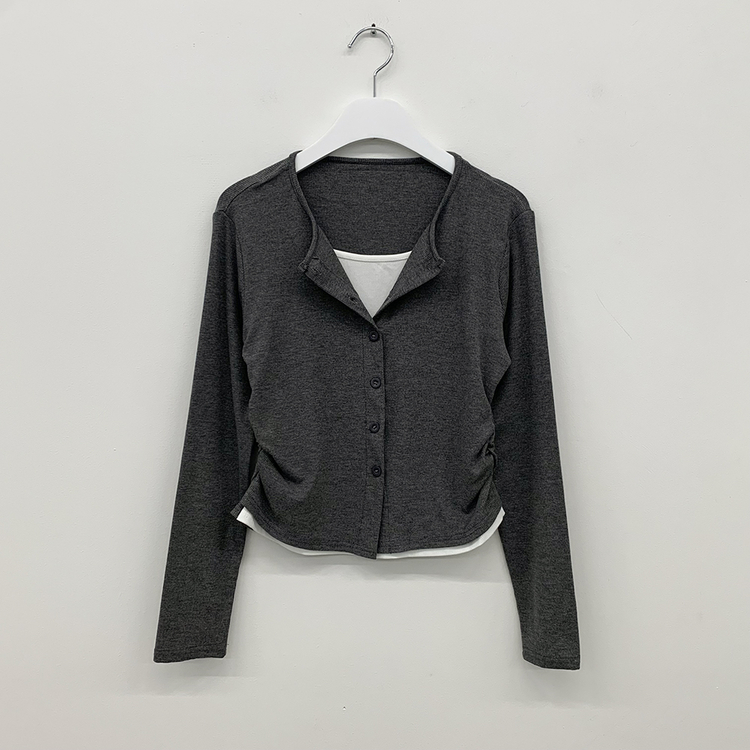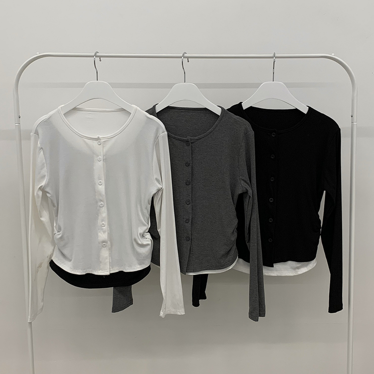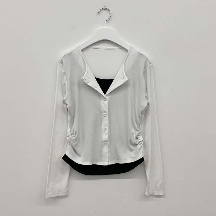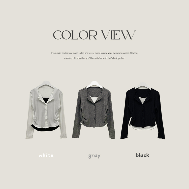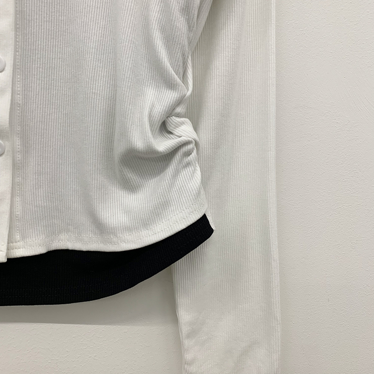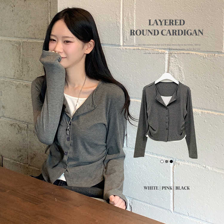 STS64149 허리셔링 배색 라운드 크롭 가디건 긴팔티셔츠