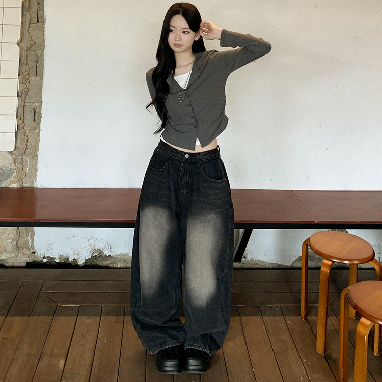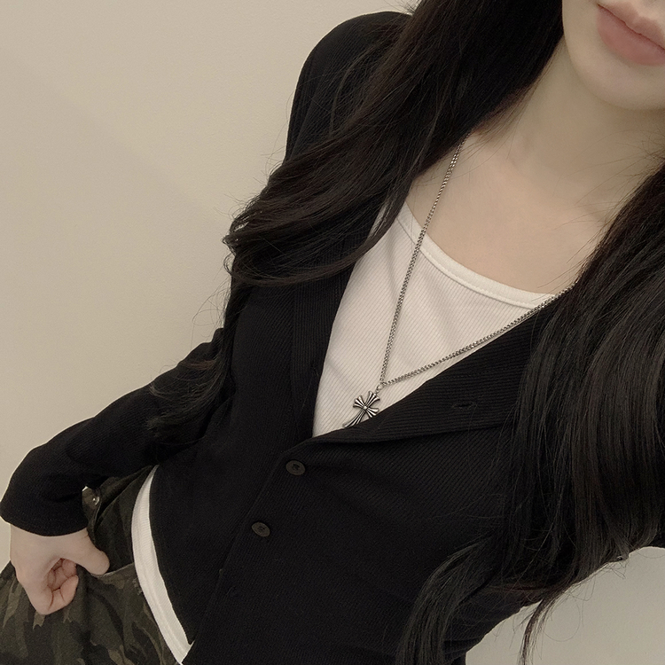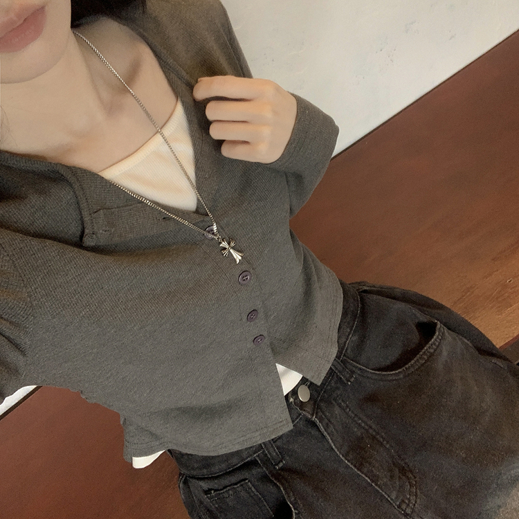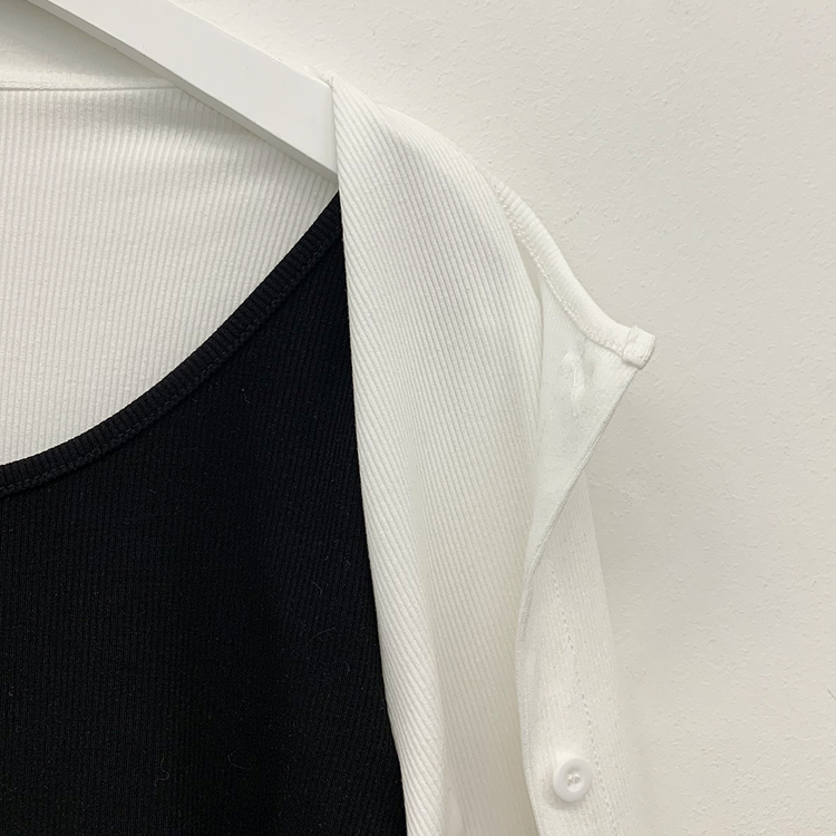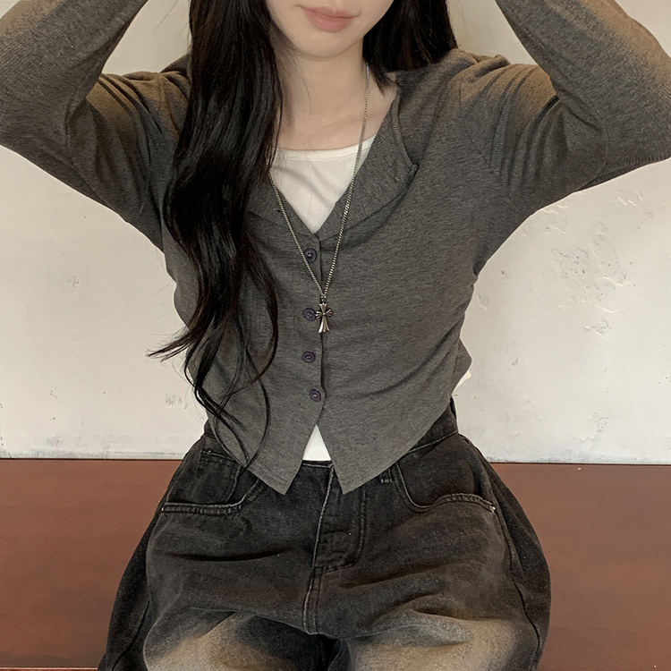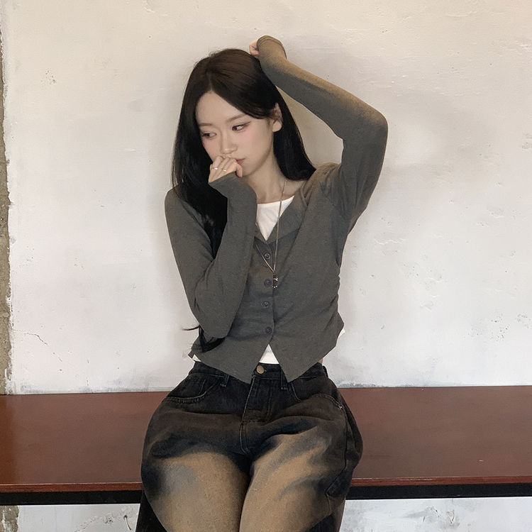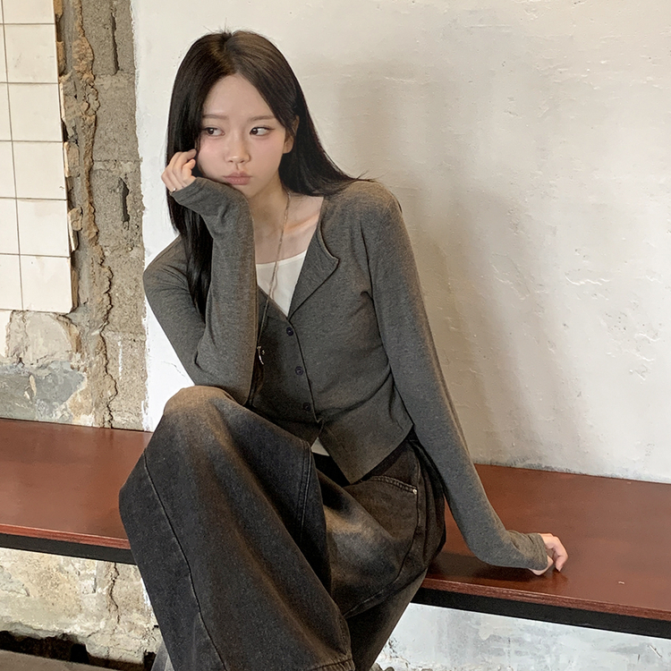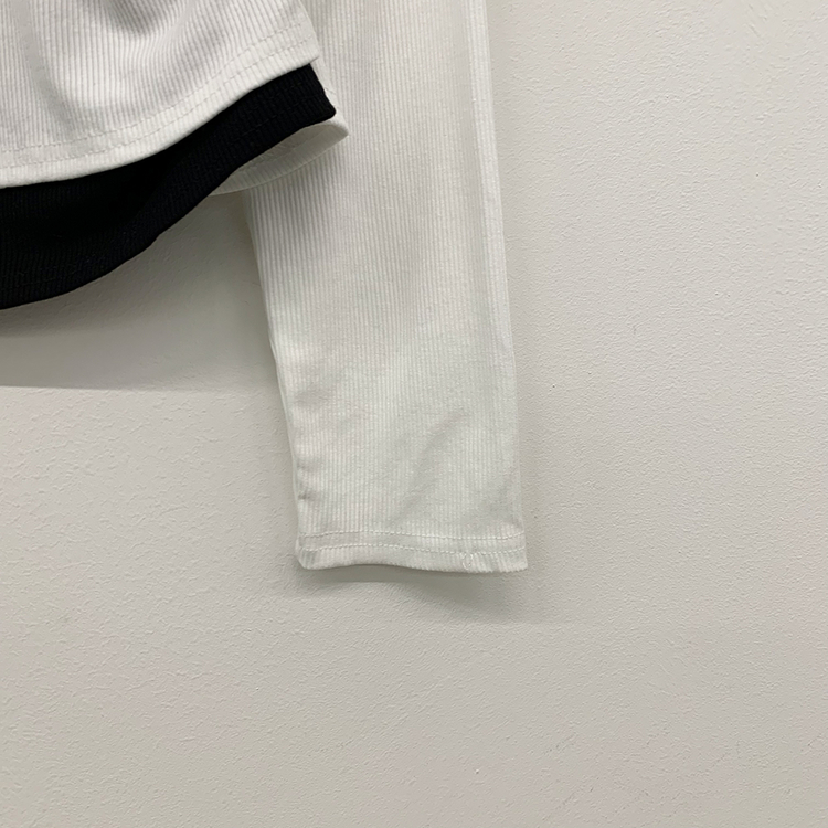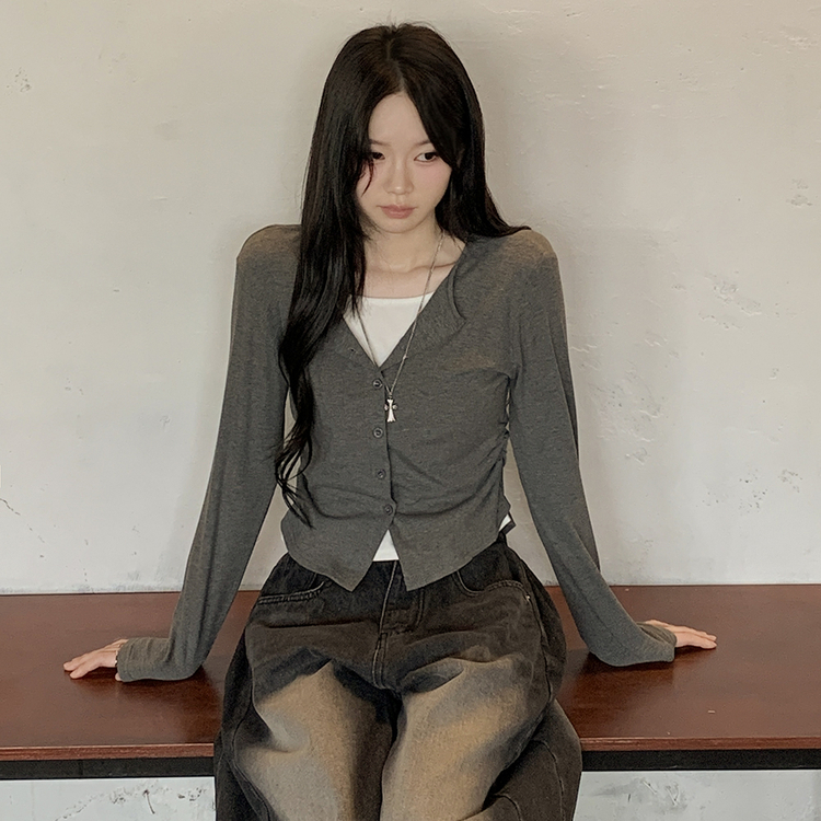 STS64149 허리셔링 배색 라운드 크롭 가디건 긴팔티셔츠