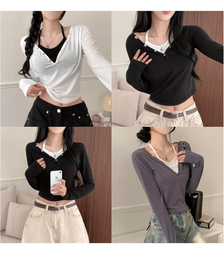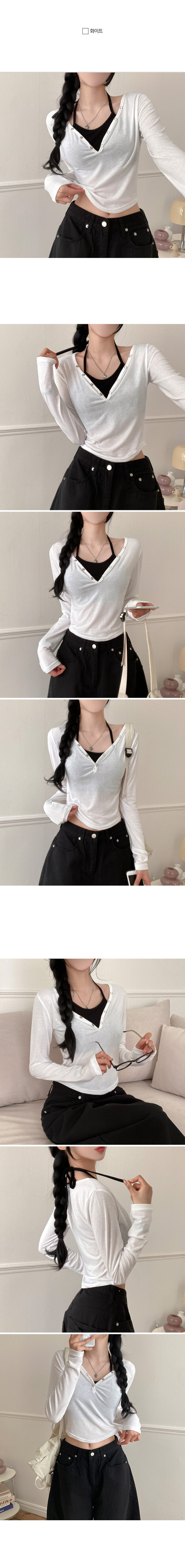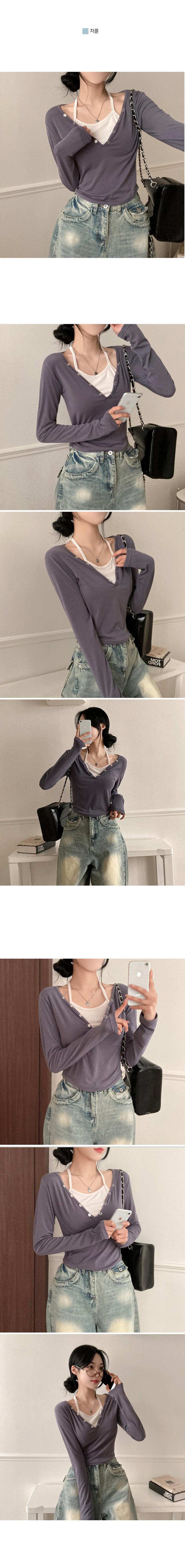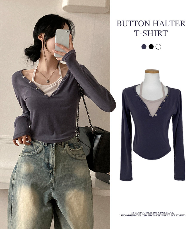 STS64518 브릿 배색 스냅버튼 홀터넥 일체형 긴팔 티셔츠