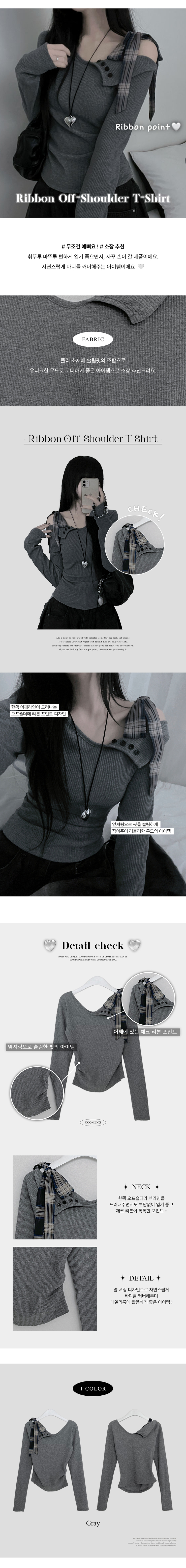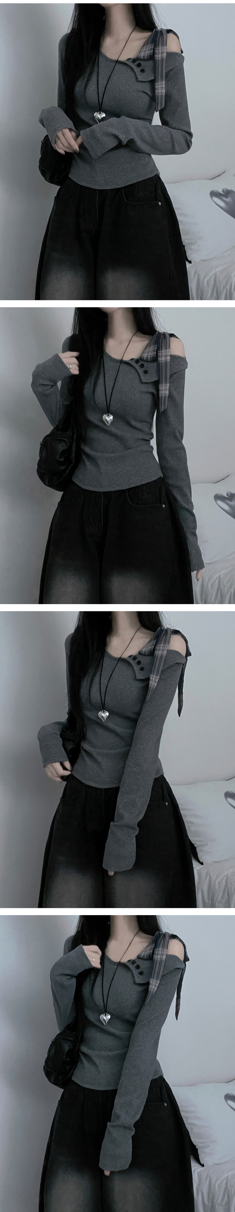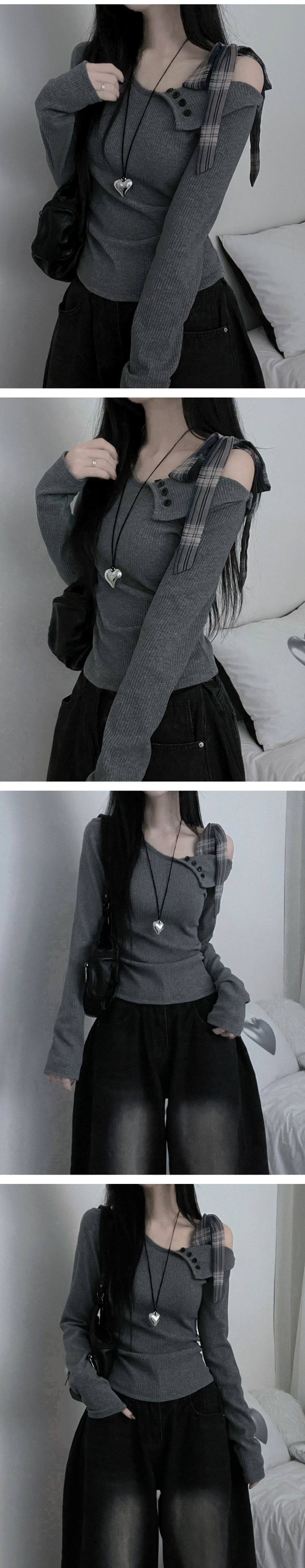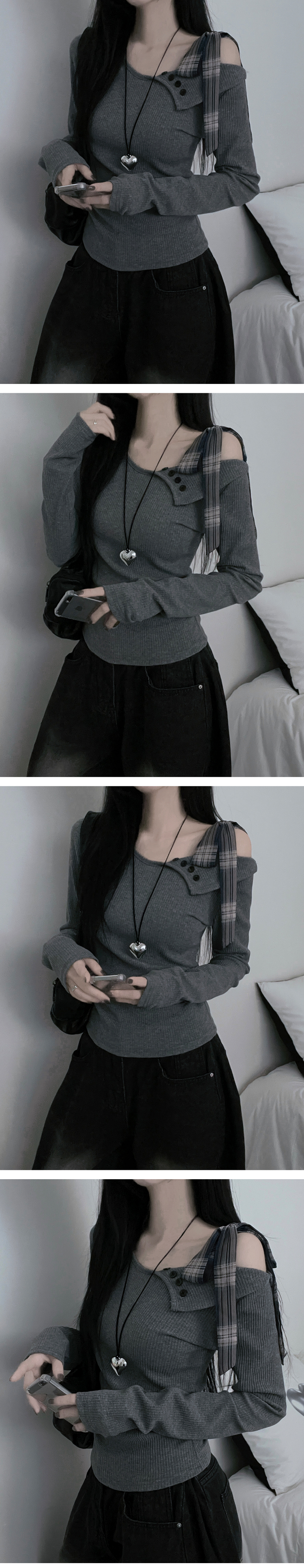 STS64755 체크리본끈버튼오프숄더옆셔링슬림긴팔티