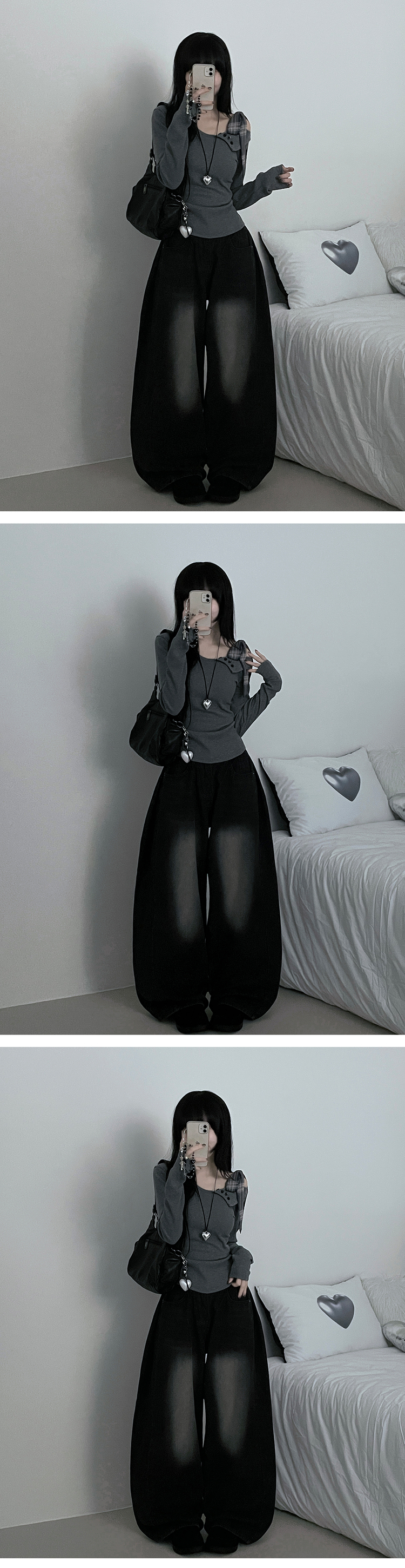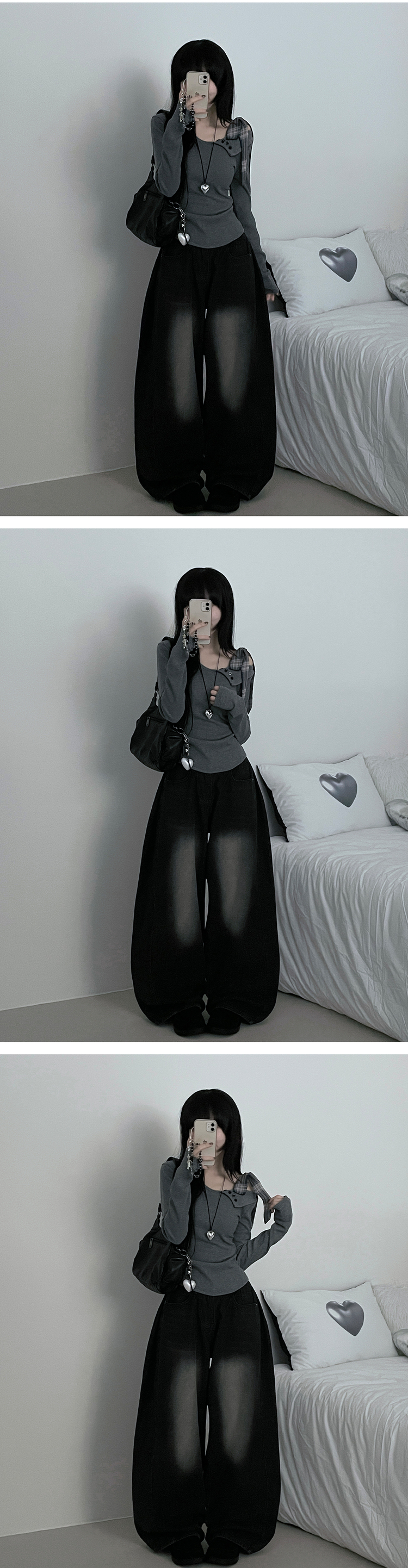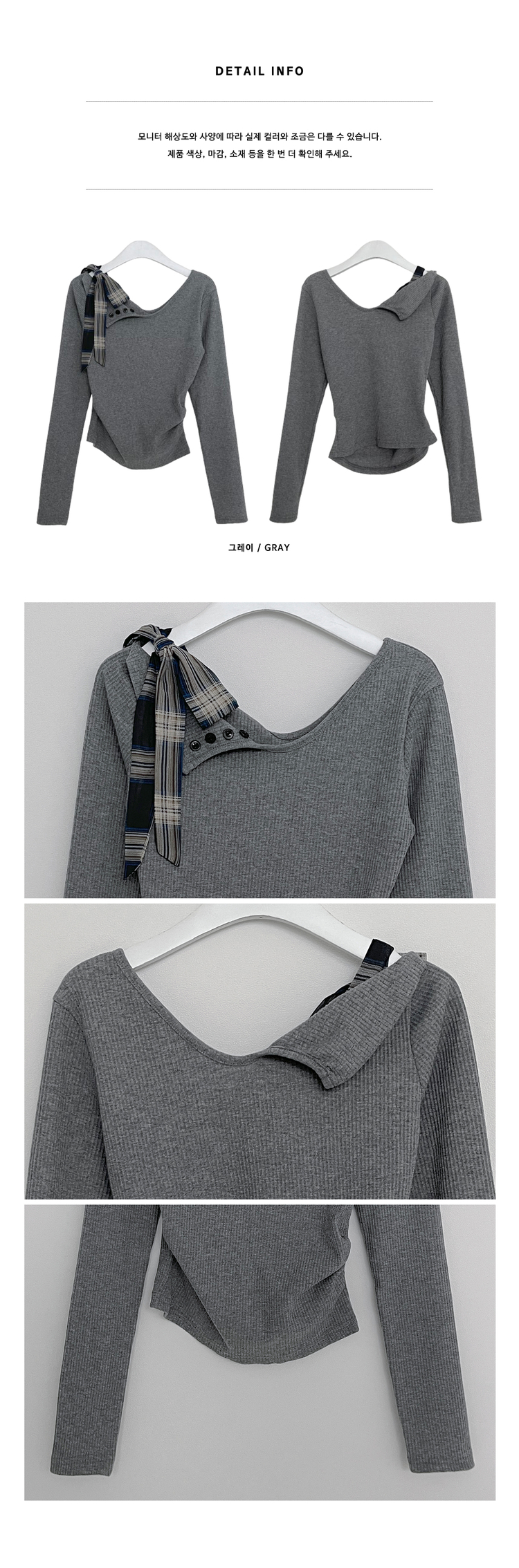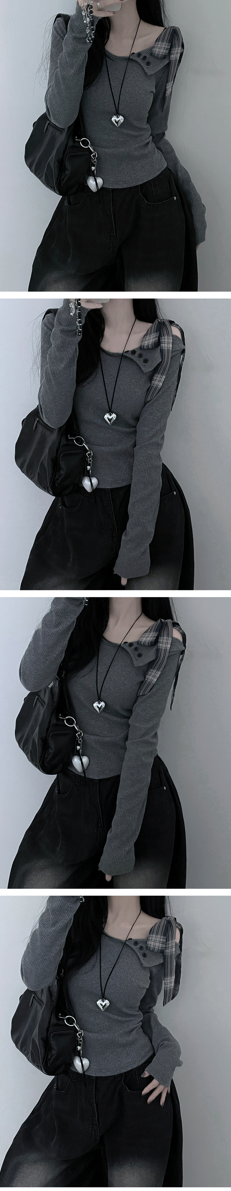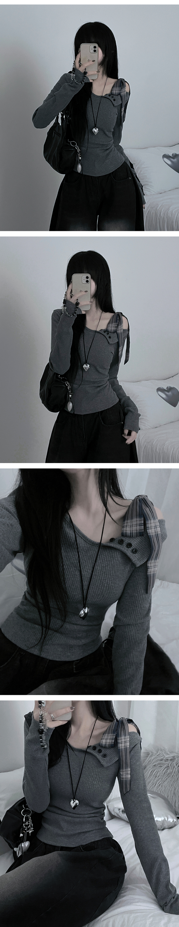 STS64755 체크리본끈버튼오프숄더옆셔링슬림긴팔티