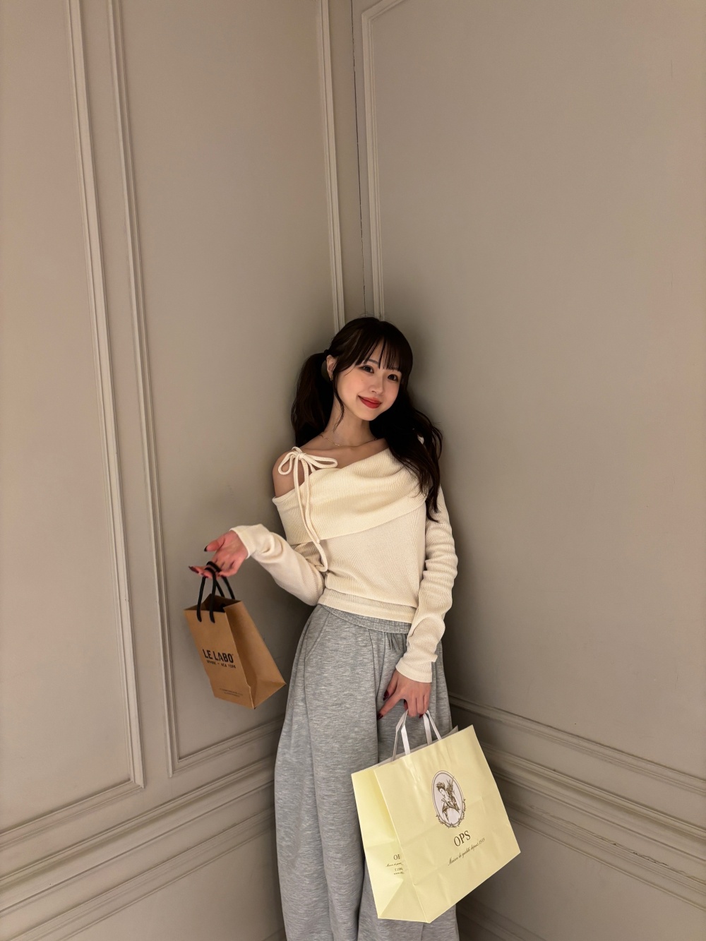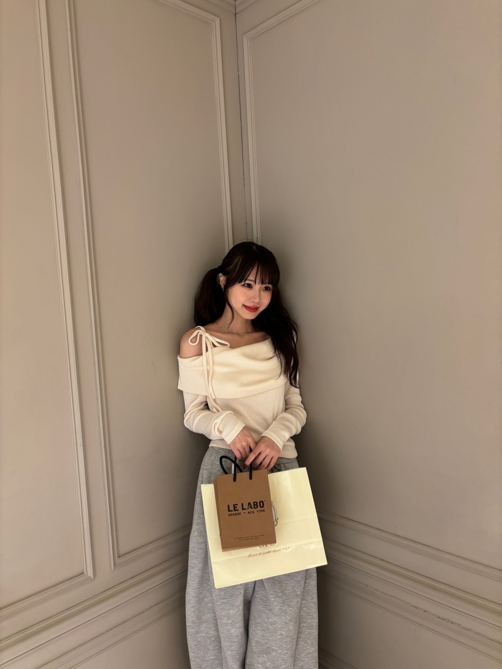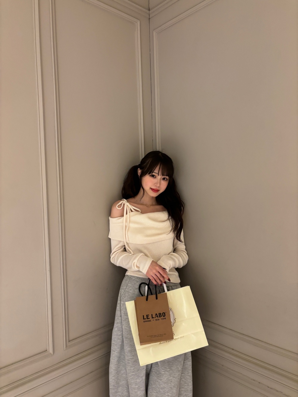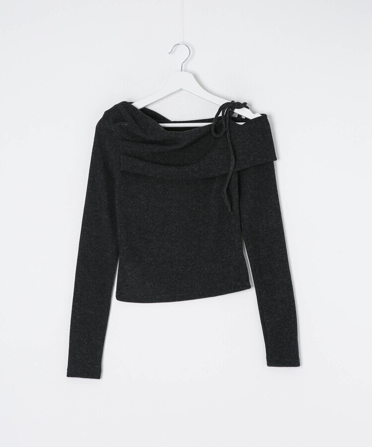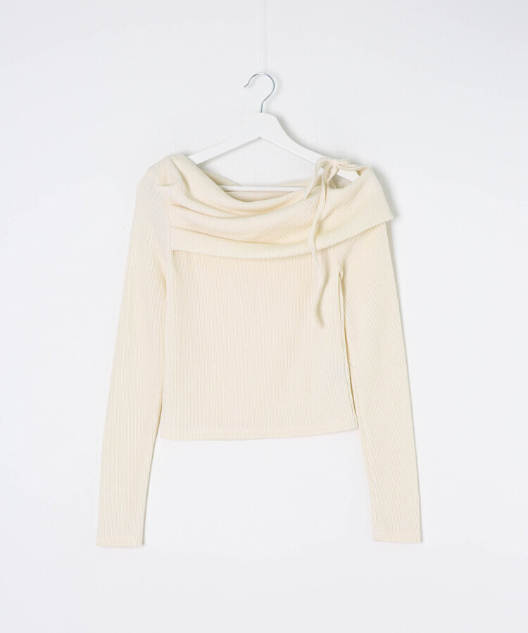 STS64801 리본 스트랩 골지 오프숄더 티셔츠