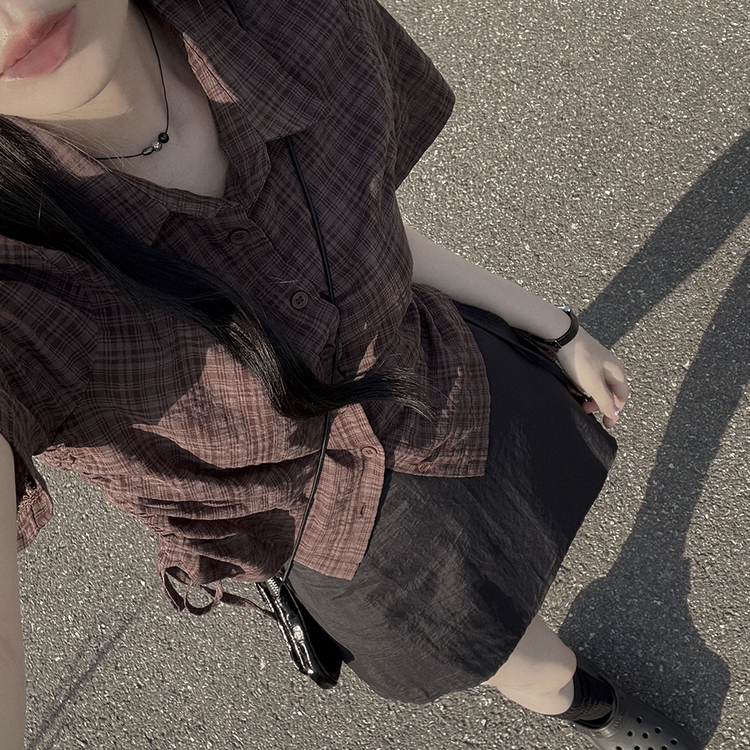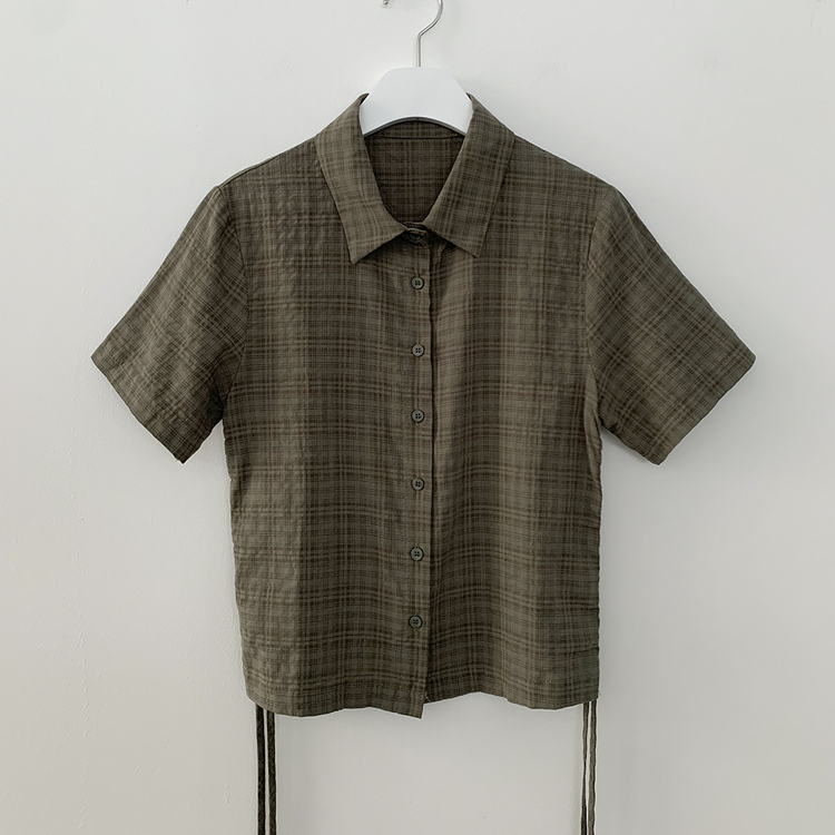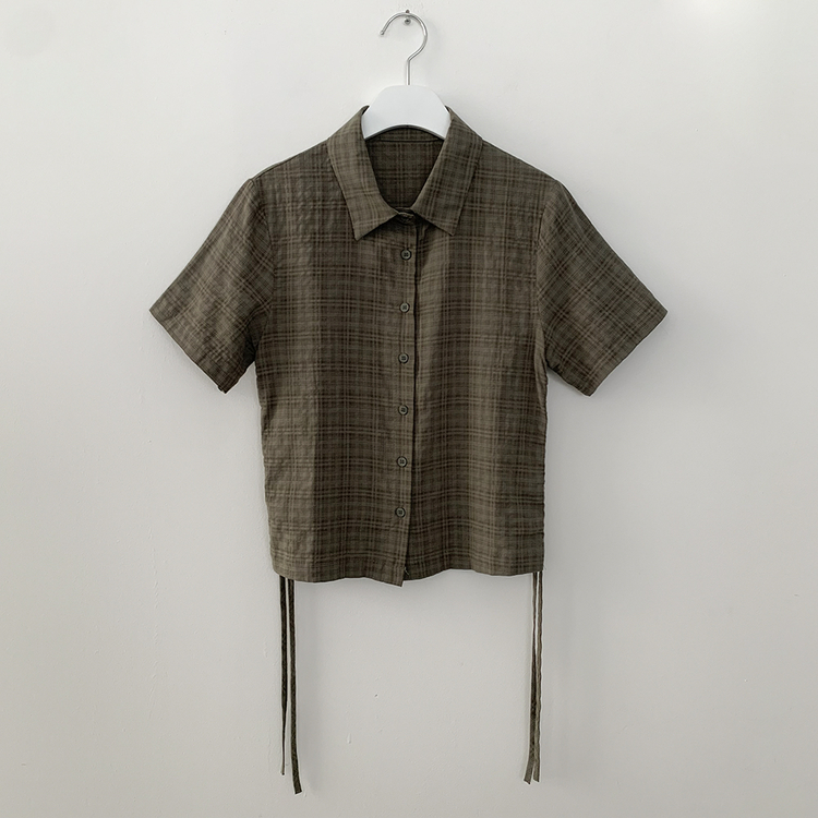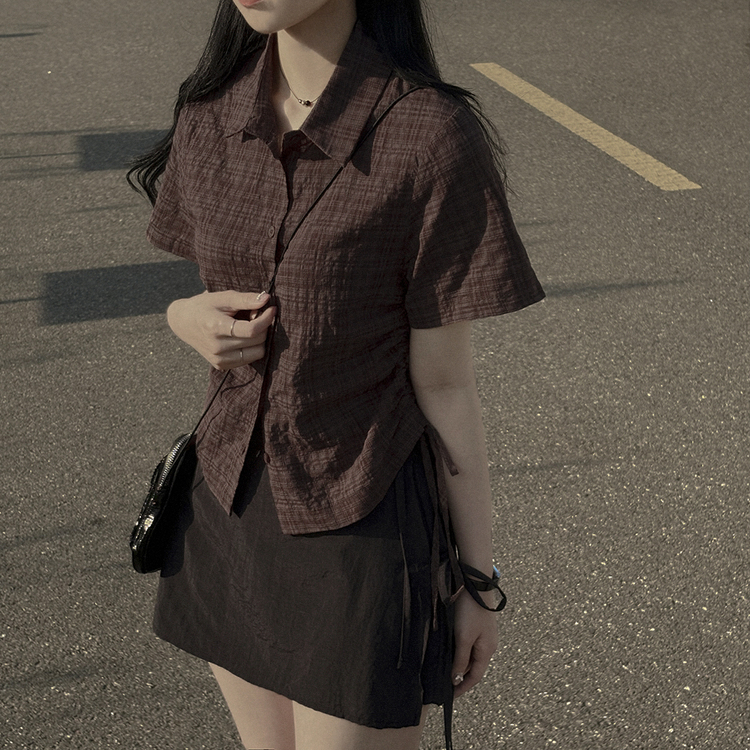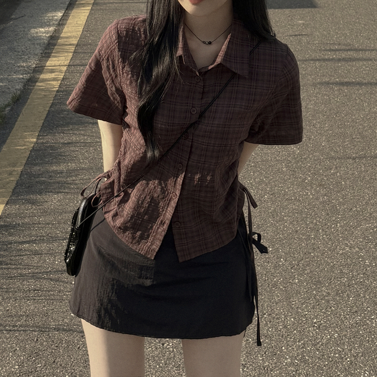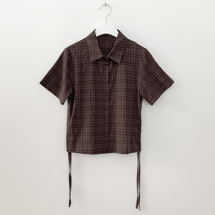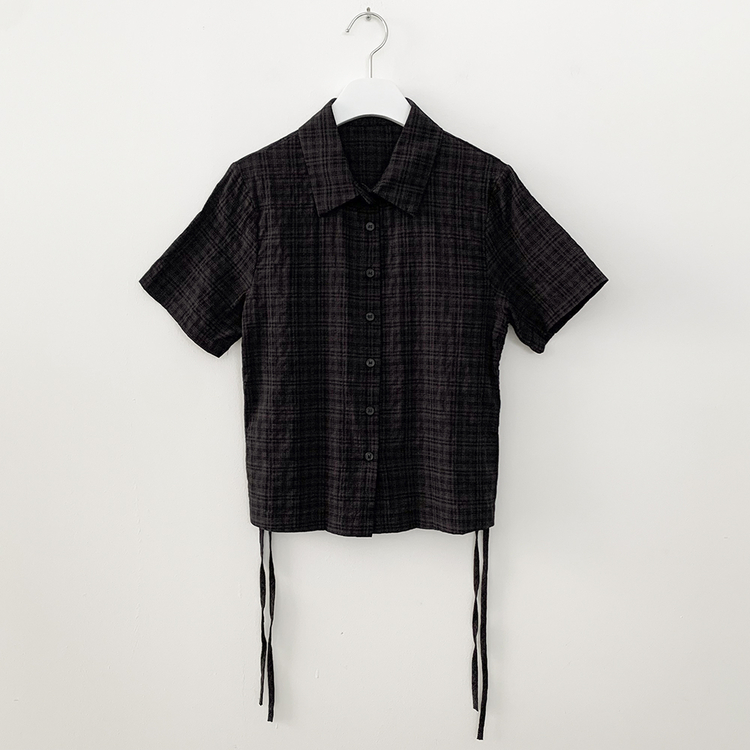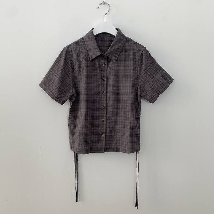 SBS26277 너드러블리 옆셔링 스트링 무채색 버건디 여름 반팔 크롭 체크셔츠 남방