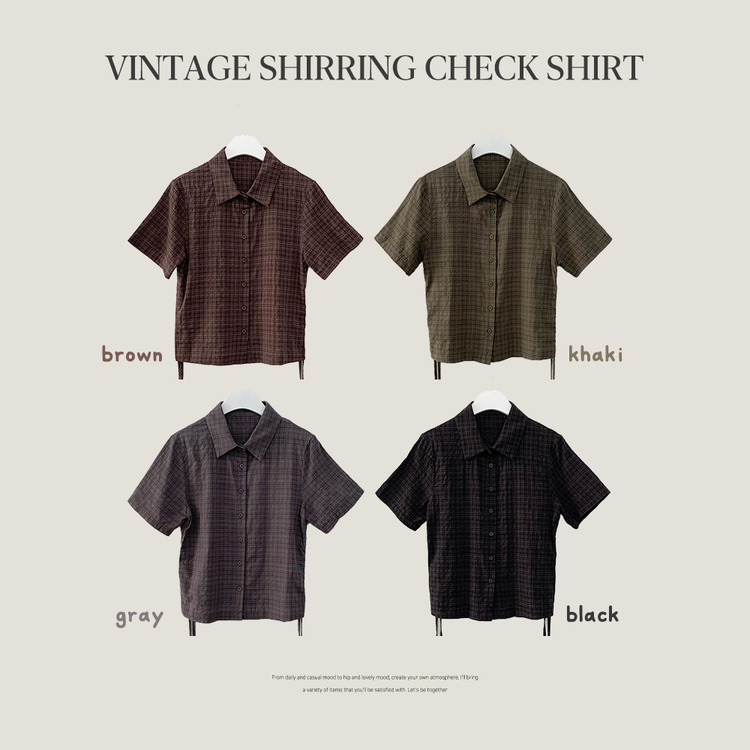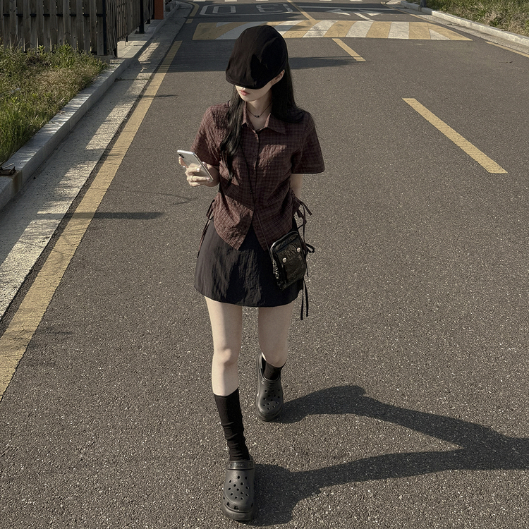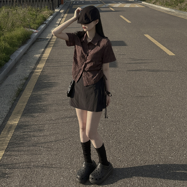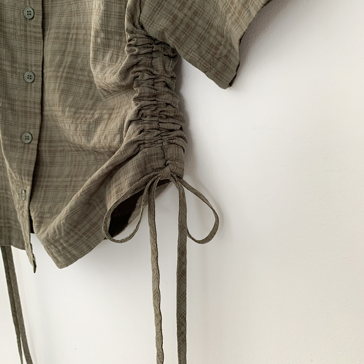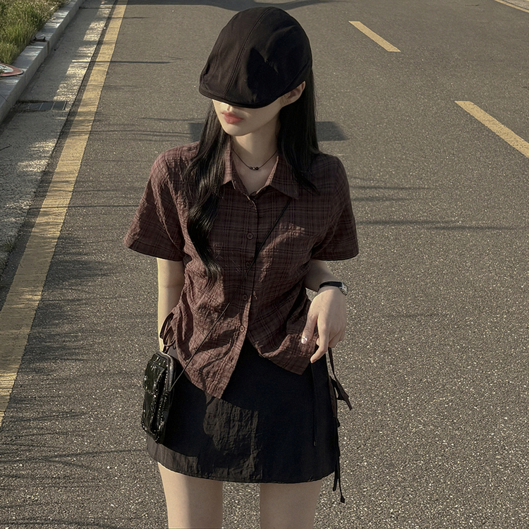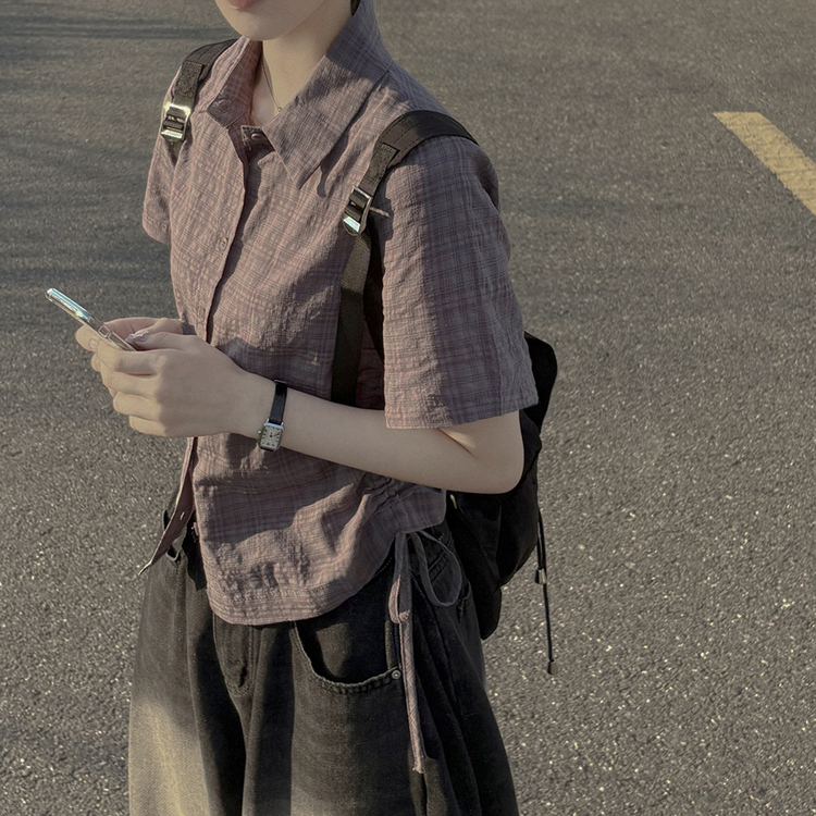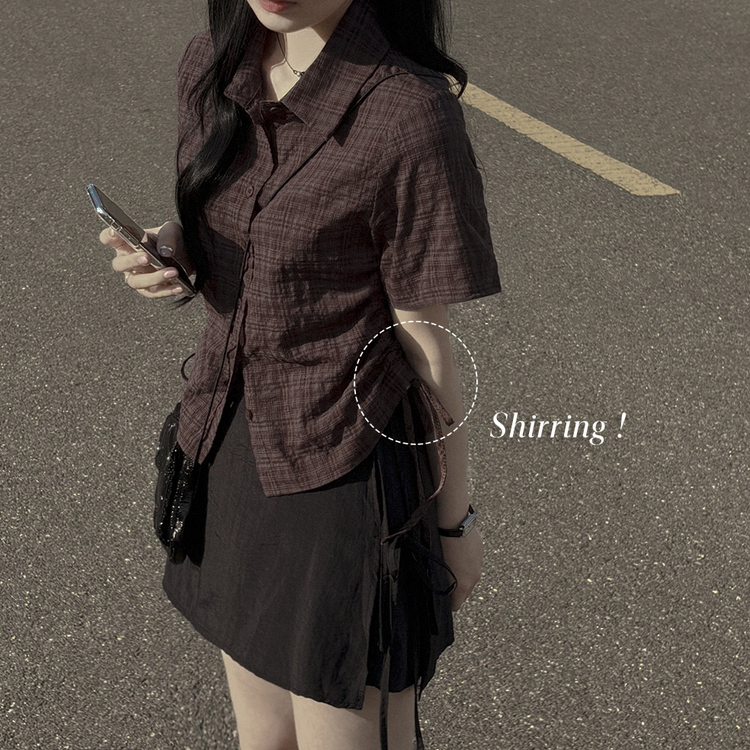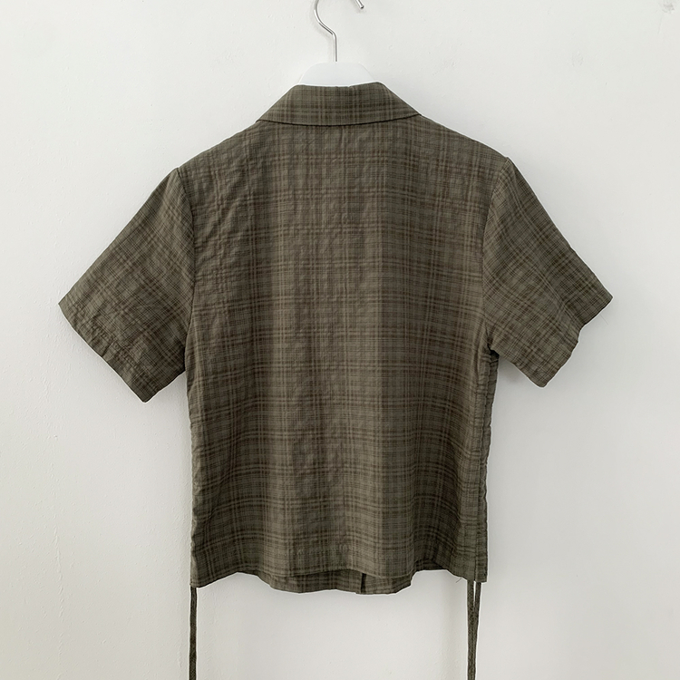 SBS26277 너드러블리 옆셔링 스트링 무채색 버건디 여름 반팔 크롭 체크셔츠 남방