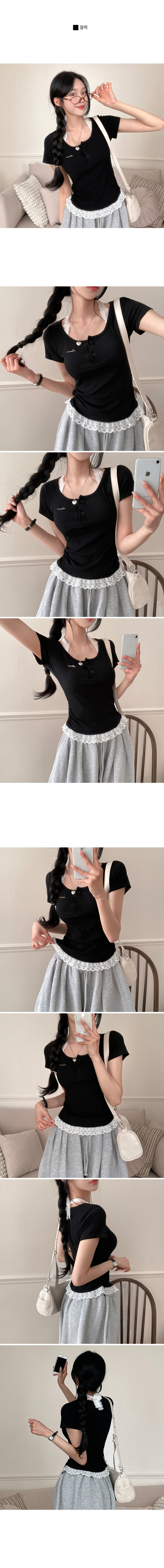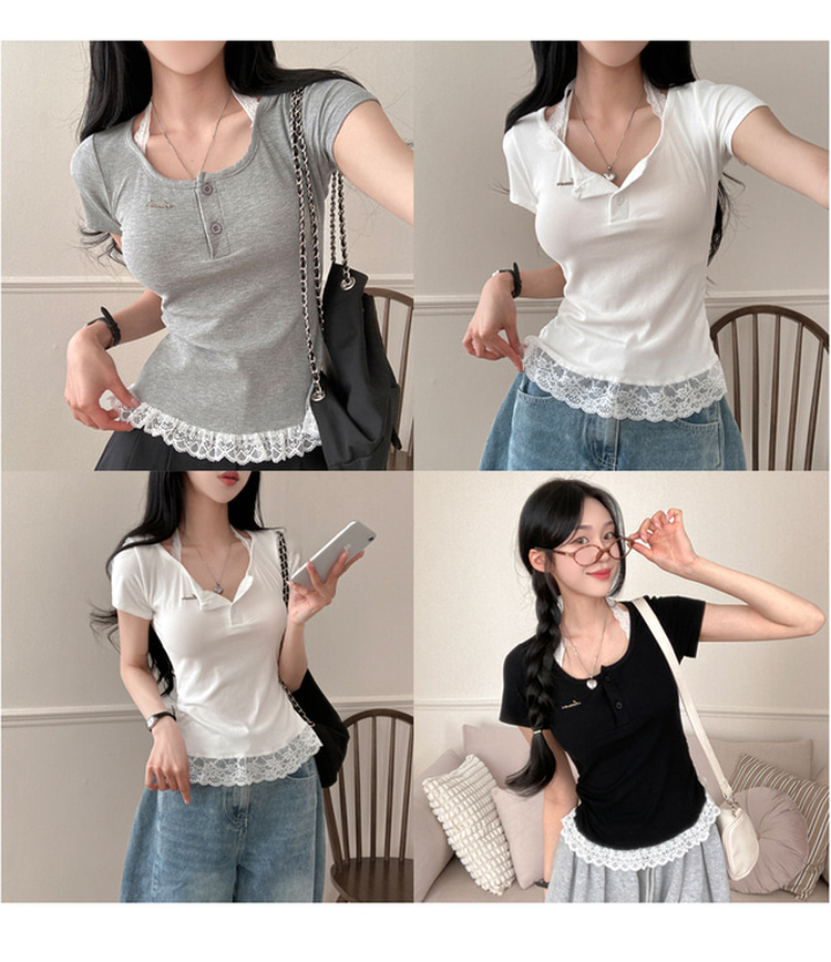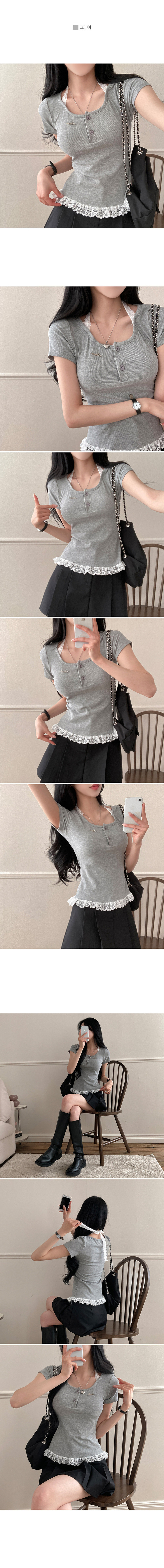 STS66603 쥬시 레이스 홀터 실퍼 패치 프릴 반팔 티셔츠