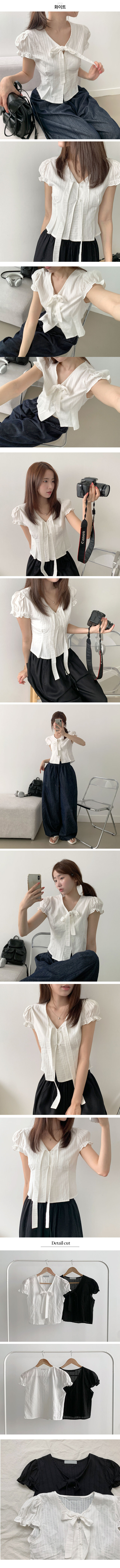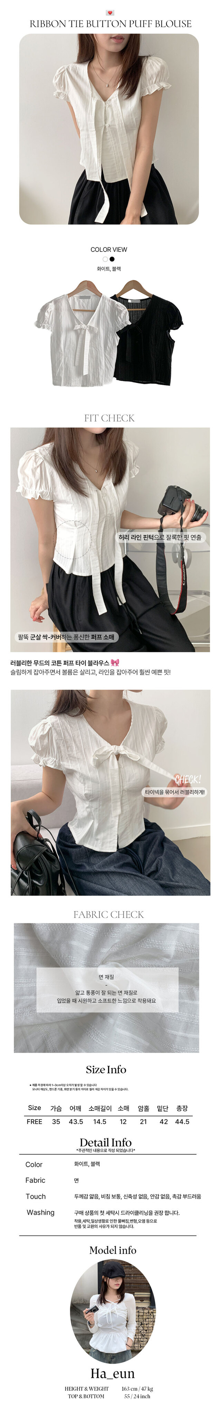SBS27006 뮤스 코튼 타이 일체형 버튼 허리 핀턱 퍼프 반팔 블라우스