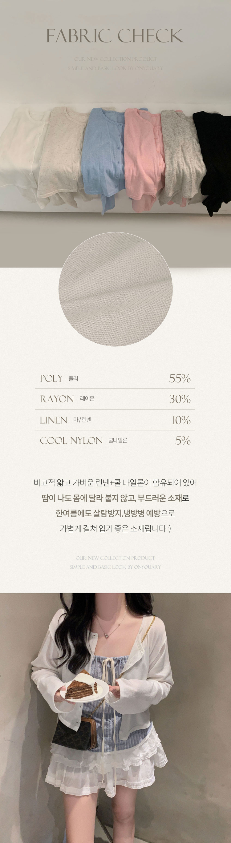 | 素材 | 폴리(55%), 레이온(30%), 쿨나일론(5%), 마,린넨(10%) |