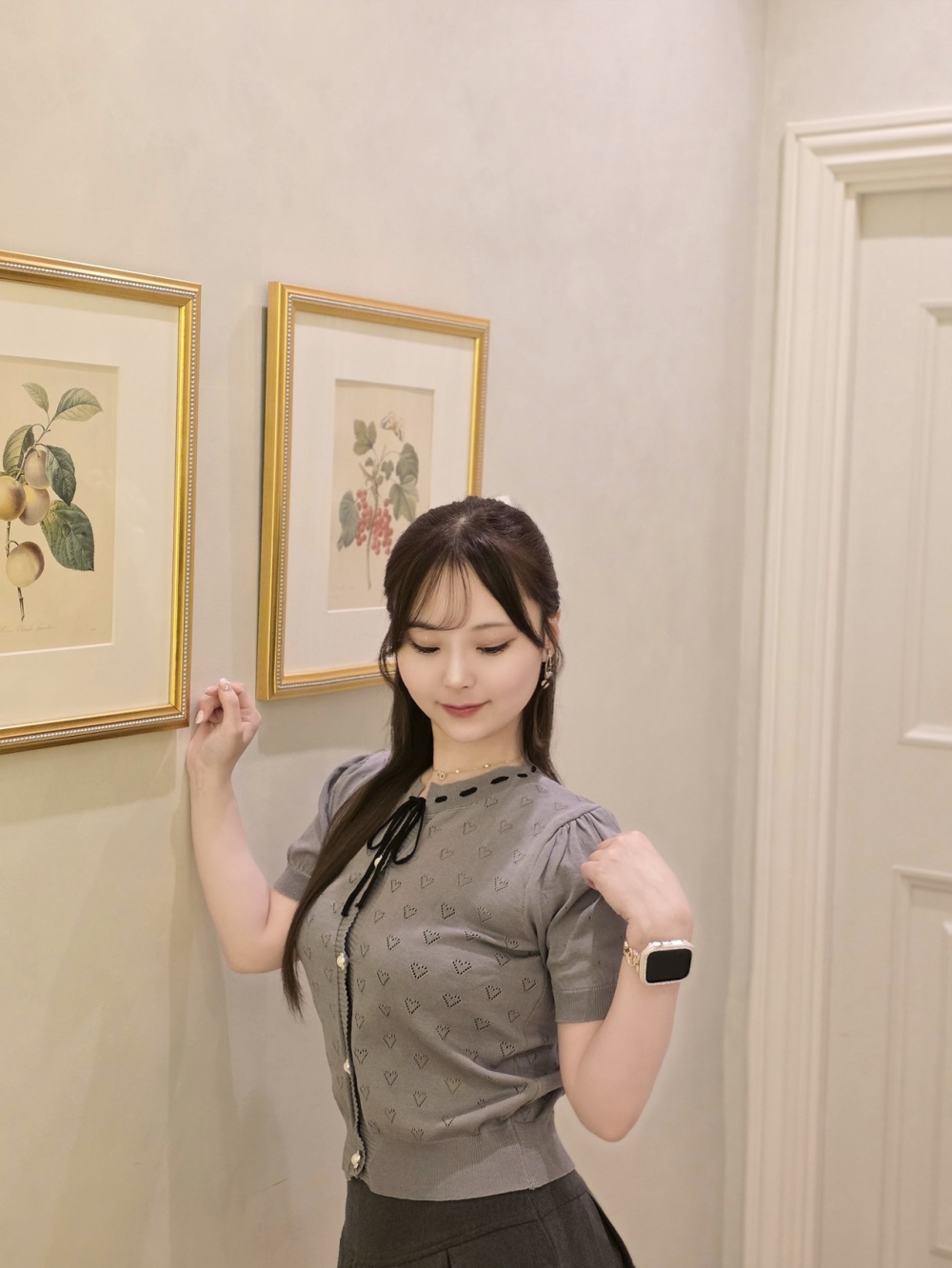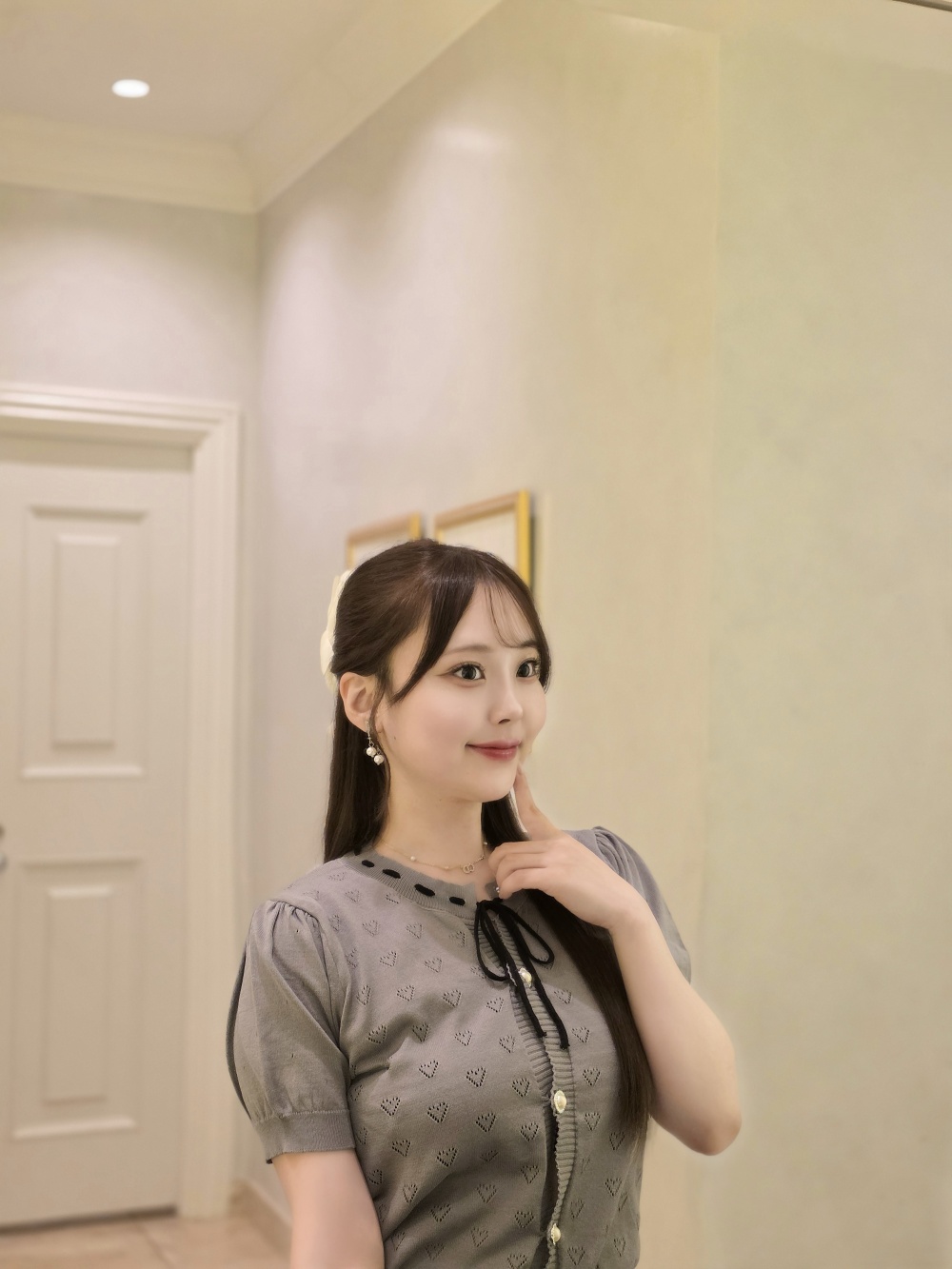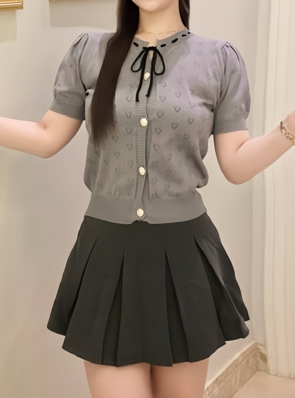 SNT31576 하트 펀칭 리본 반팔 가디건