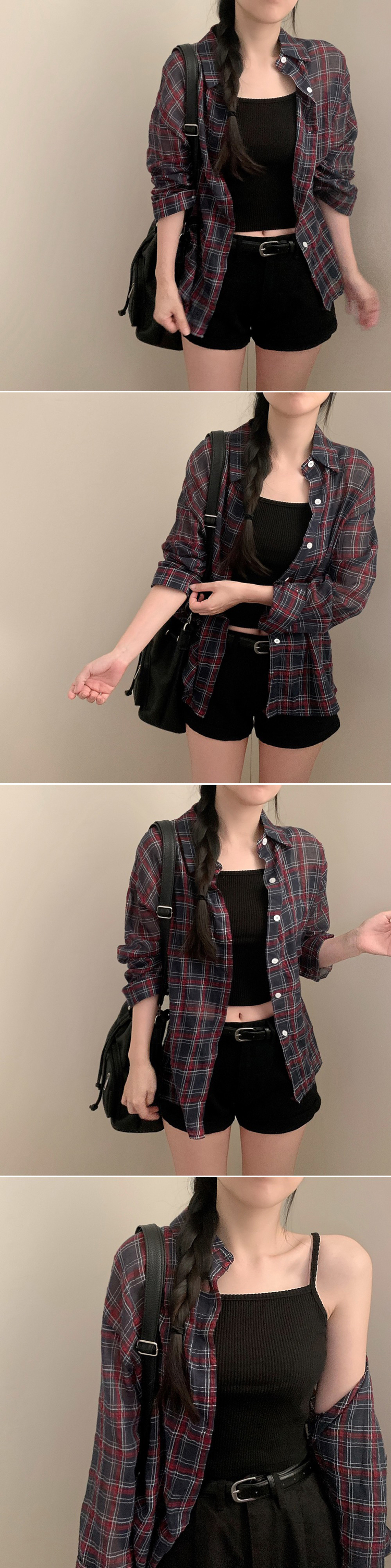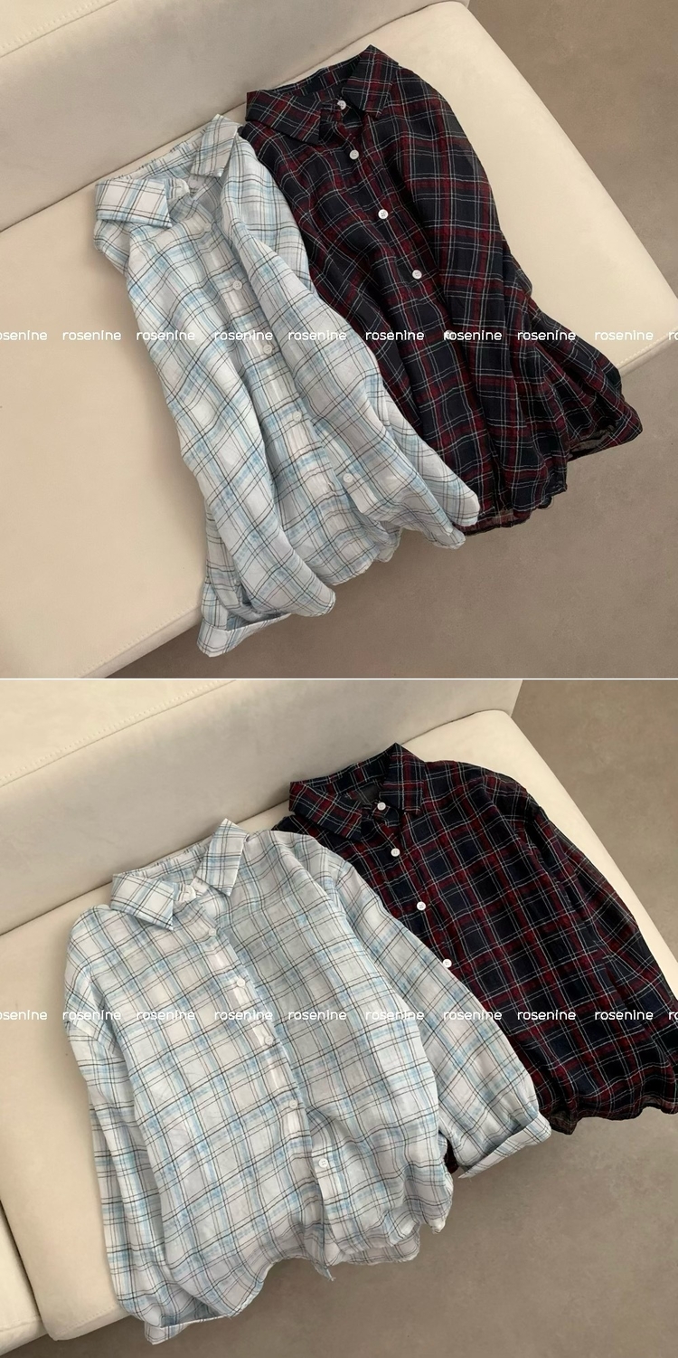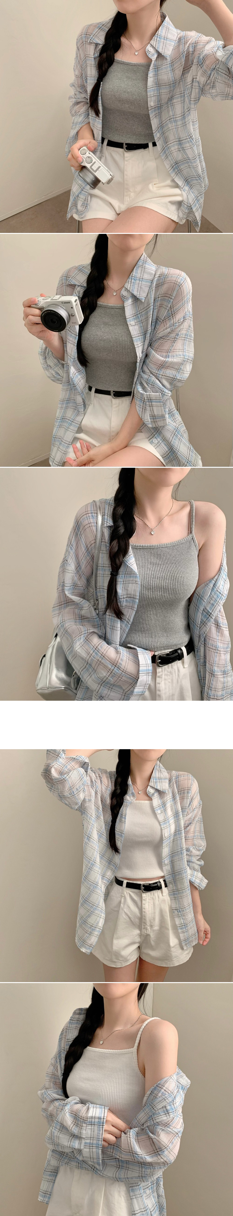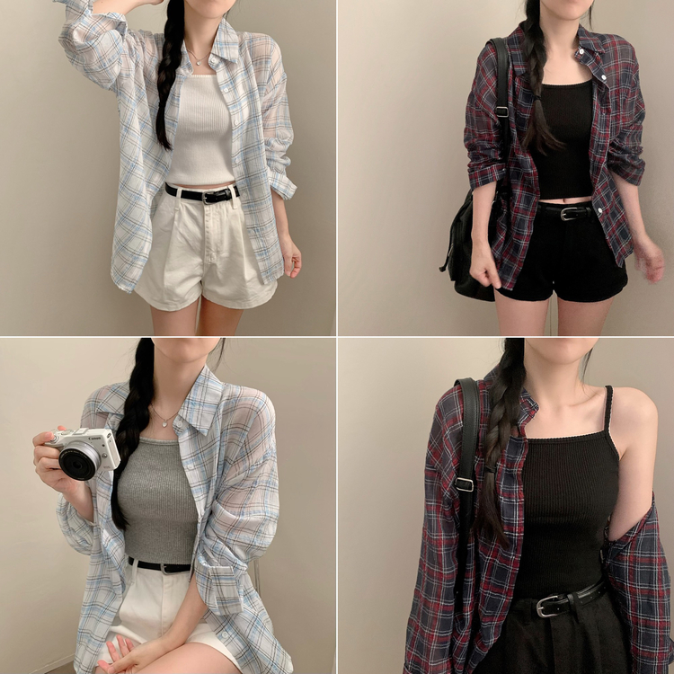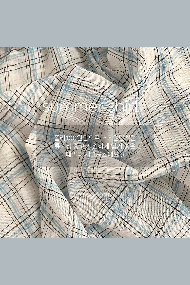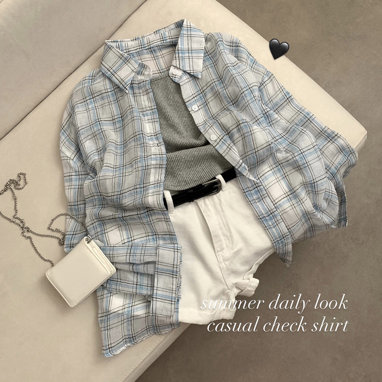 SBS27943 하늘 긴팔 체크 셔츠 루즈핏 상의 남방 시스루