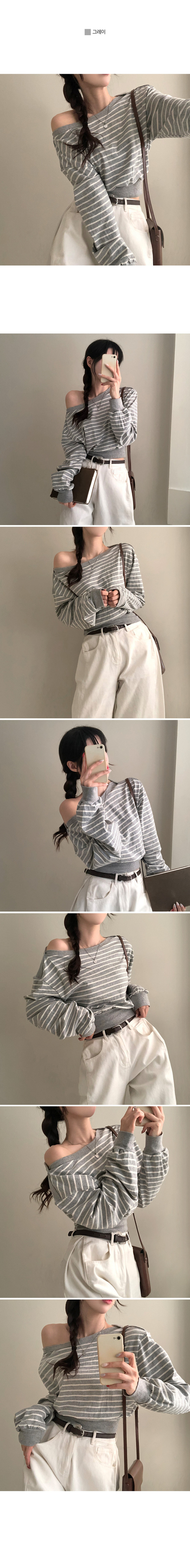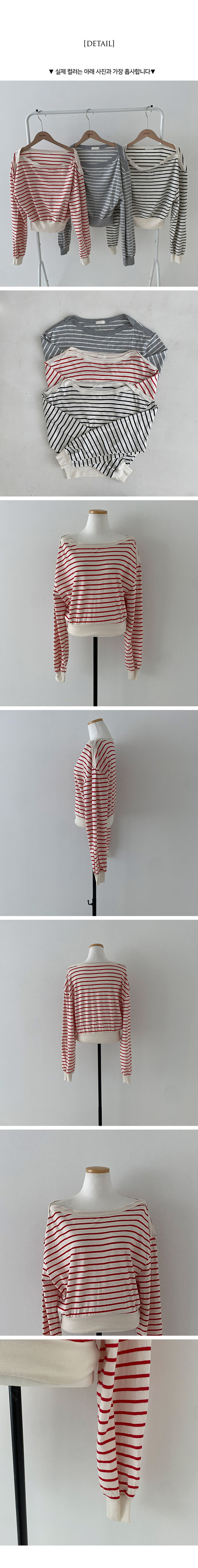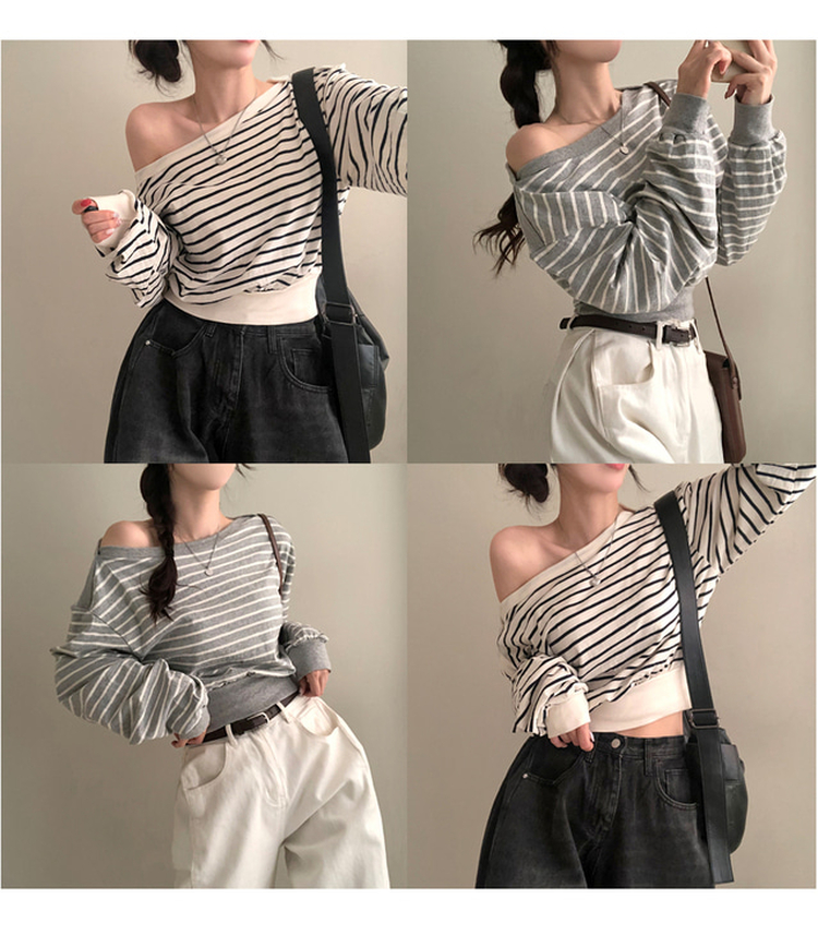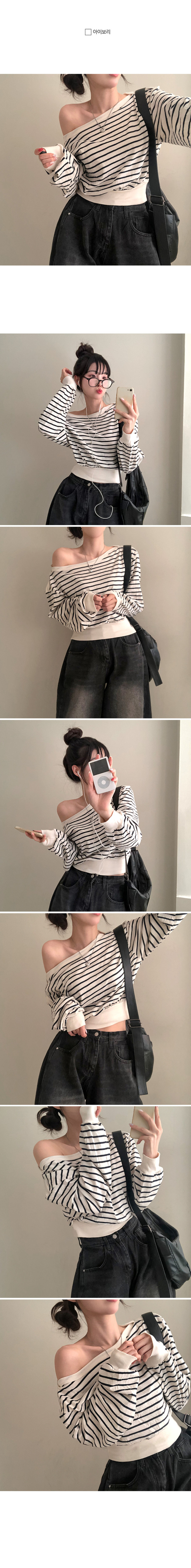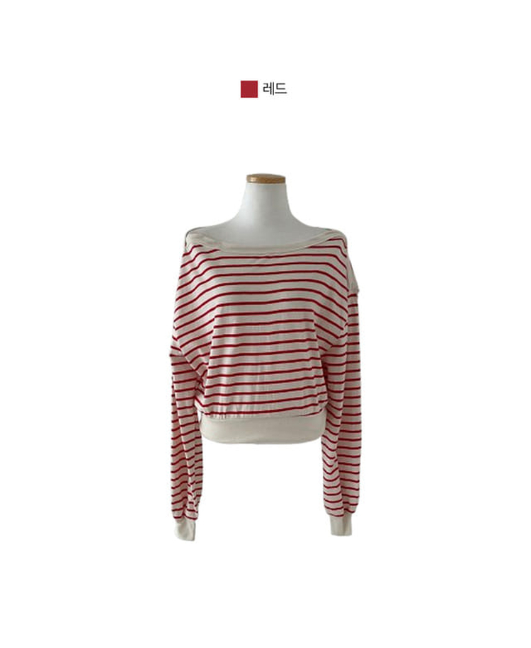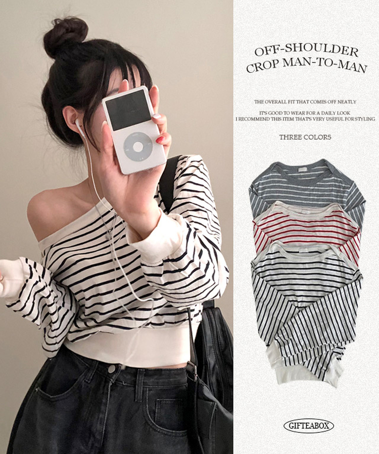 STS70889 젤린 단가라 스트라이프 언발 입술넥 오프숄더 크롭 맨투맨