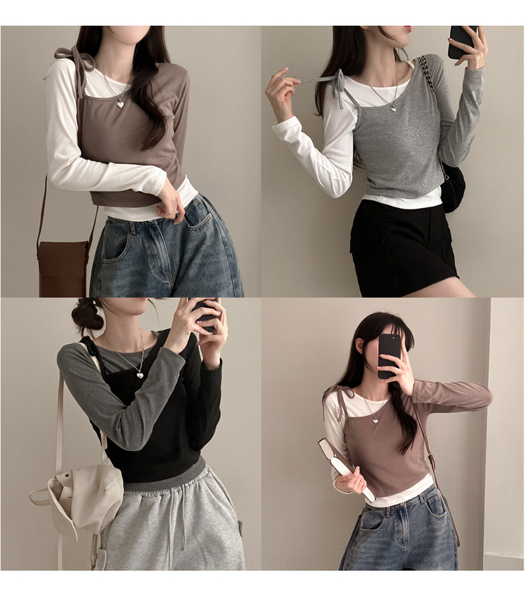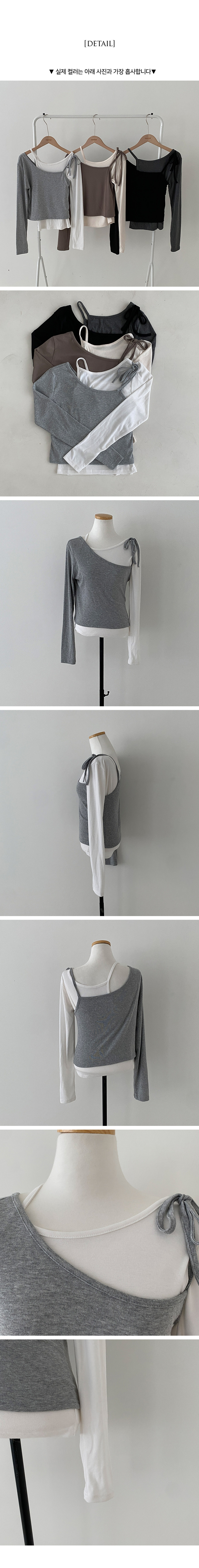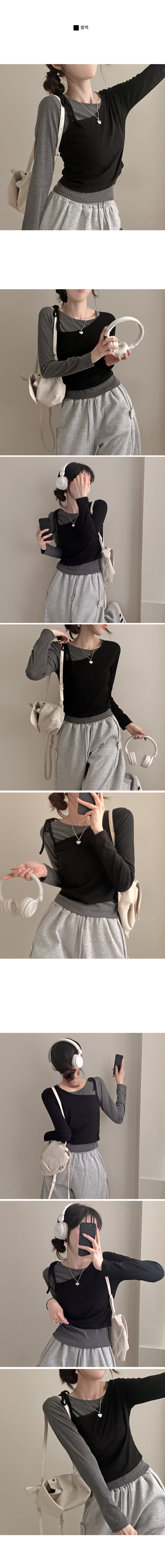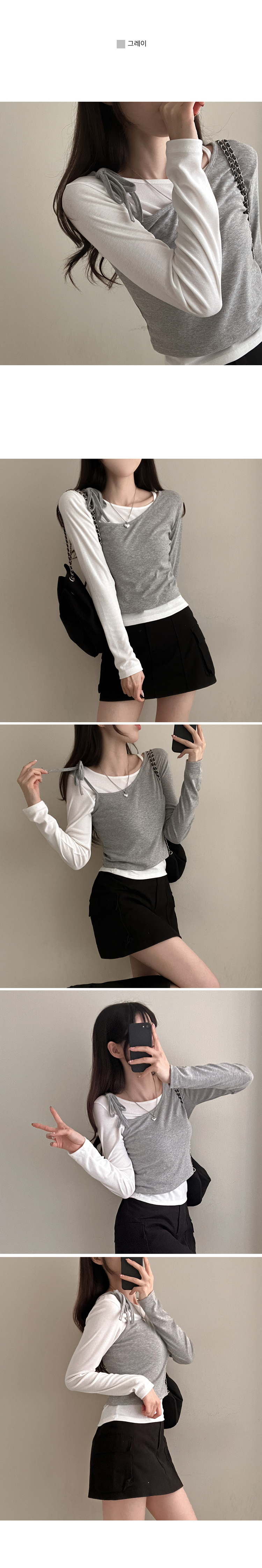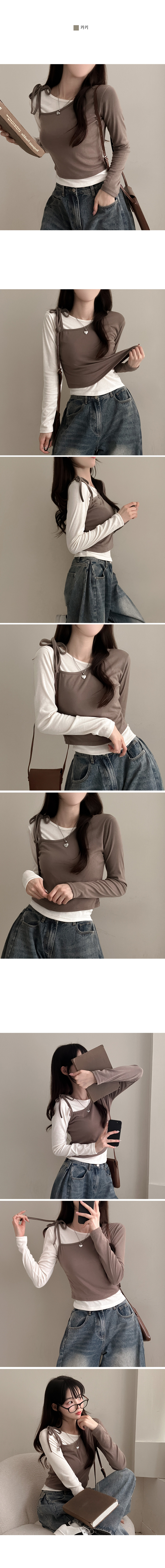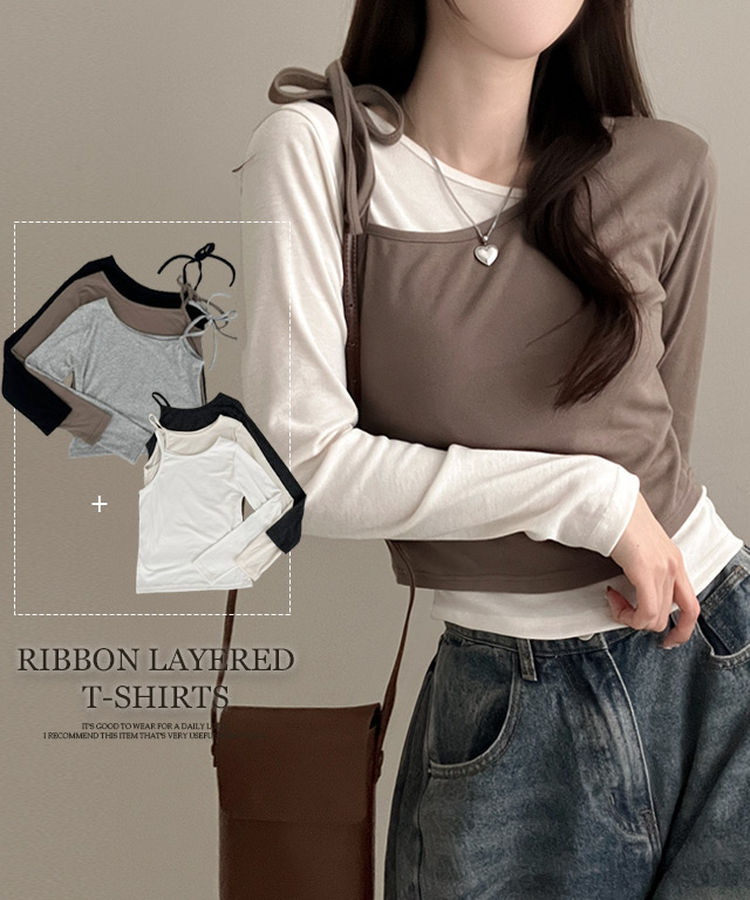 STS71148 리스 배색 레이어드 리본 긴팔 티셔츠 세트