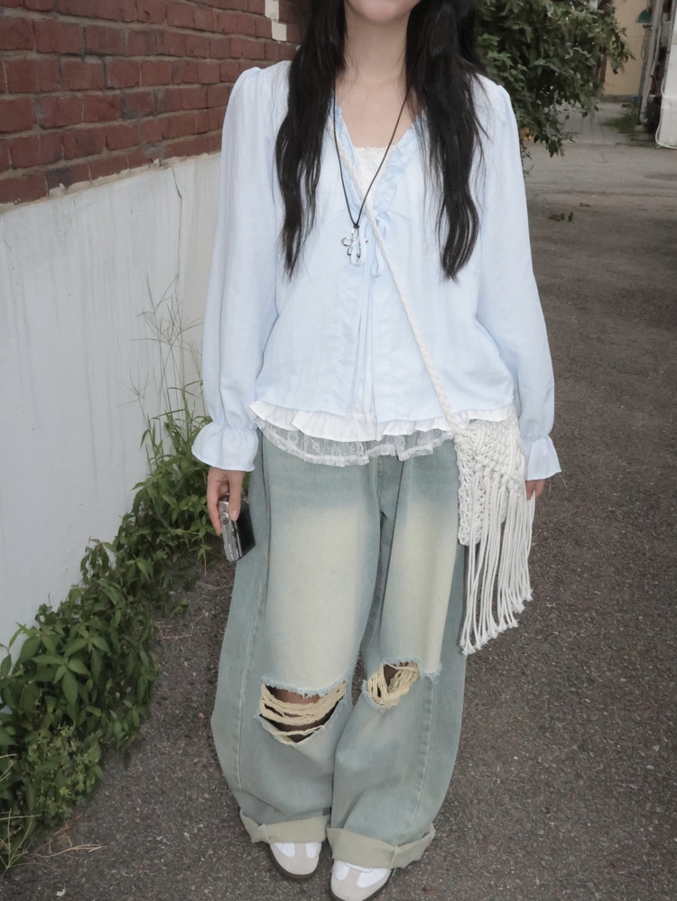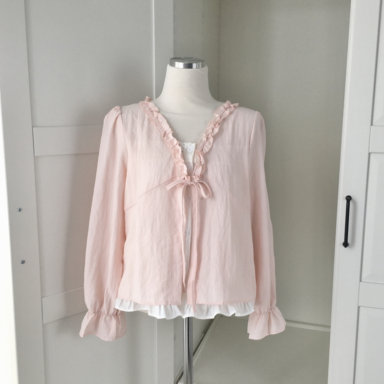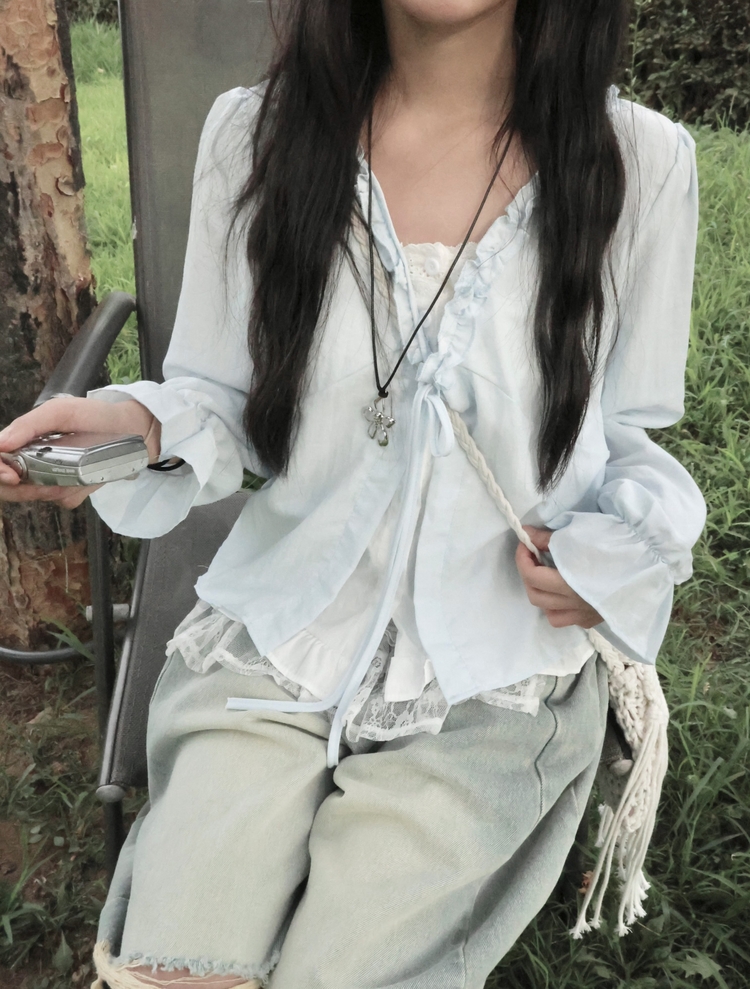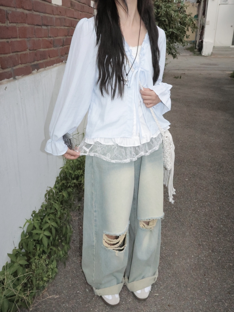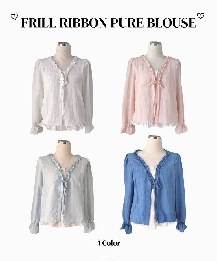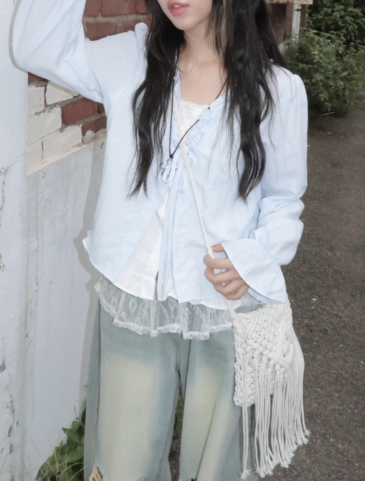 SBS29407 엔젤 프릴 리본 레이어드 발레코어 퍼프 레이스 셔링 긴팔 블라우스