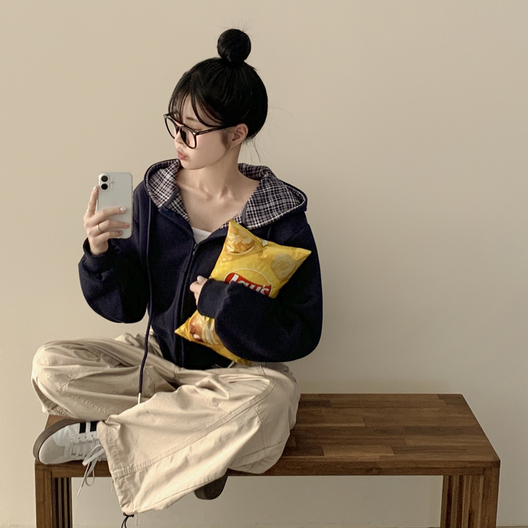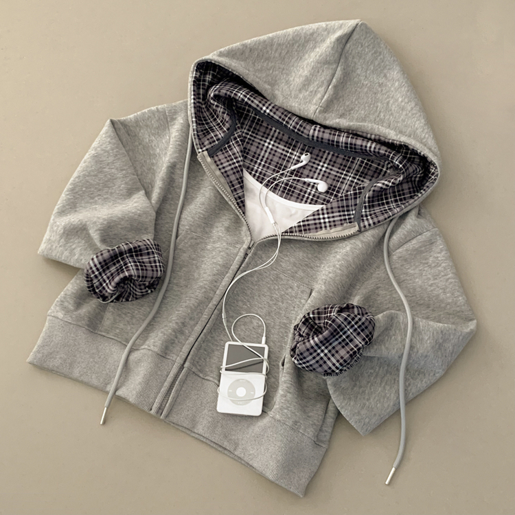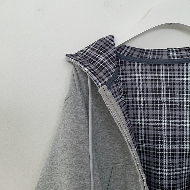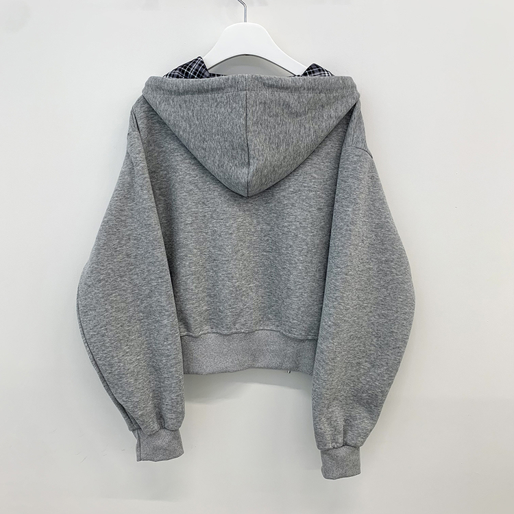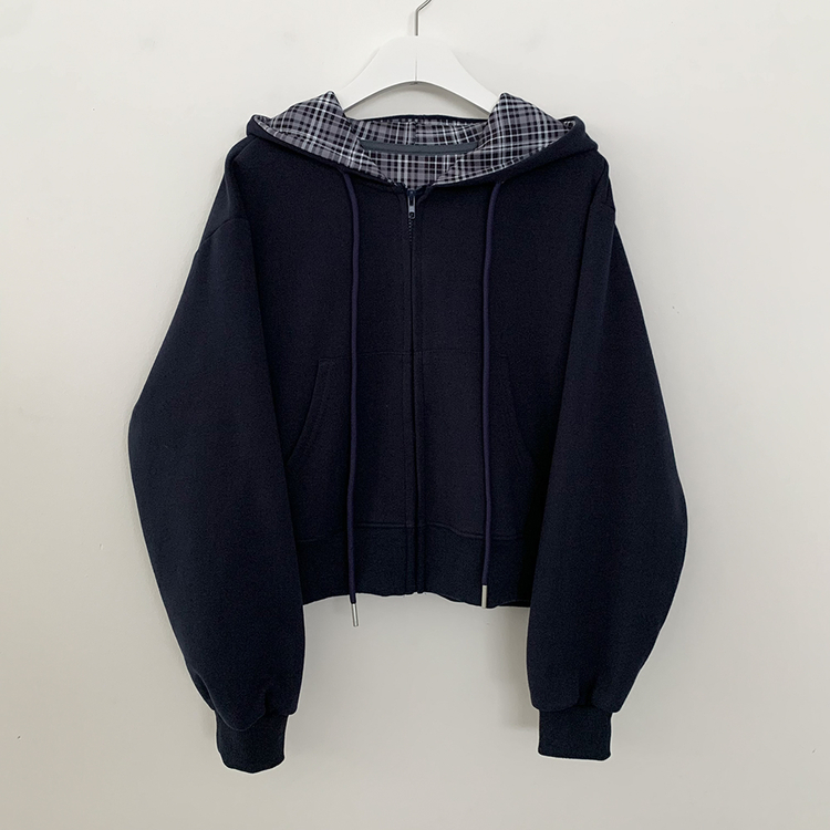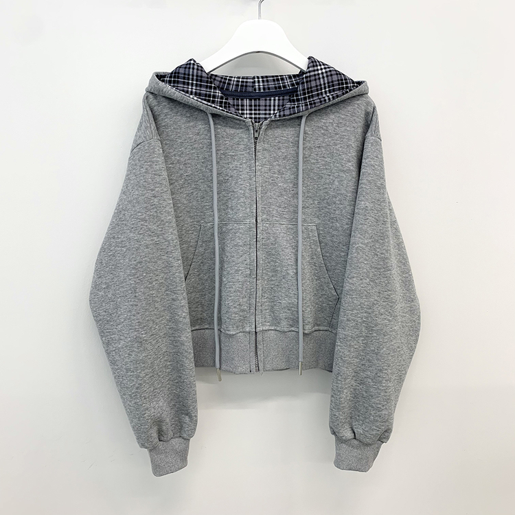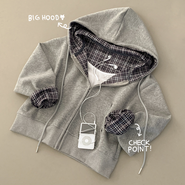 SJP17394 빈티지 체크 배색 크롭 후드집업