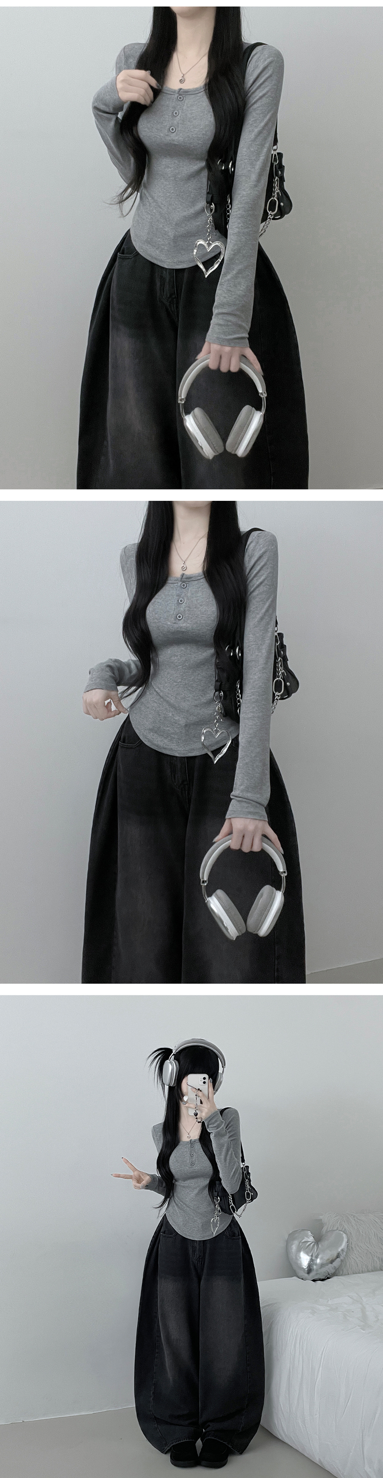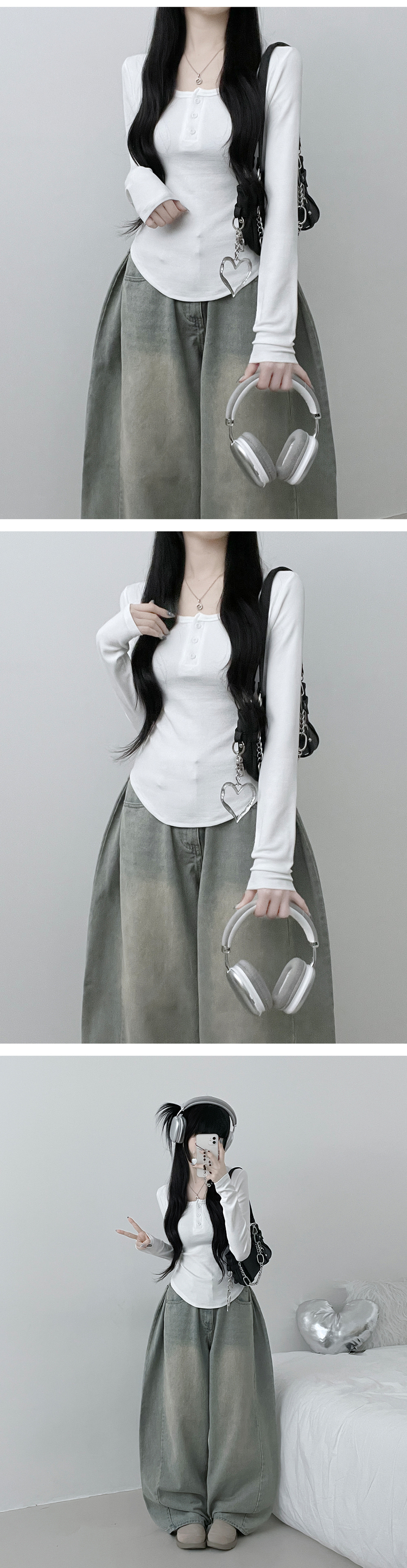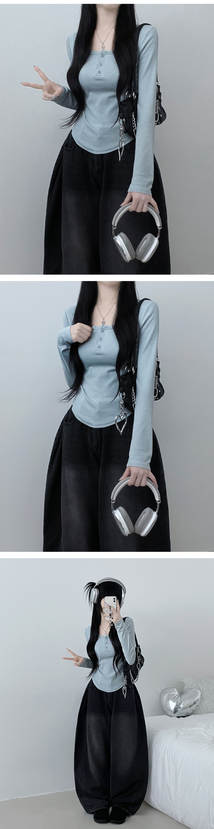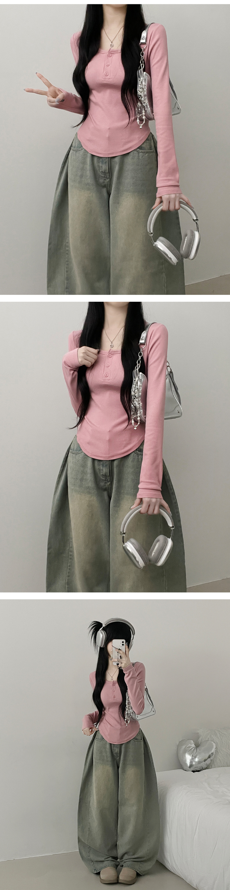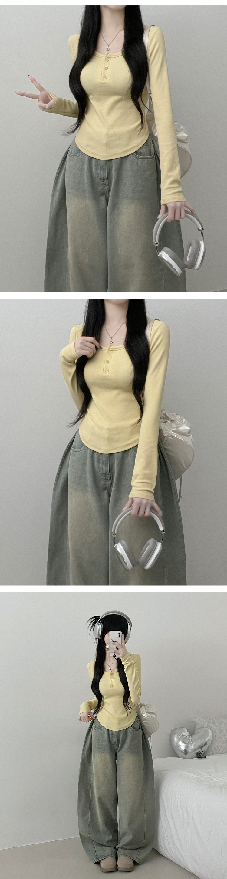 STS71300 긴팔버전리치버튼라운드세미크롭굴림긴팔티셔츠