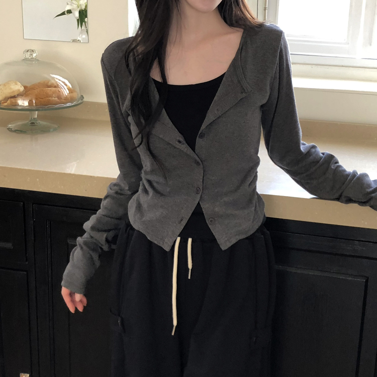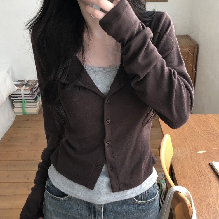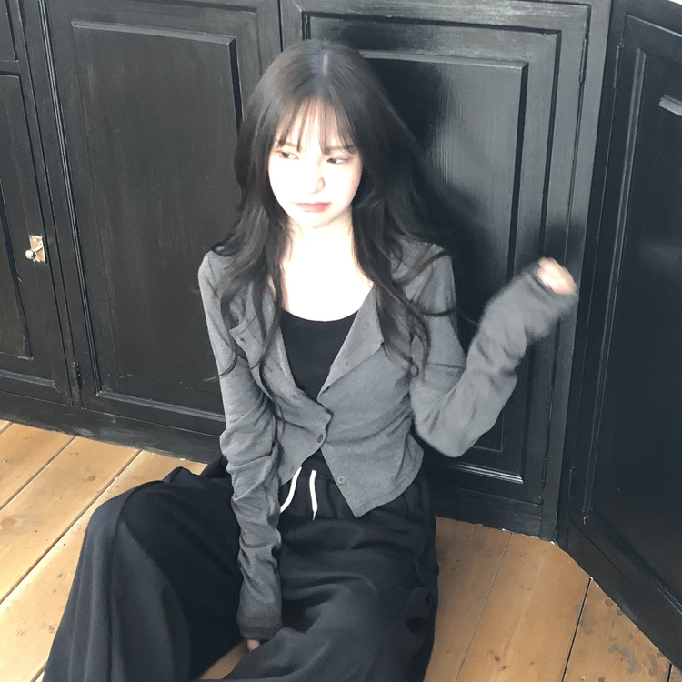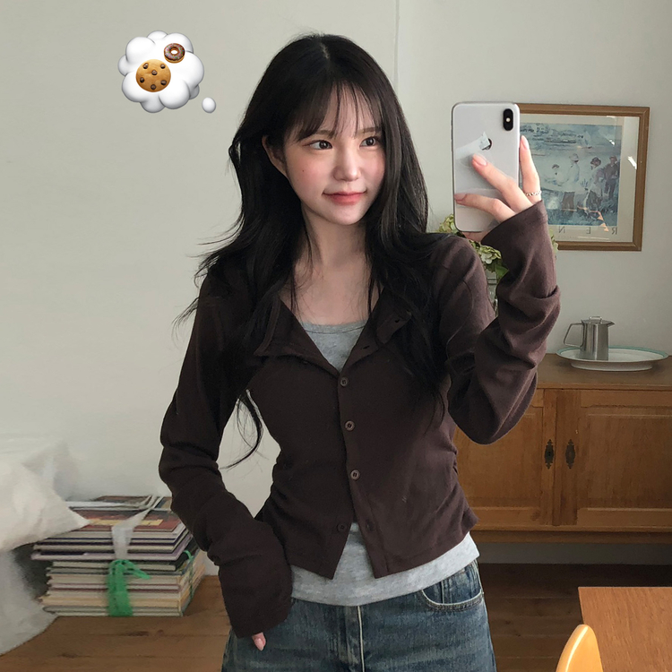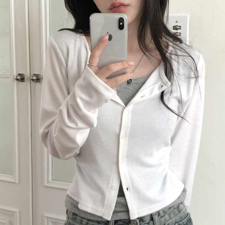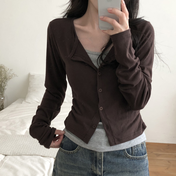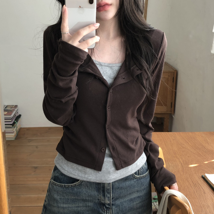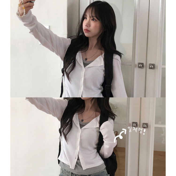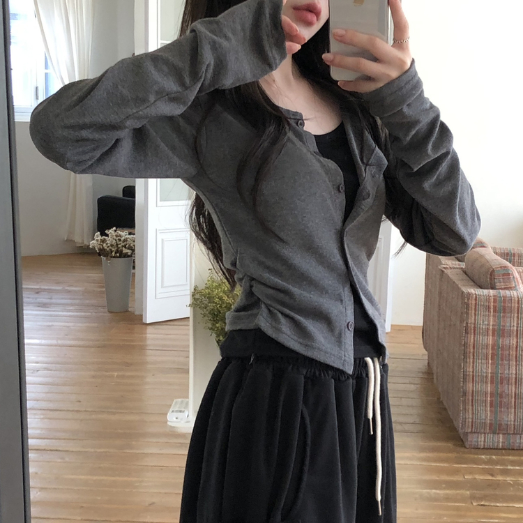 SGD28502 일체형 레이어드 데일리 허리셔링 배색 캐주얼 가디건 긴팔티
