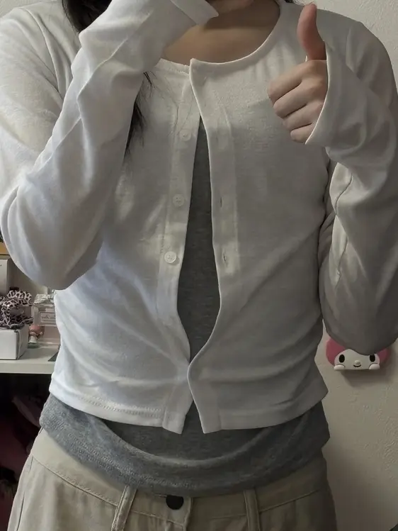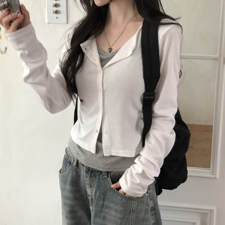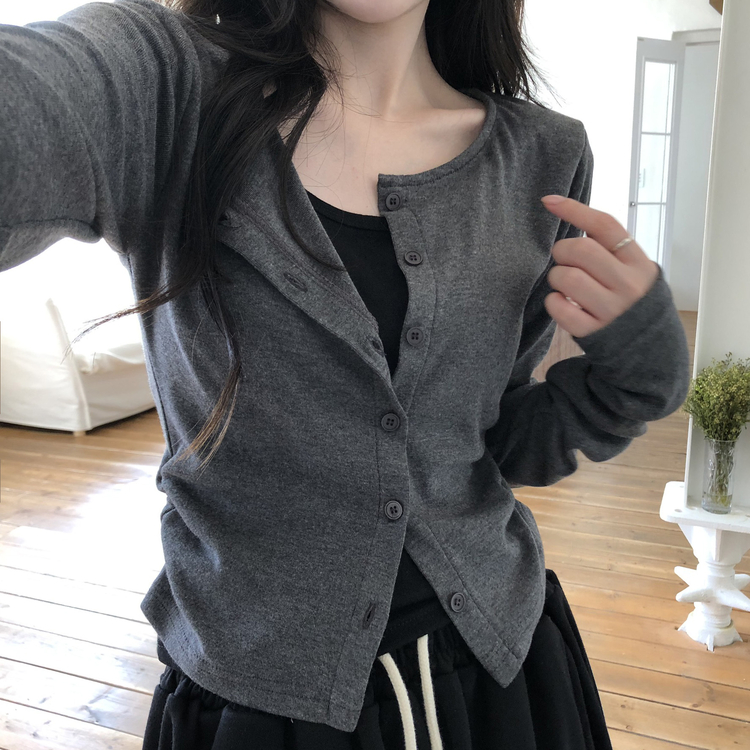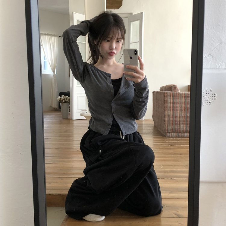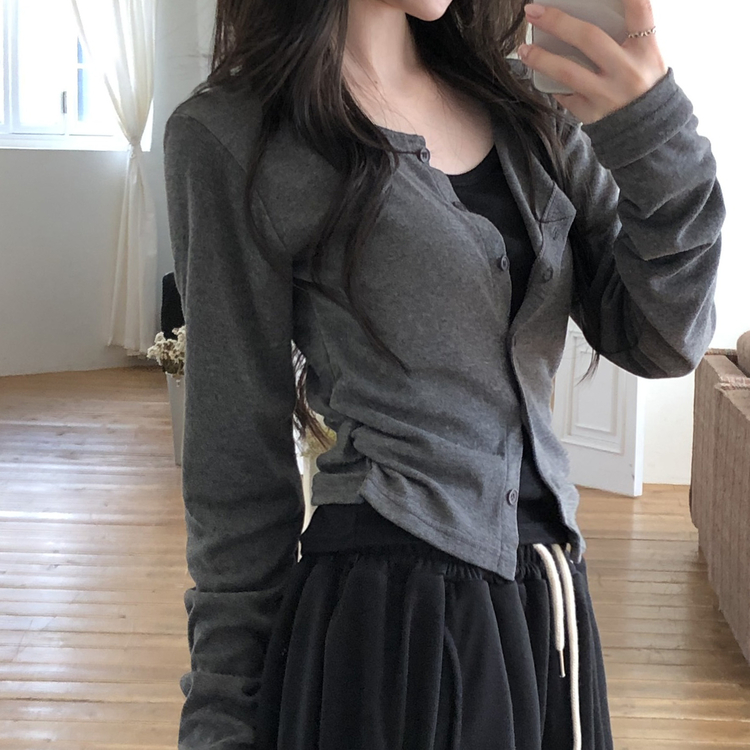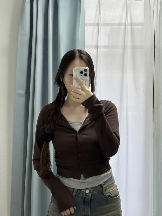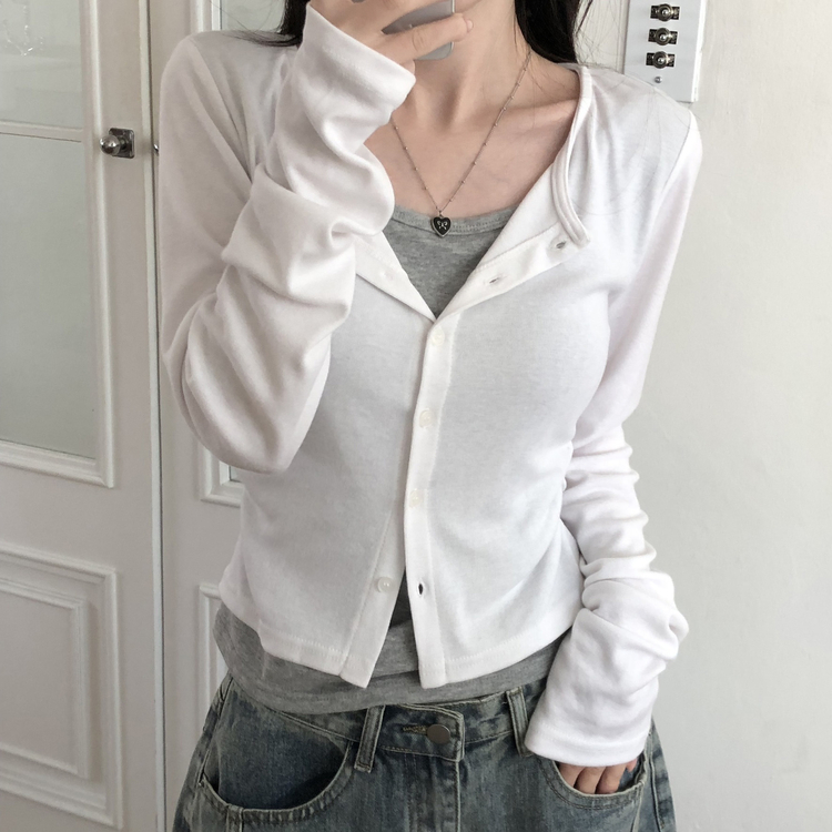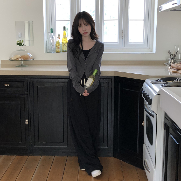 SGD28502 일체형 레이어드 데일리 허리셔링 배색 캐주얼 가디건 긴팔티