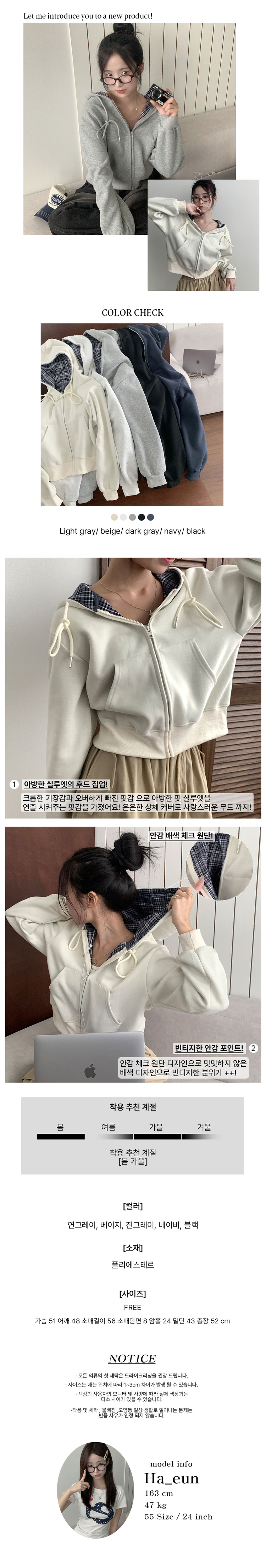 SJP17476 푸티 배색 체크 크롭 오버핏 스트링 후드집업