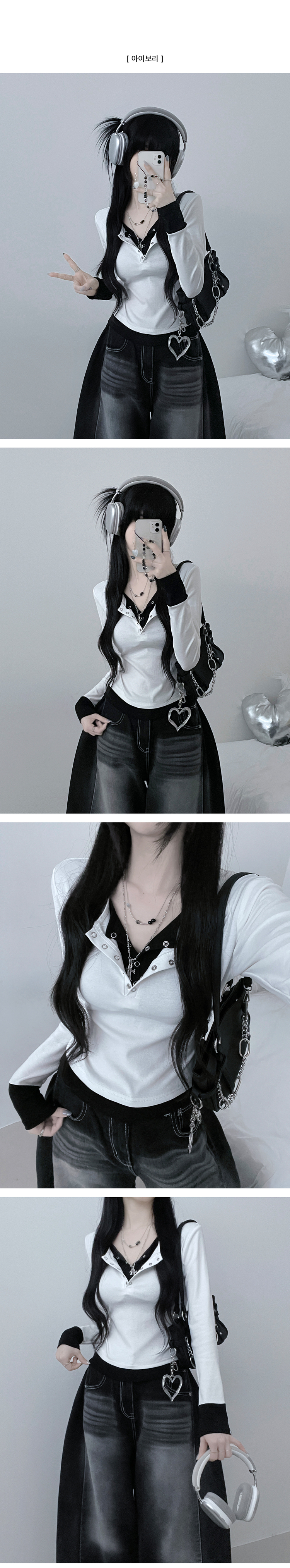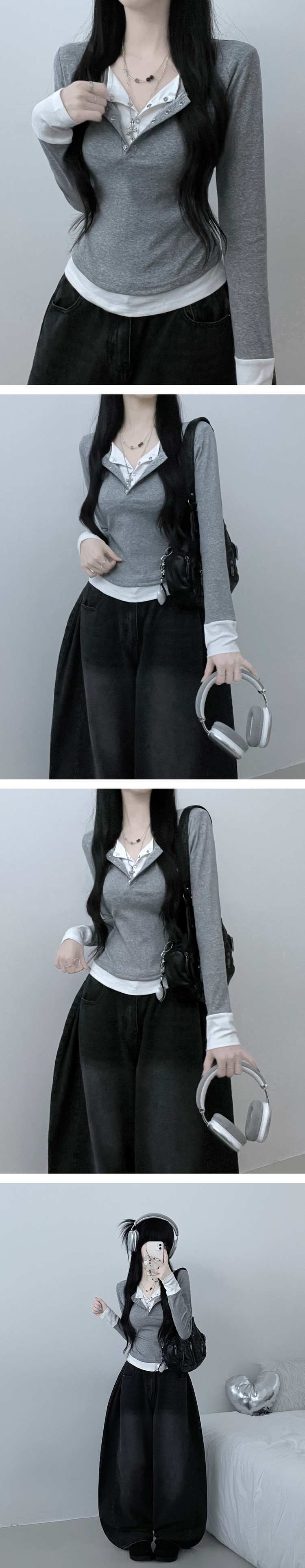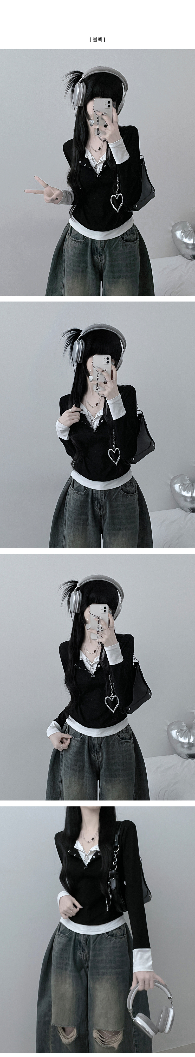 STS71823 키쉬더블버튼또또배색레이어드긴팔티셔츠