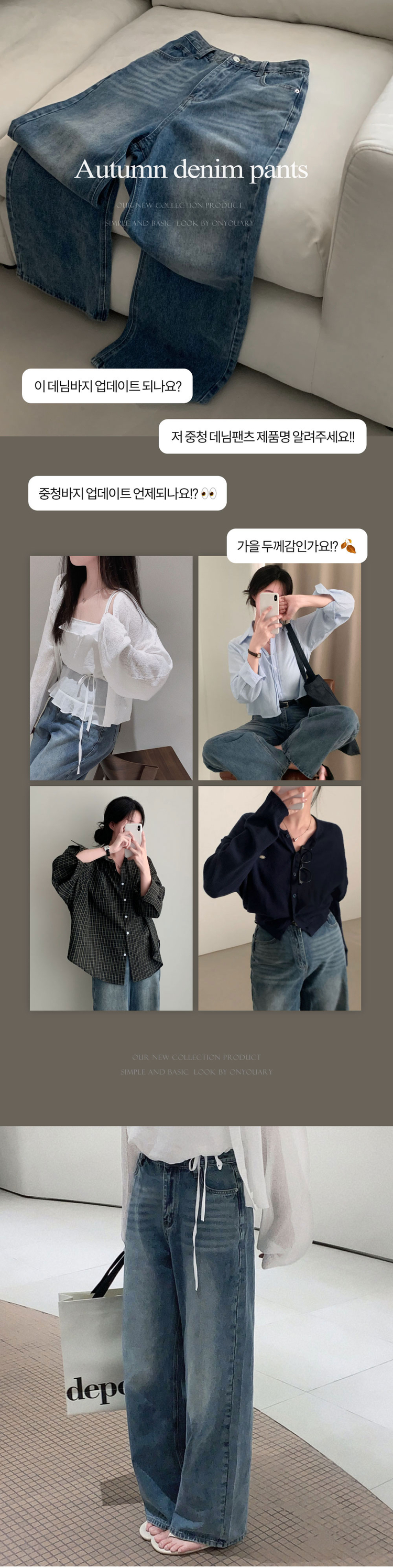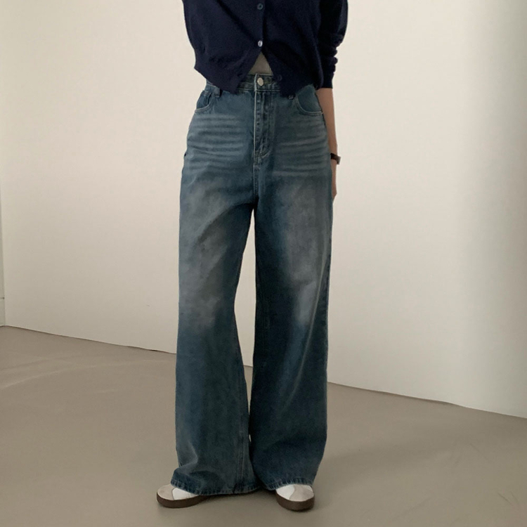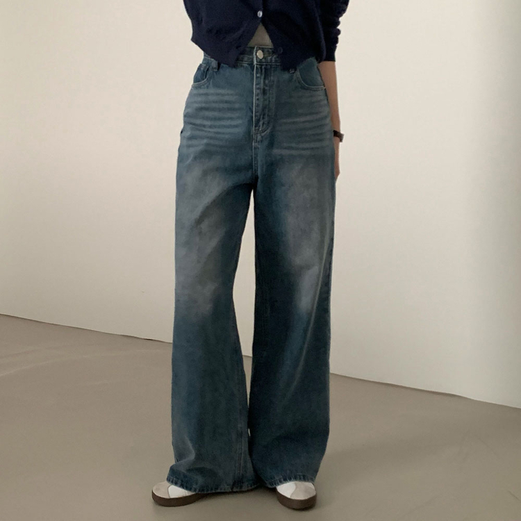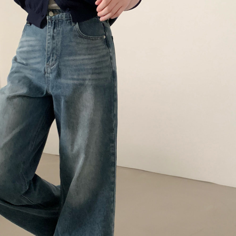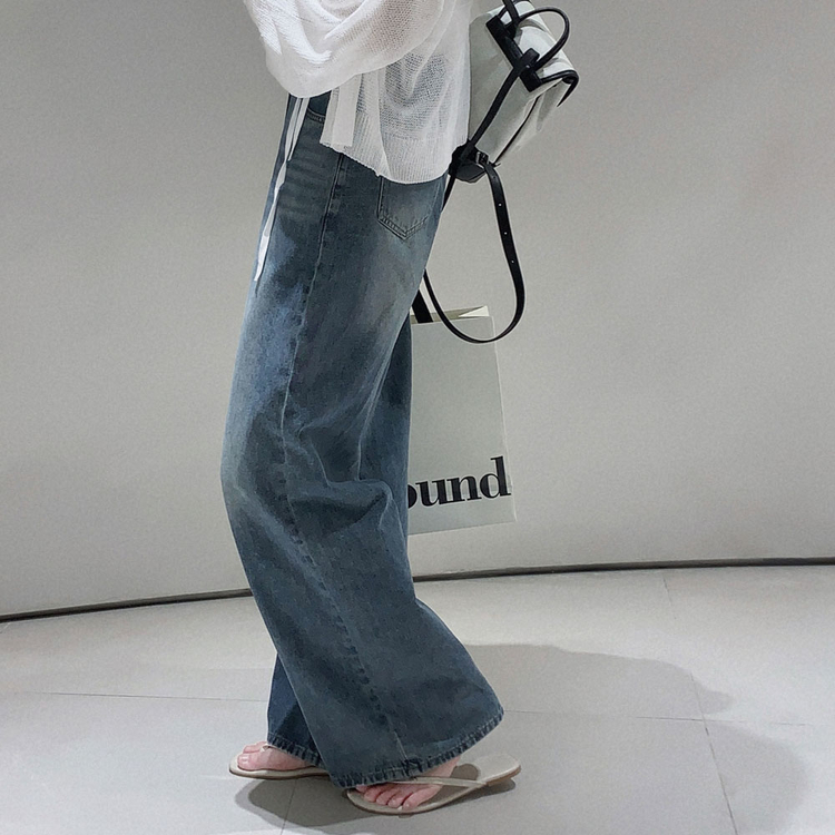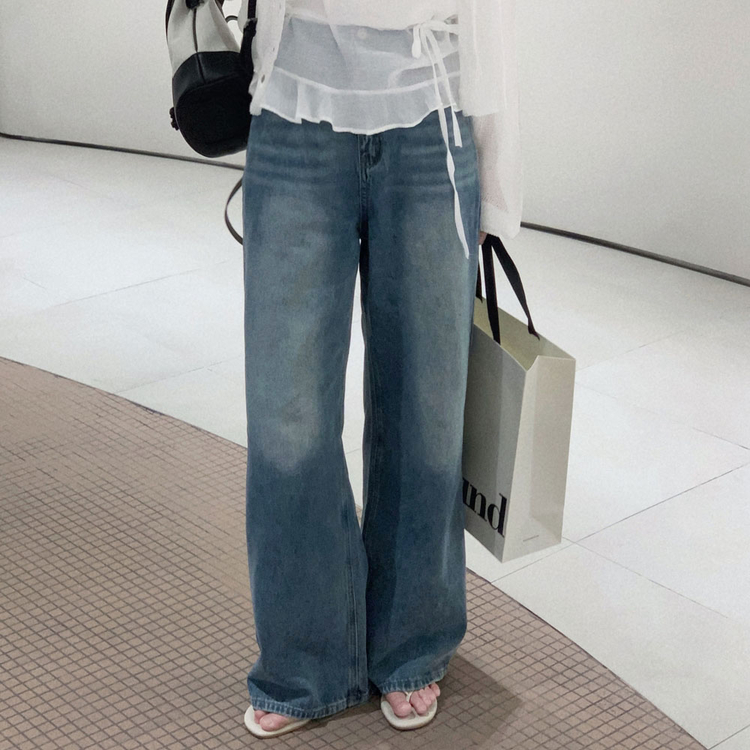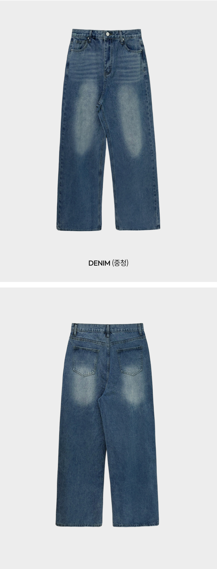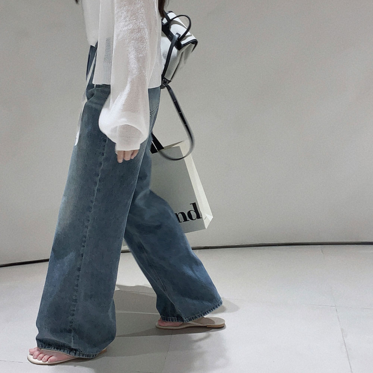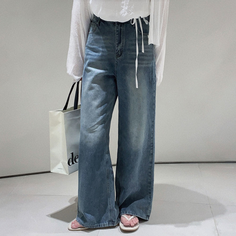 SJE12971 진정성 있는 데님캣워싱 중청 하이웨이스트 롱 와이드 데님팬츠