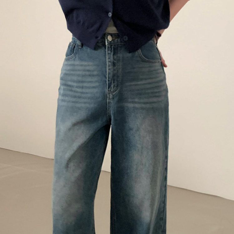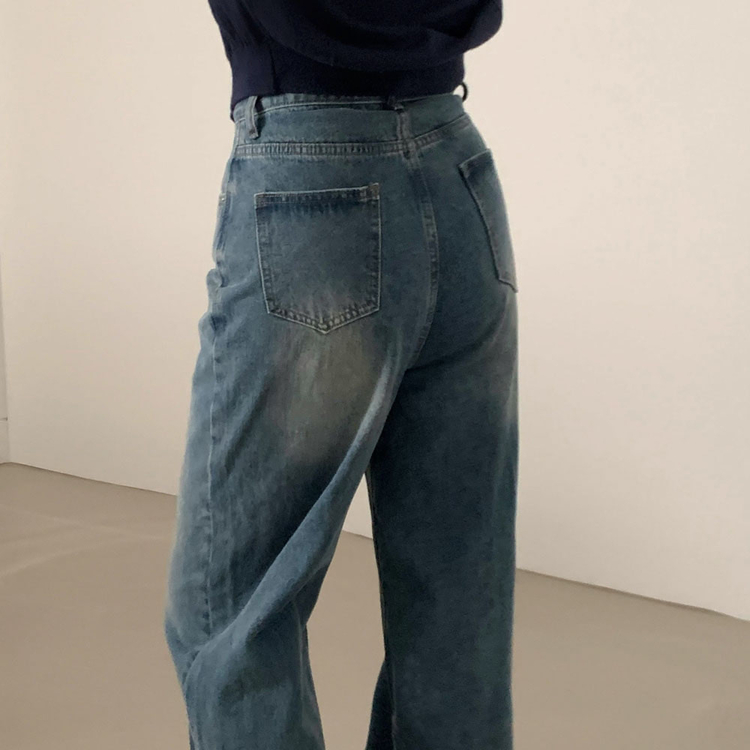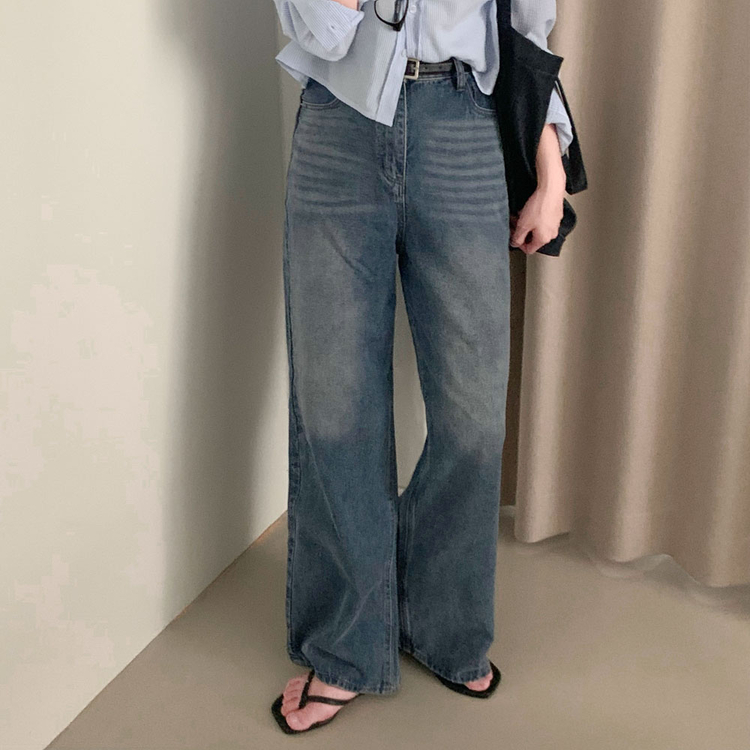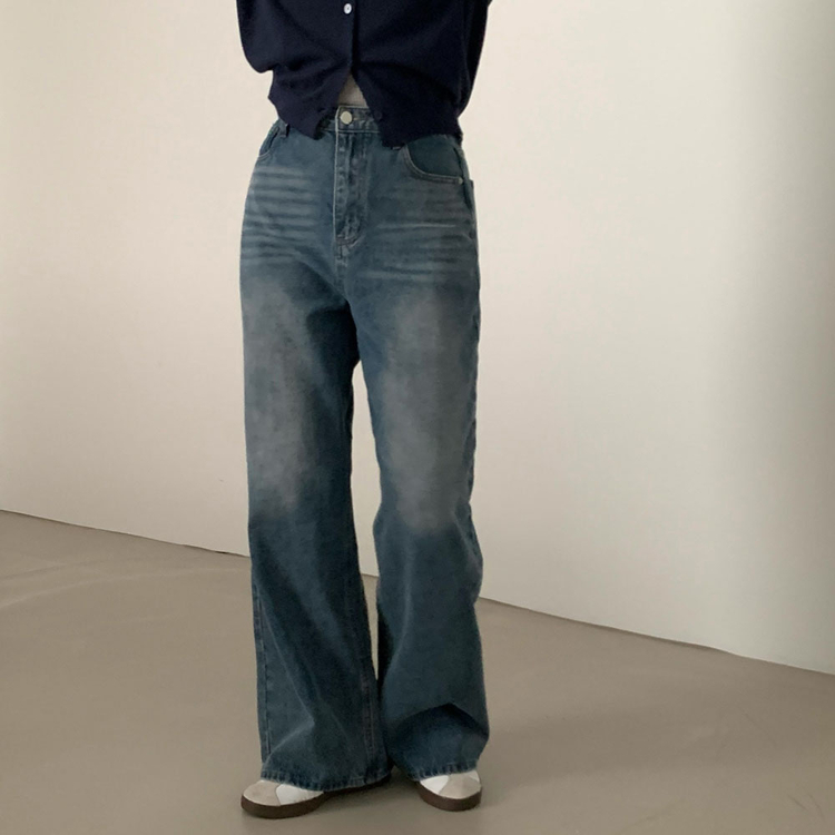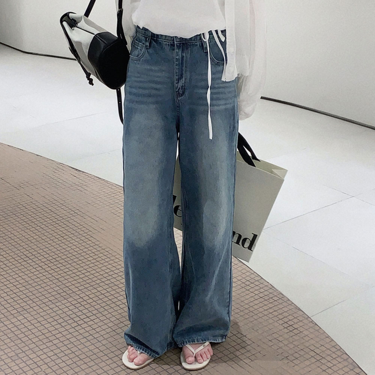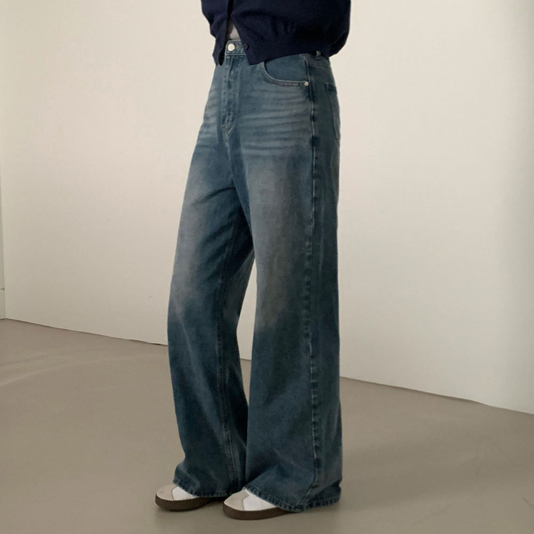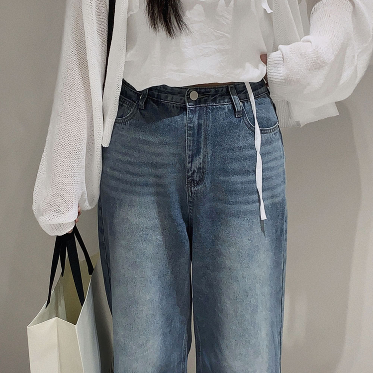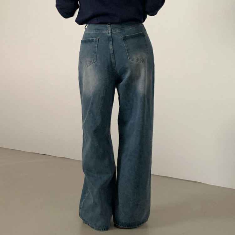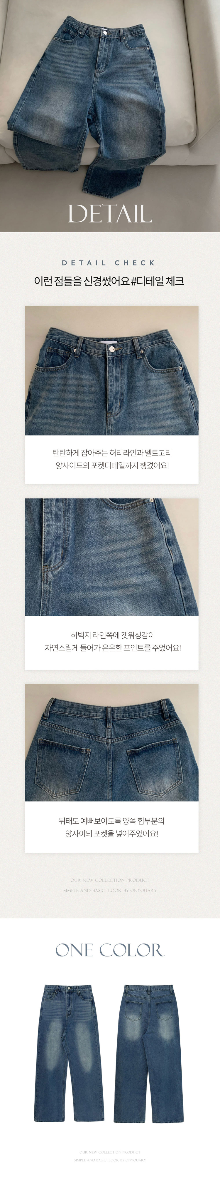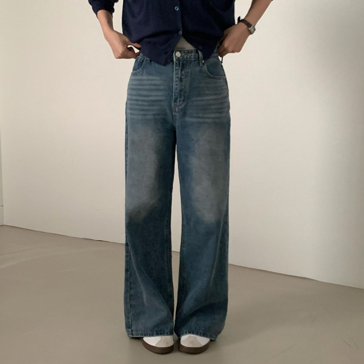 SJE12971 진정성 있는 데님캣워싱 중청 하이웨이스트 롱 와이드 데님팬츠