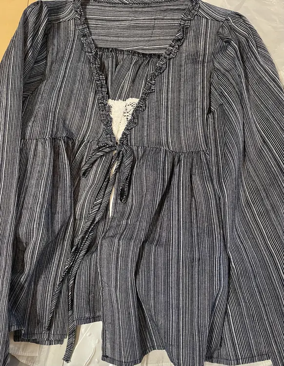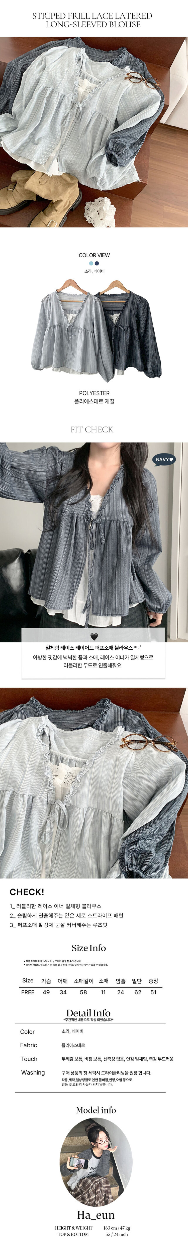 SBS29879 코이 세로 스트라이프 패턴 프릴 레이어드 일체형 긴팔 퍼프소매 블라우스