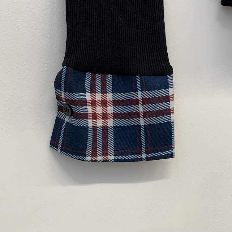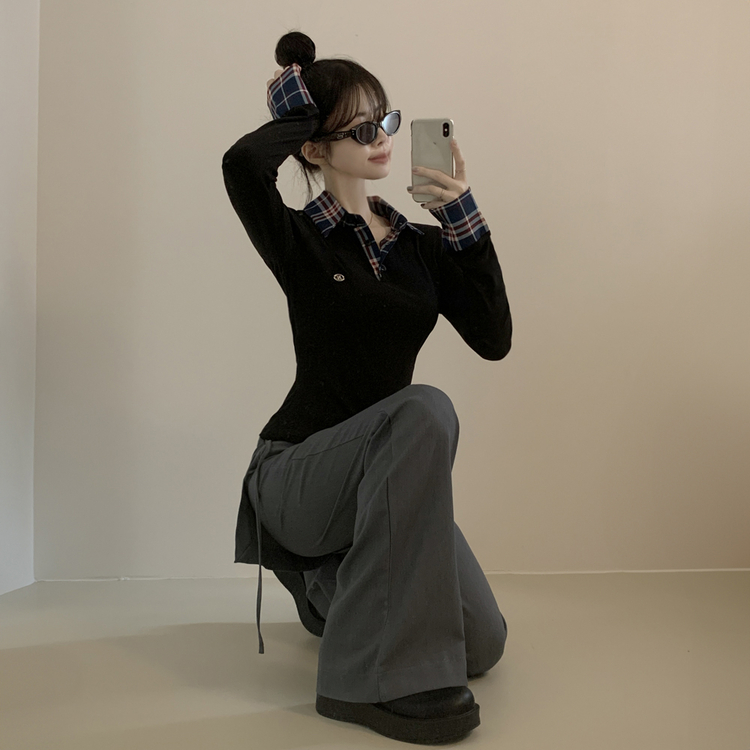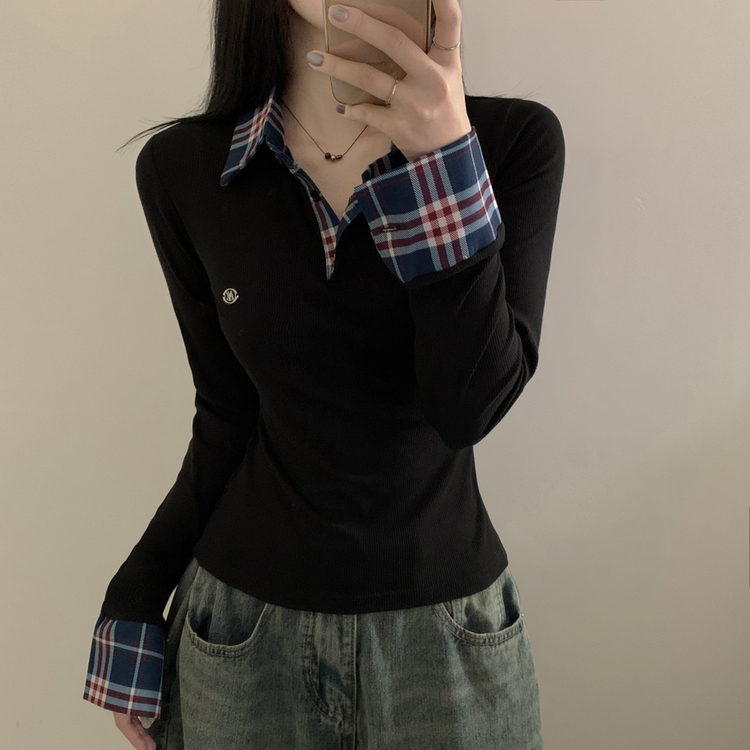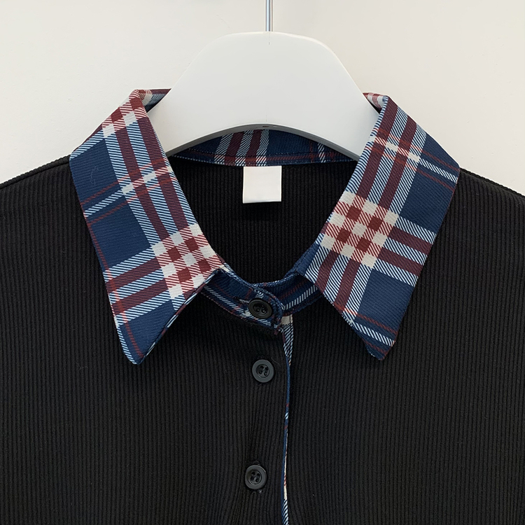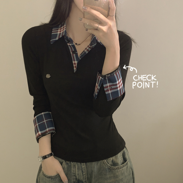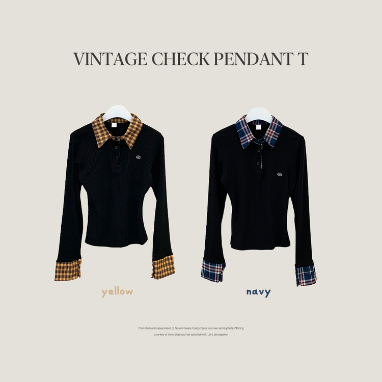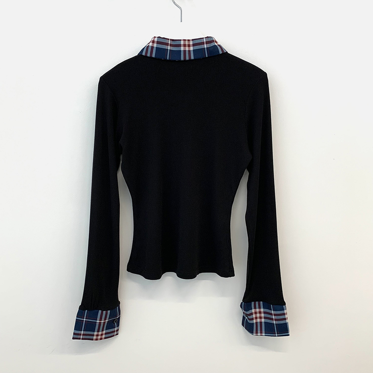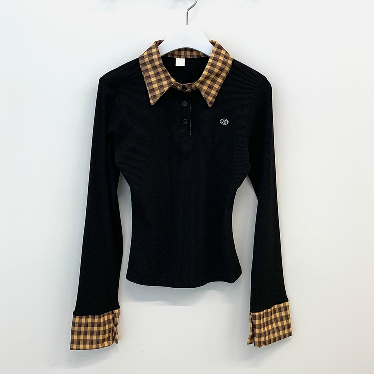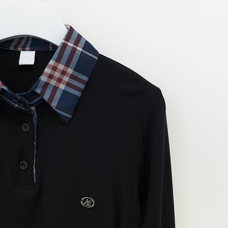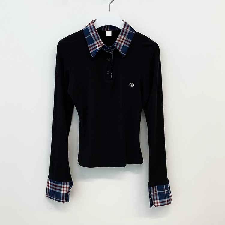 STS72288 긱시크 배색 카라 체크셔츠 레이어드st 일체형 슬림핏 버튼 허리잘록 펜던트 긴팔티셔츠