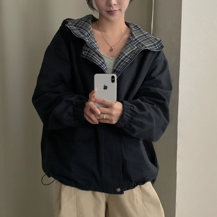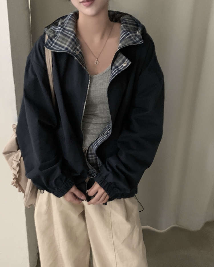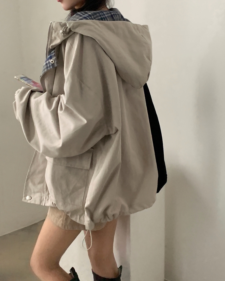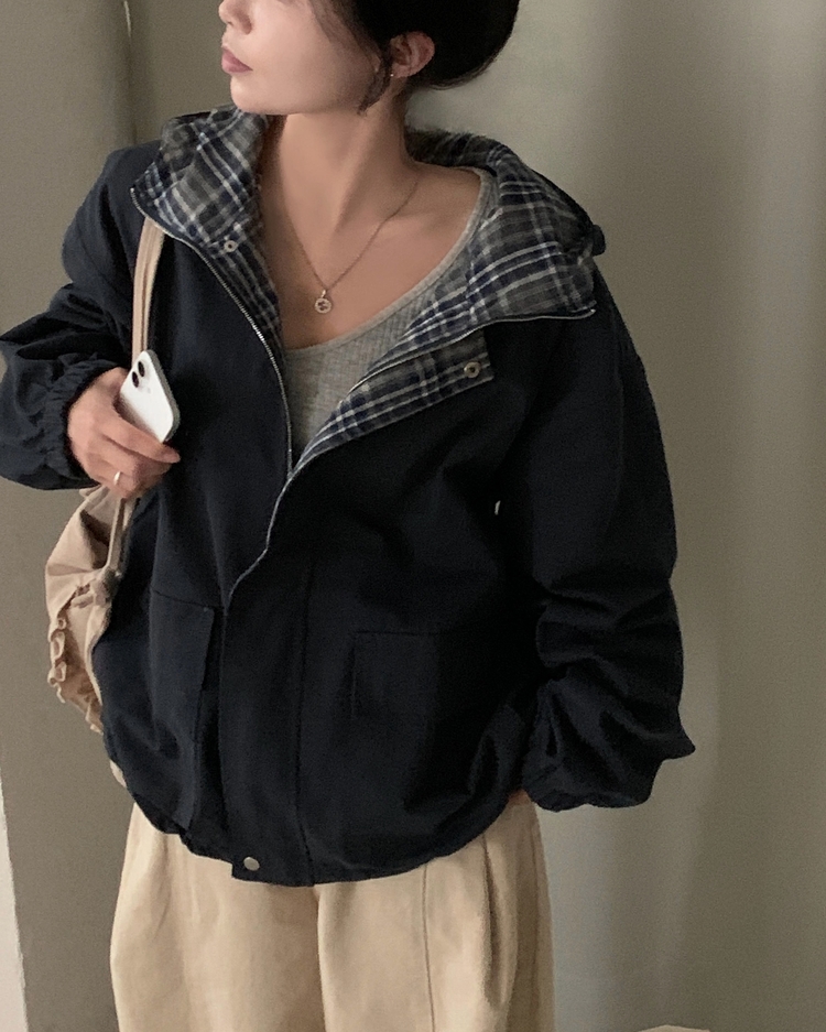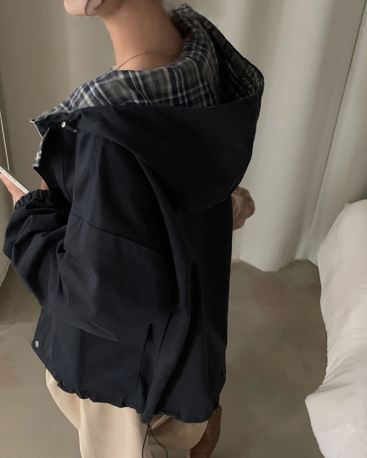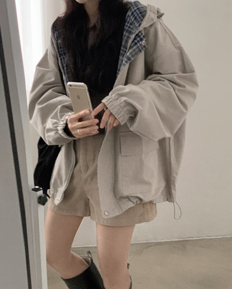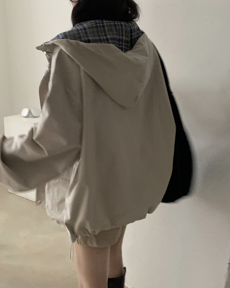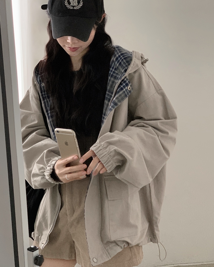 SJP17803 캠브리지 체크 배색 스트링 후드야상 집업점퍼