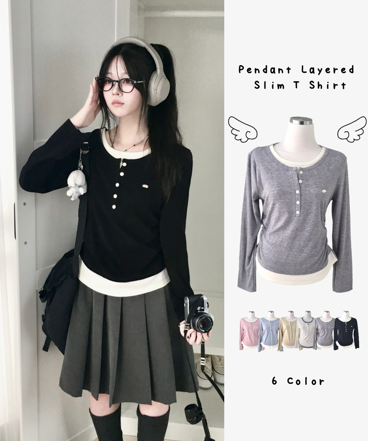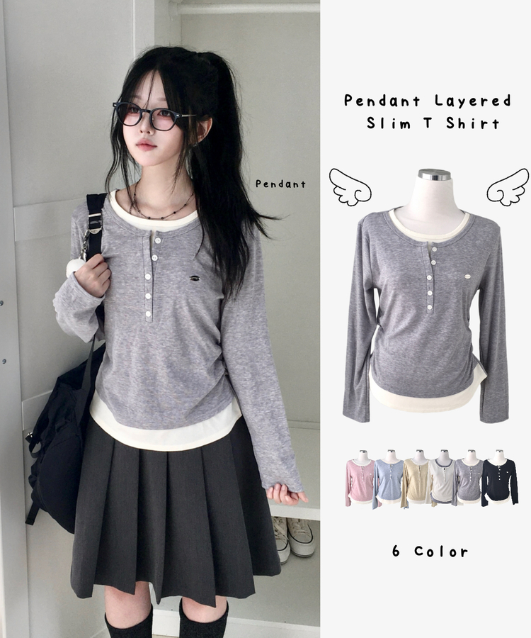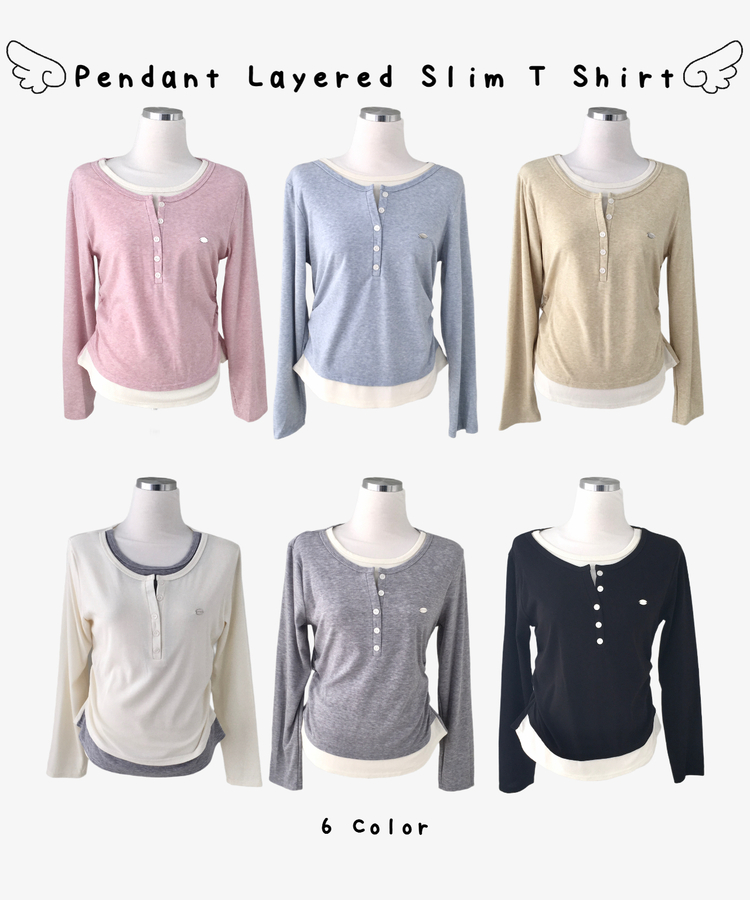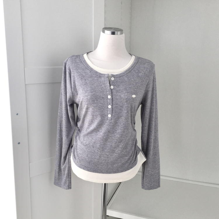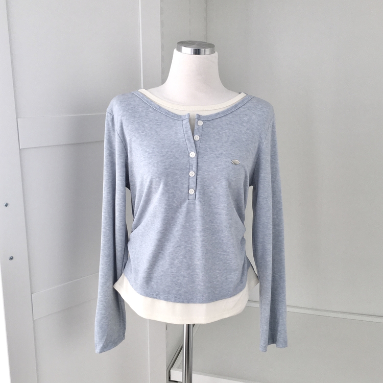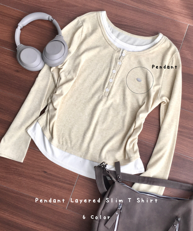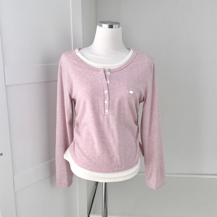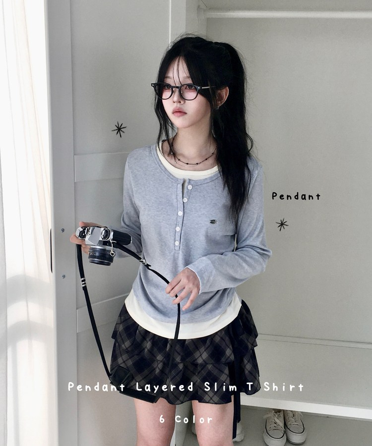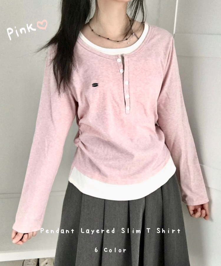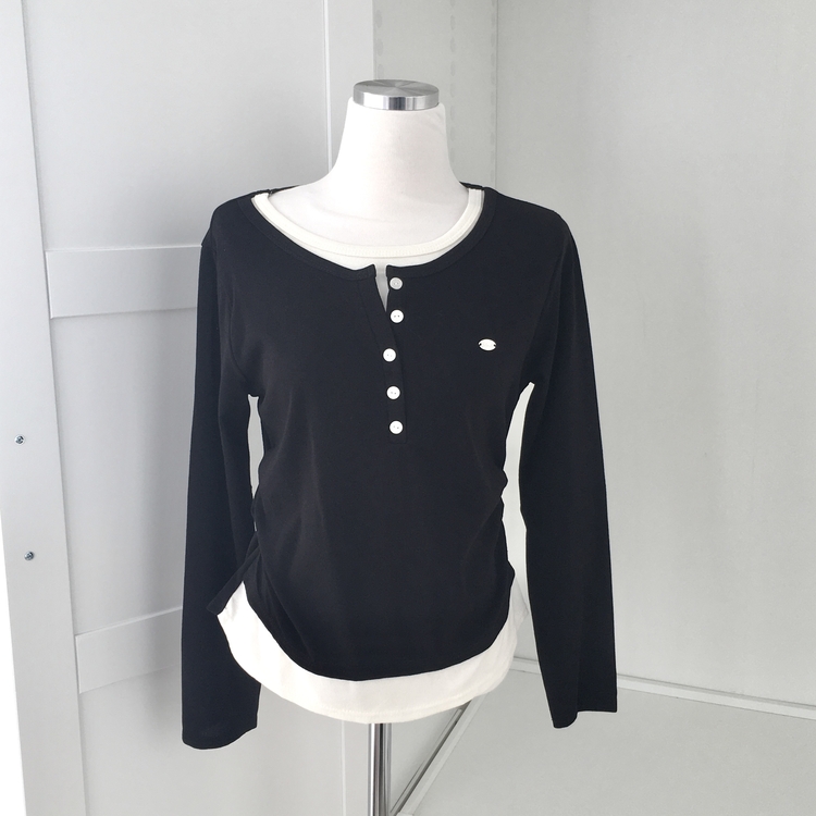 STS72548 말라보이는 사이드 셔링 팬던트 레이어드 버튼 긴팔티셔츠