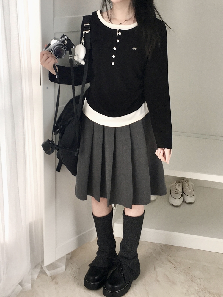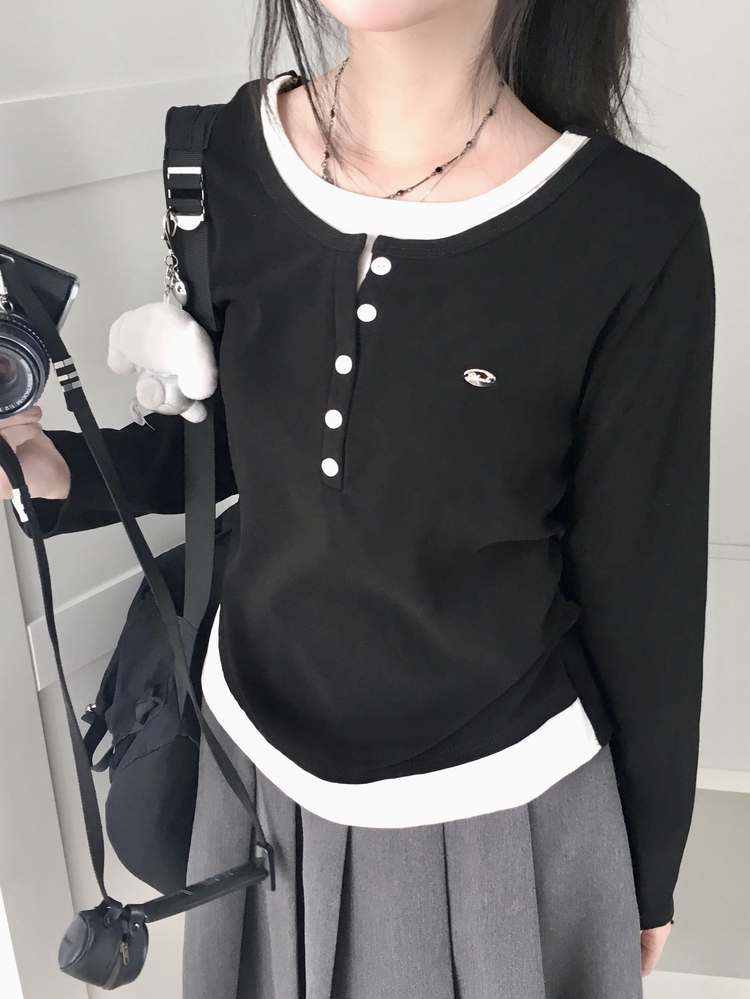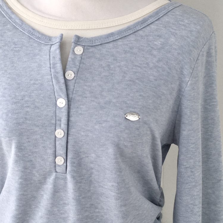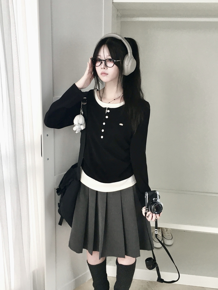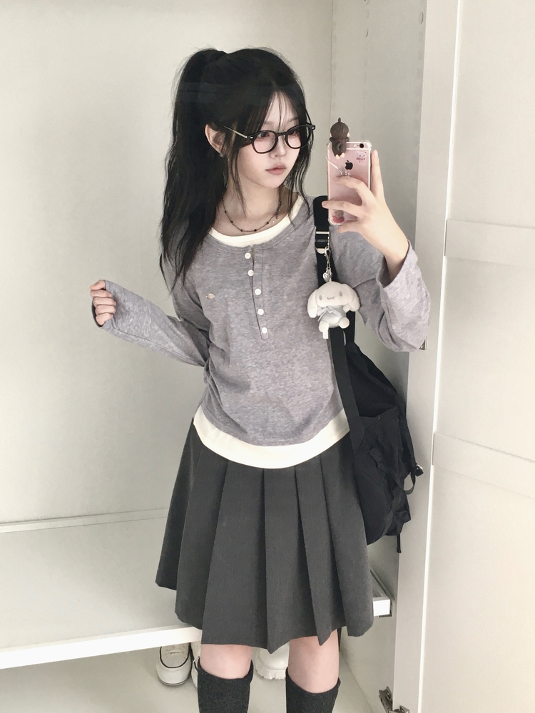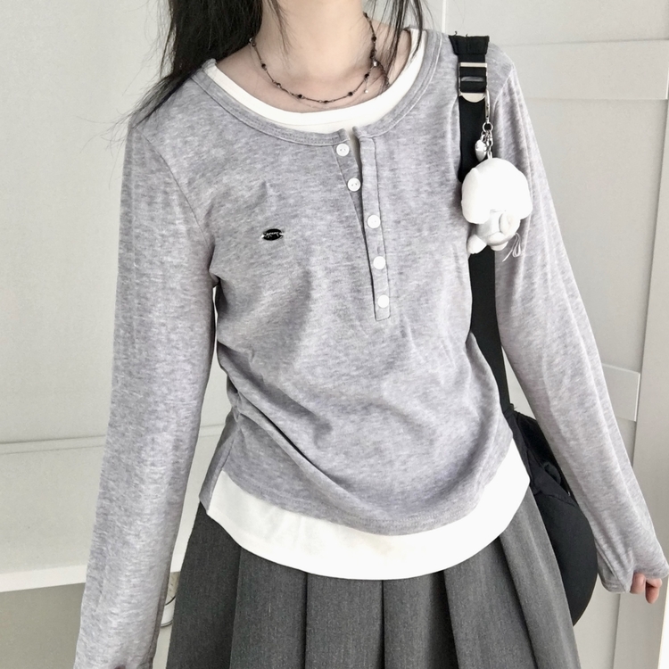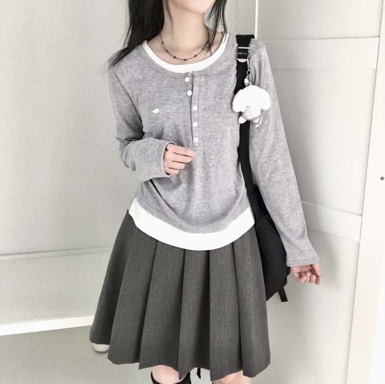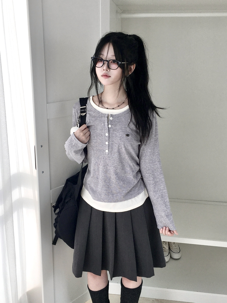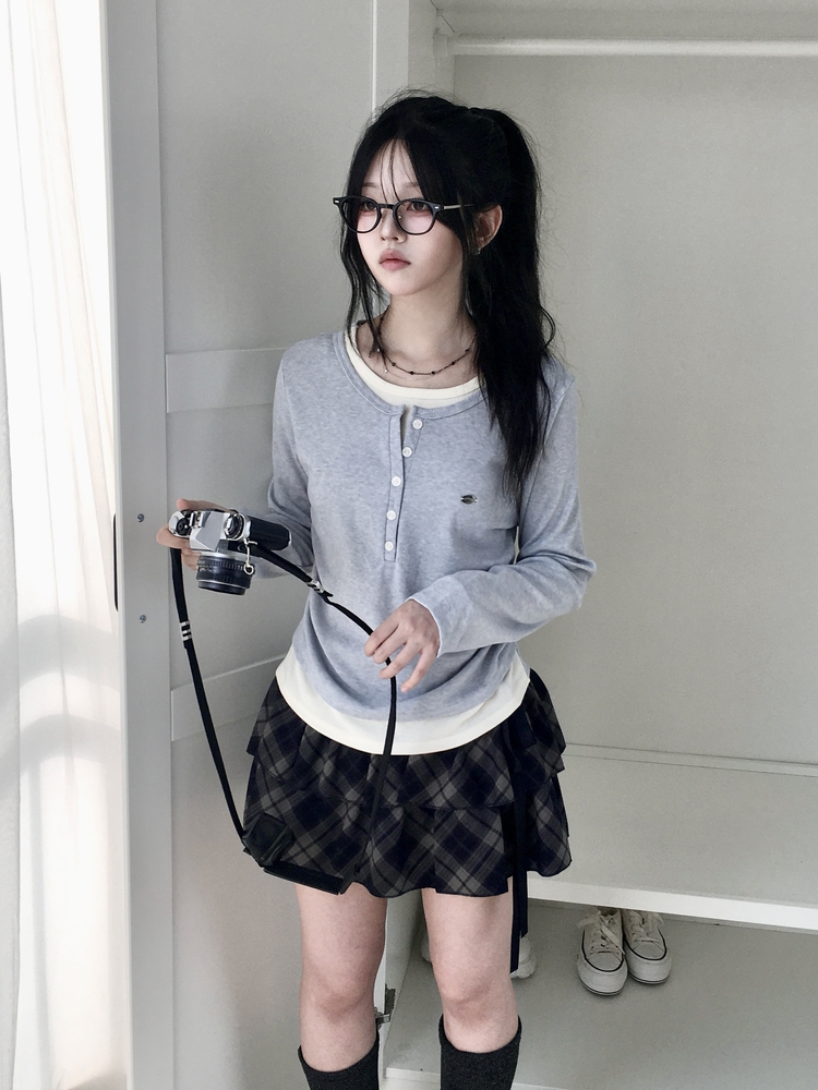 STS72548 말라보이는 사이드 셔링 팬던트 레이어드 버튼 긴팔티셔츠