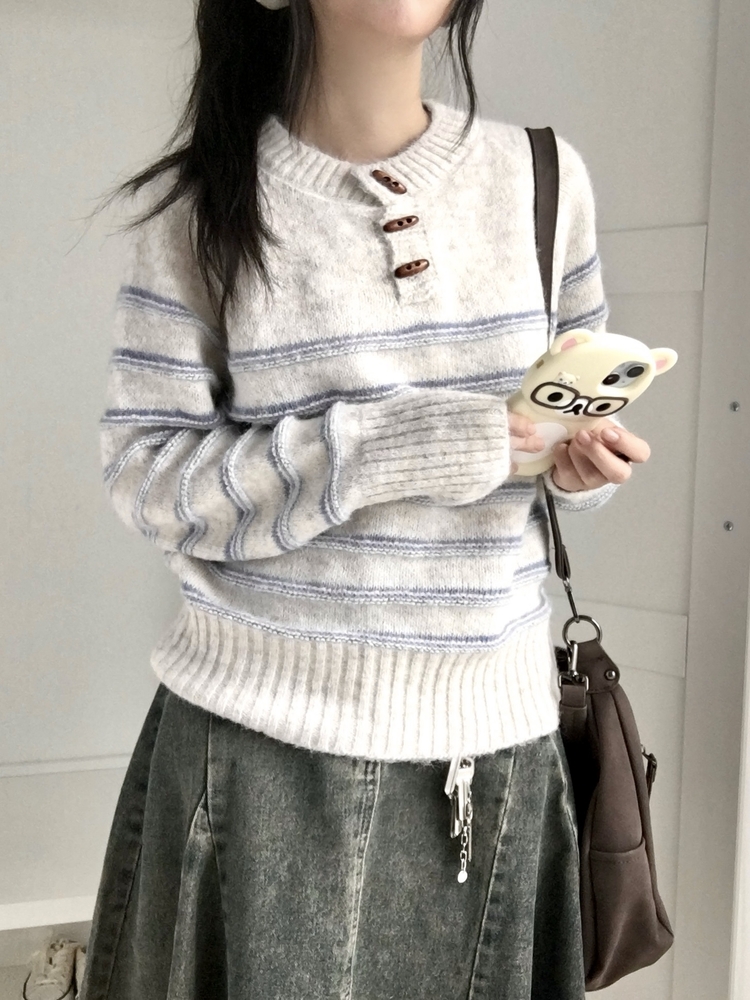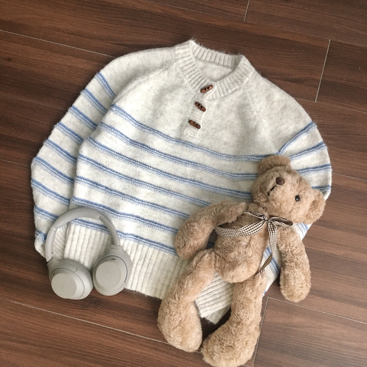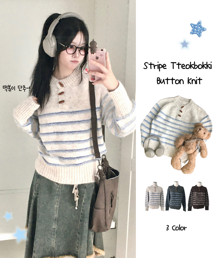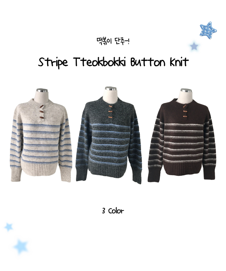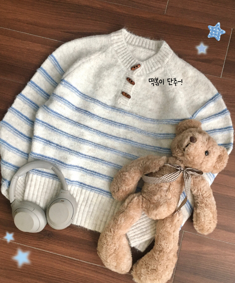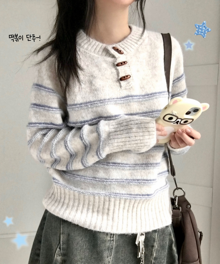 SNT32384 떡볶이 버튼 스트라이프 라운드넥 아방 루즈핏 니트