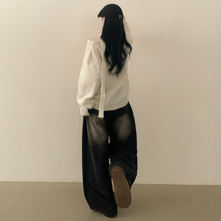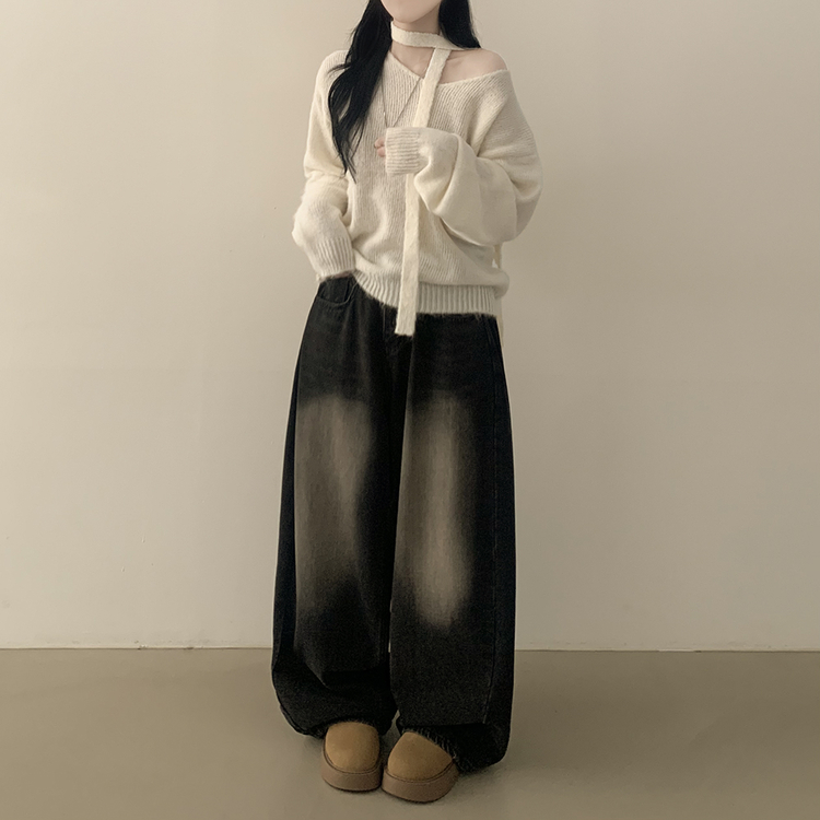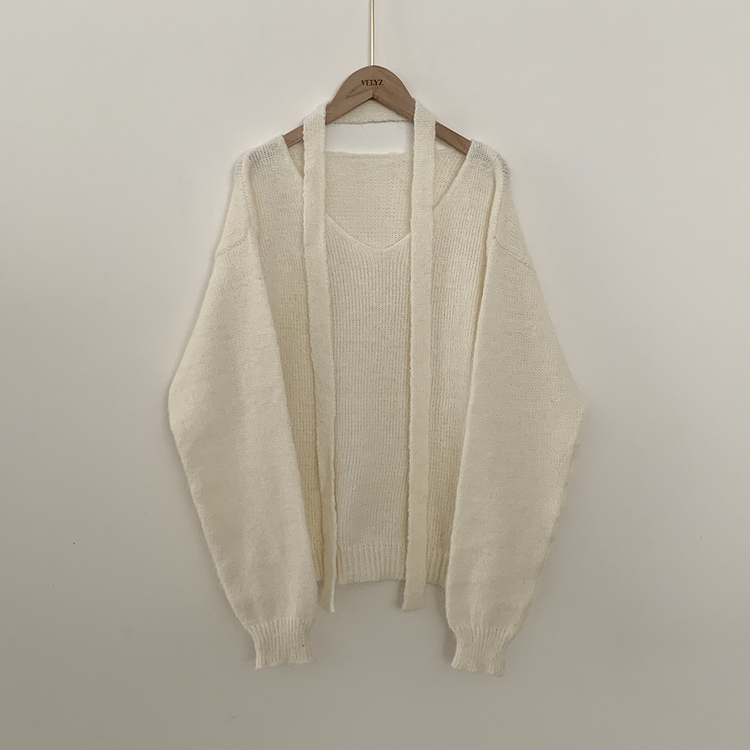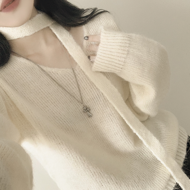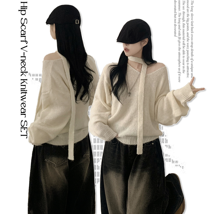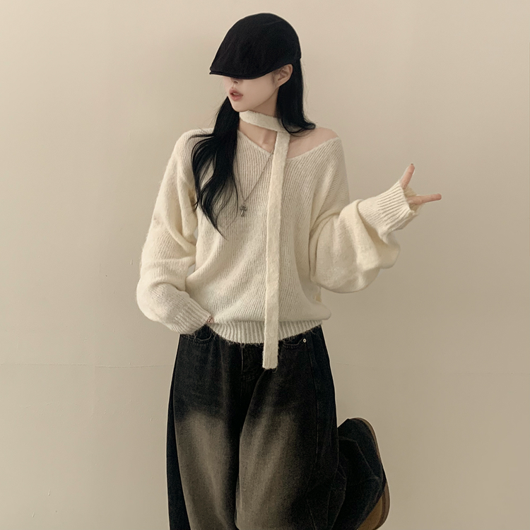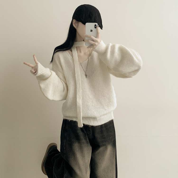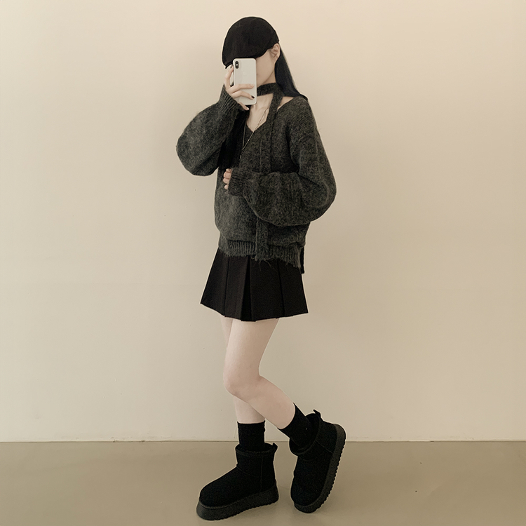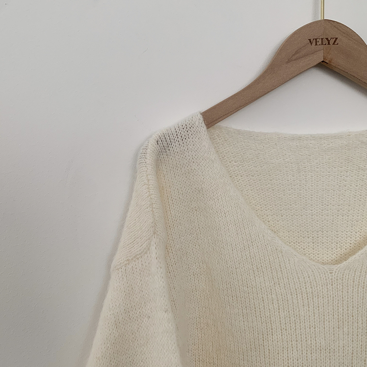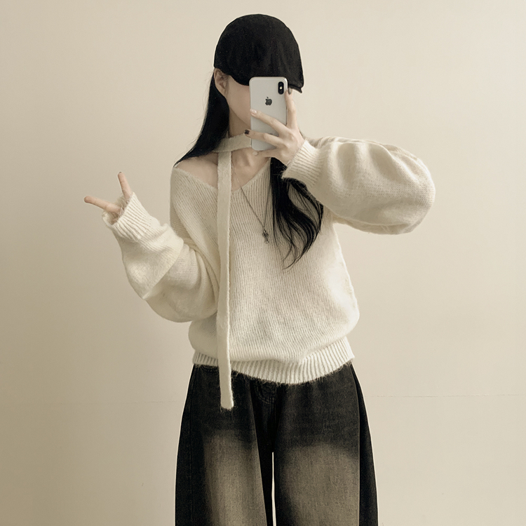 SNT32503 [첫구매 100원]촉감좋은 타이 초커 앙고라 박시 아방핏 브이넥 긴팔니트