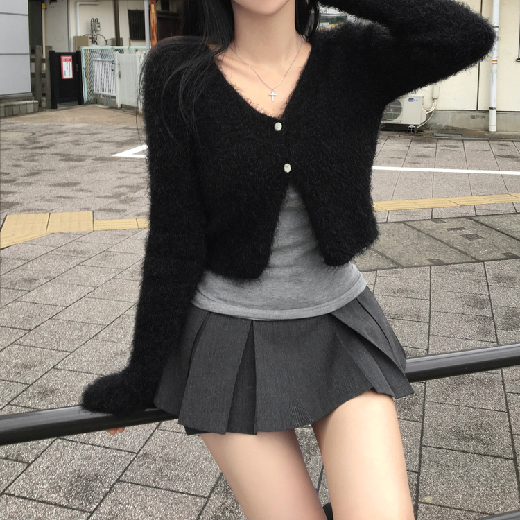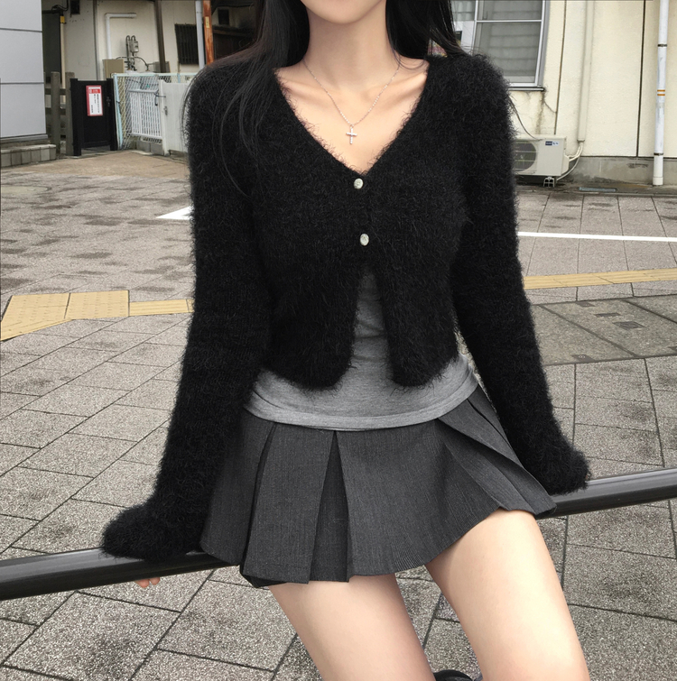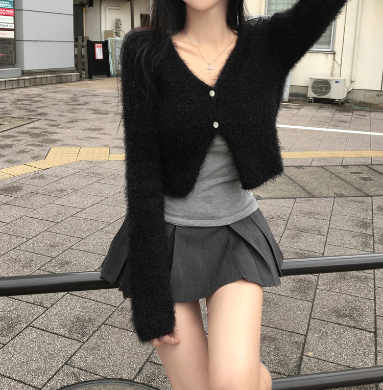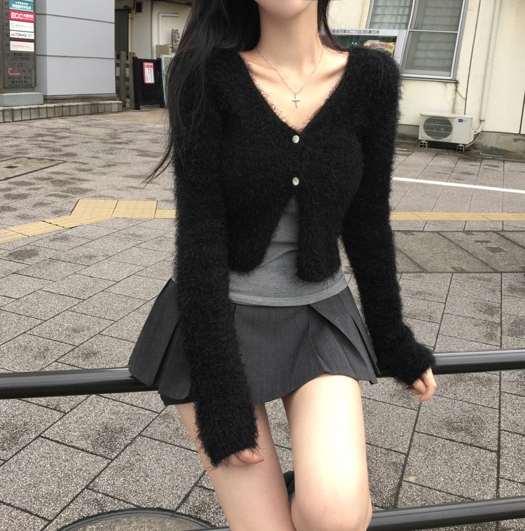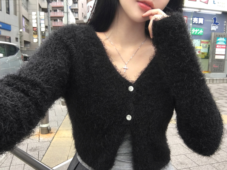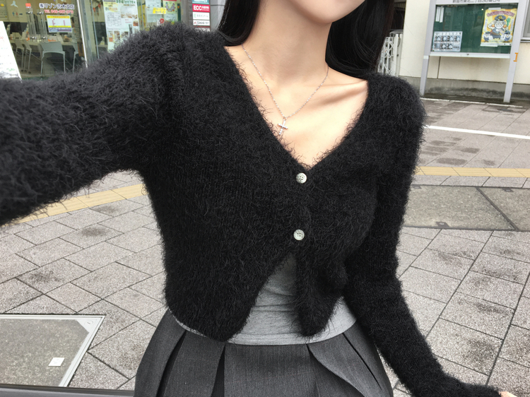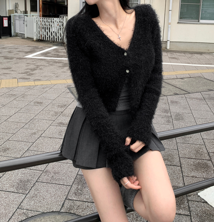 SGD29557 에니프 솔잎 퍼 아크릴 세미 크롭 슬림핏 가디건