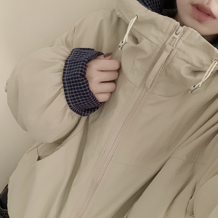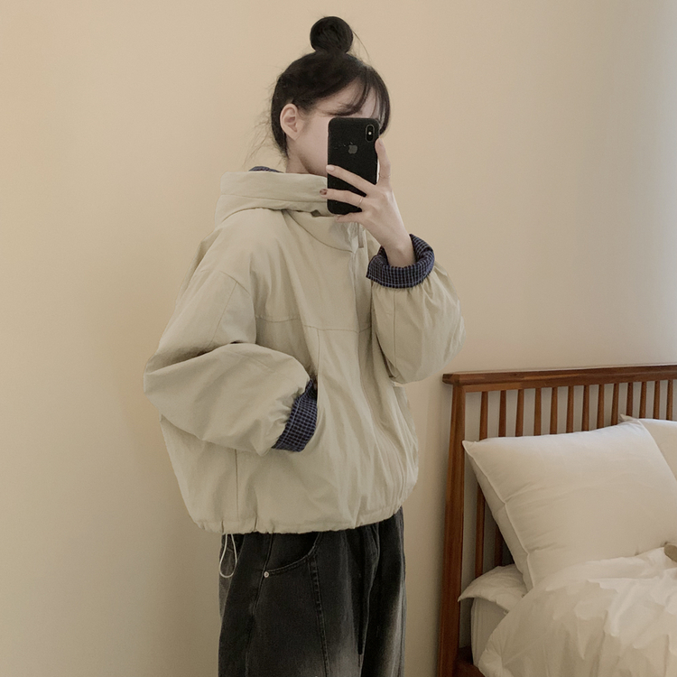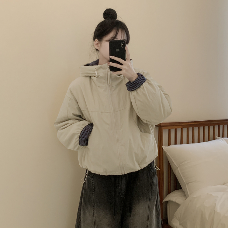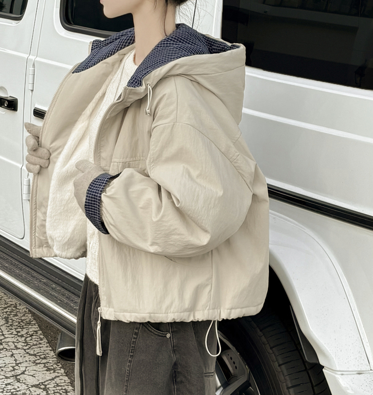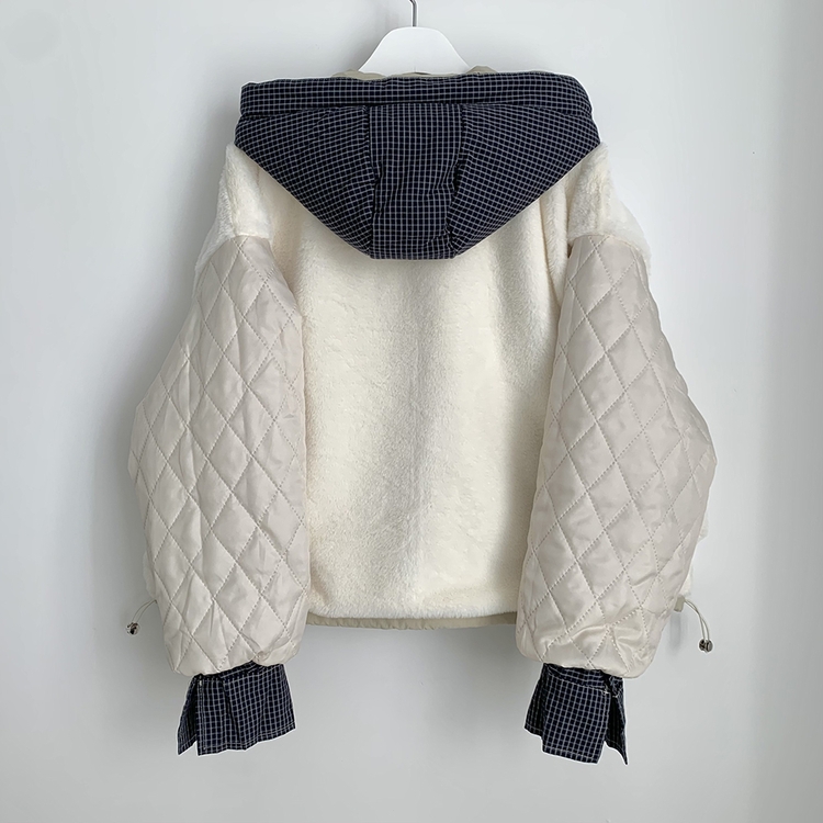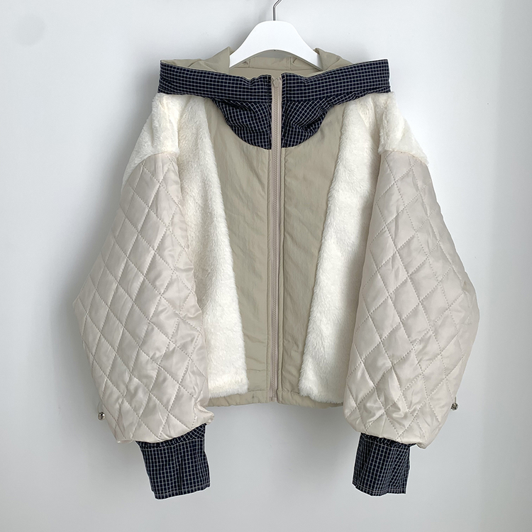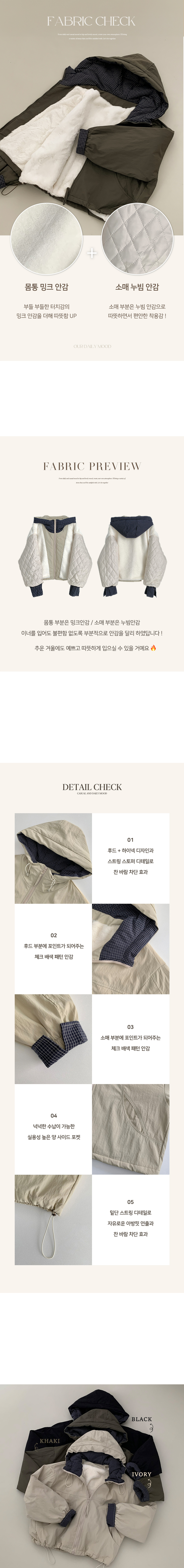 SJP18385 체크배색 양털 퍼후리스 누빔 퀄팅 오버핏 스트링 겨울점퍼 후드패딩 숏야상 자켓