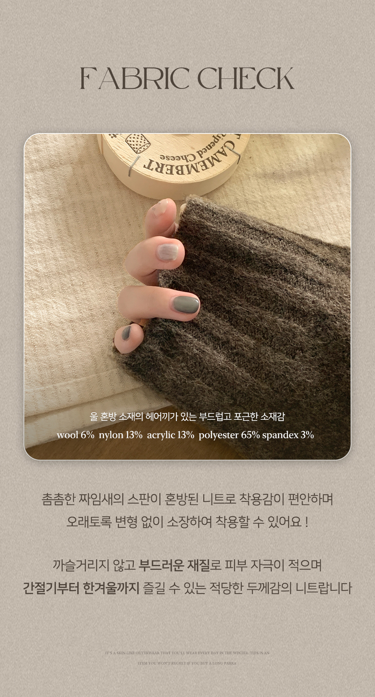 | 素材 | 울(6%), 나일론(13%), 아크릴(13%), 폴리,폴리에스터(65%), 스판덱스(3%) |