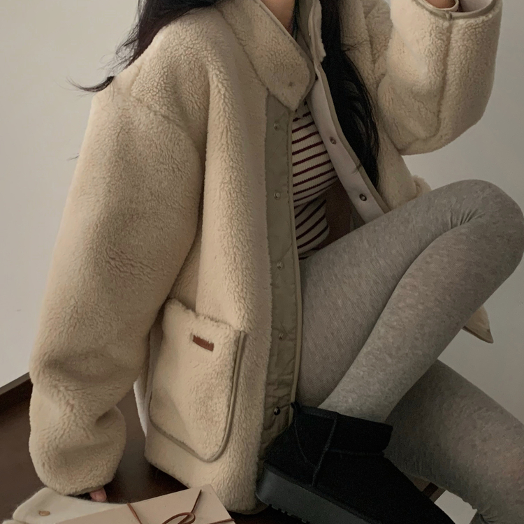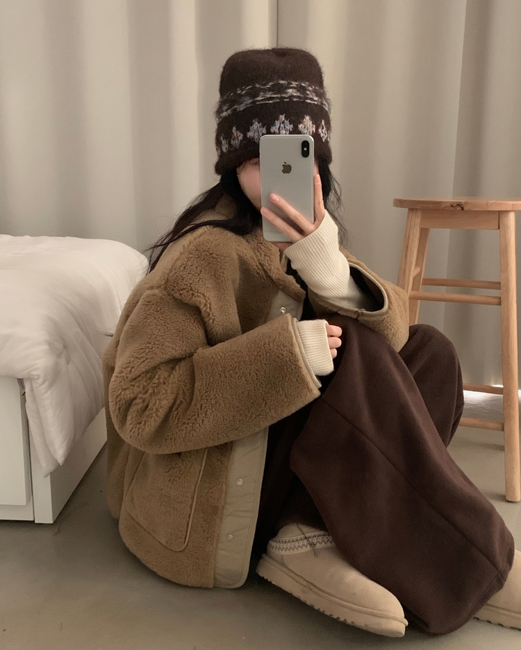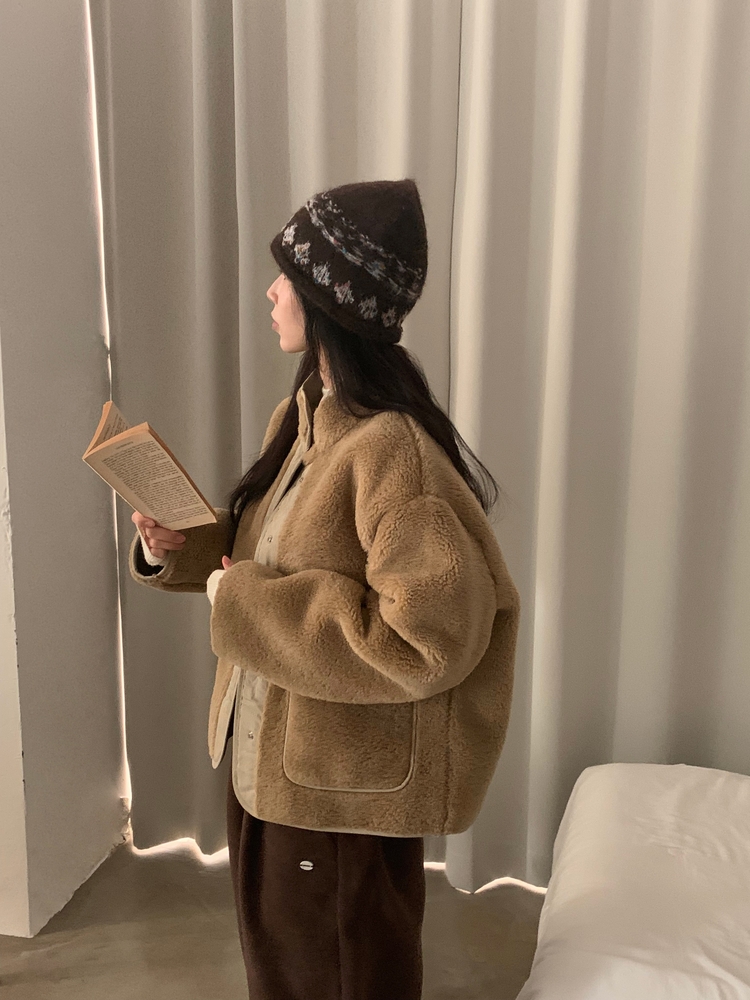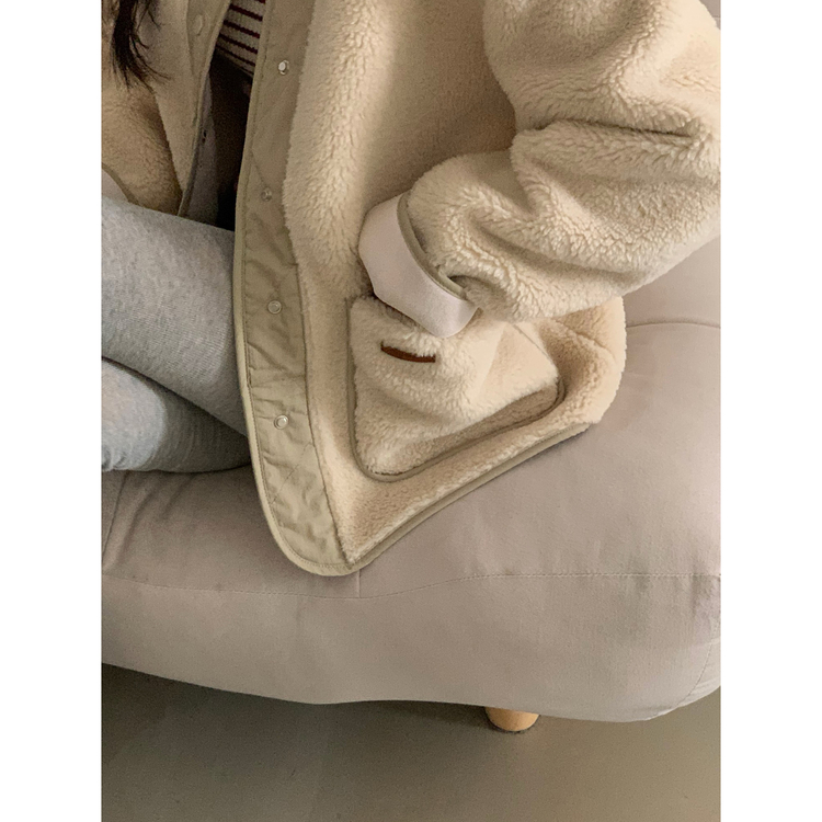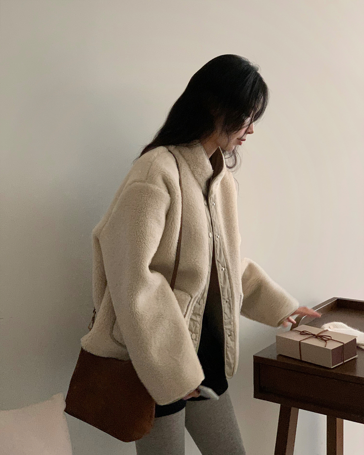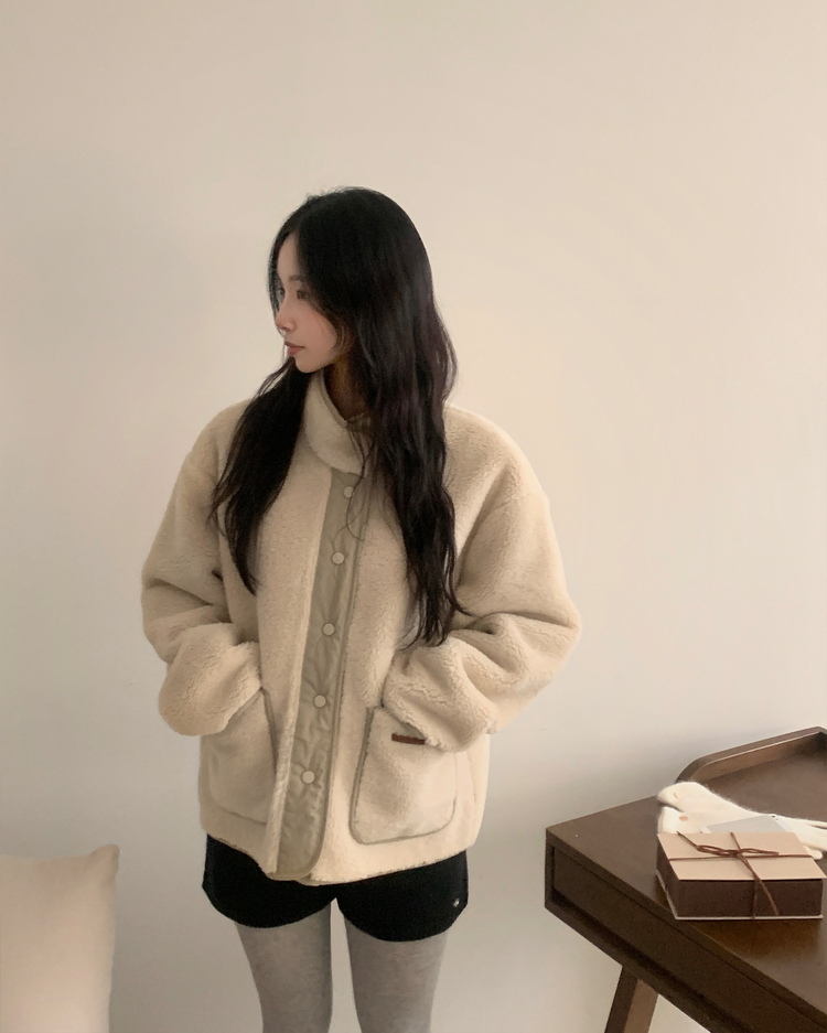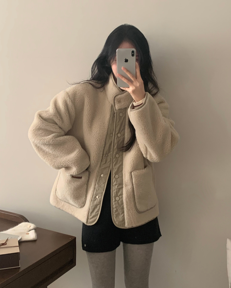 SJK14779 버터 플리스 양털 가죽패치 오버핏 덤블 배색 점퍼 자켓