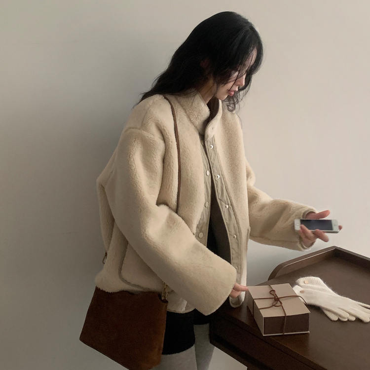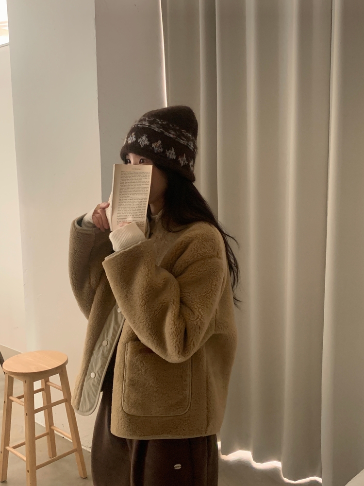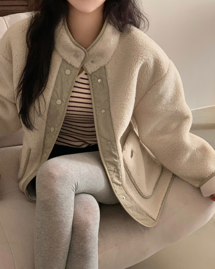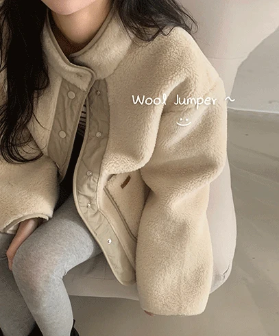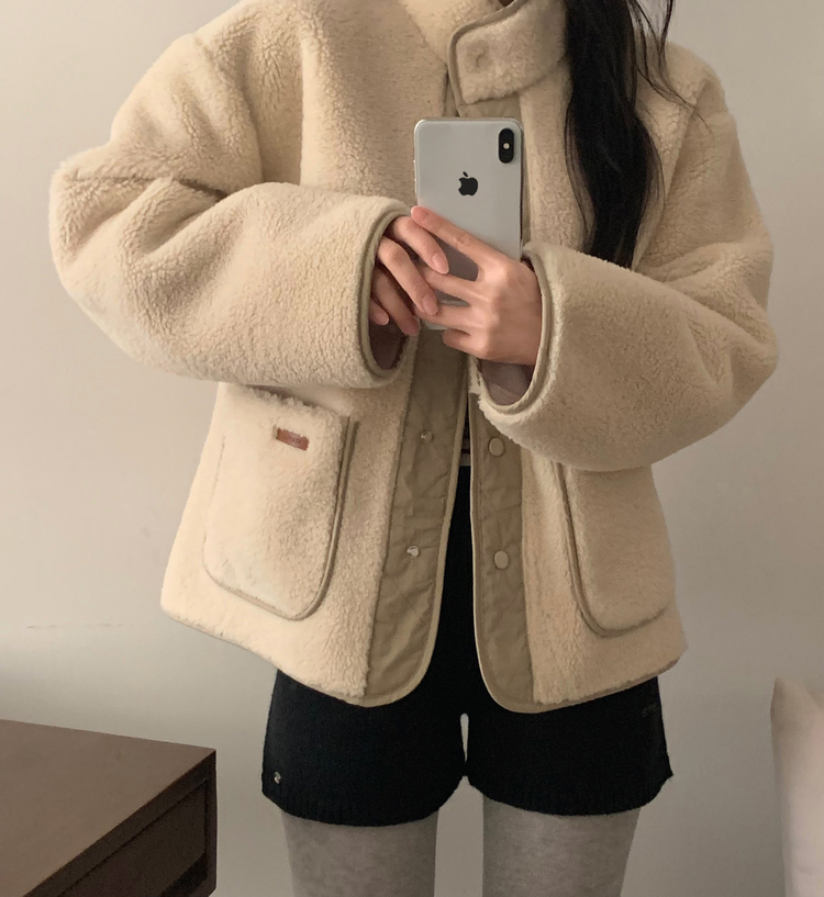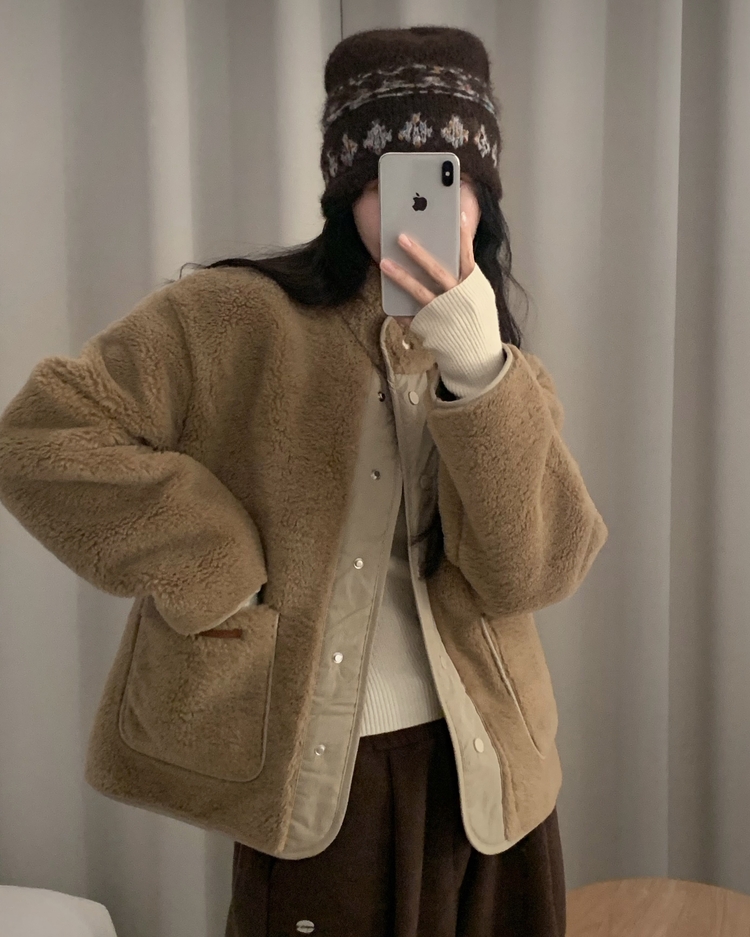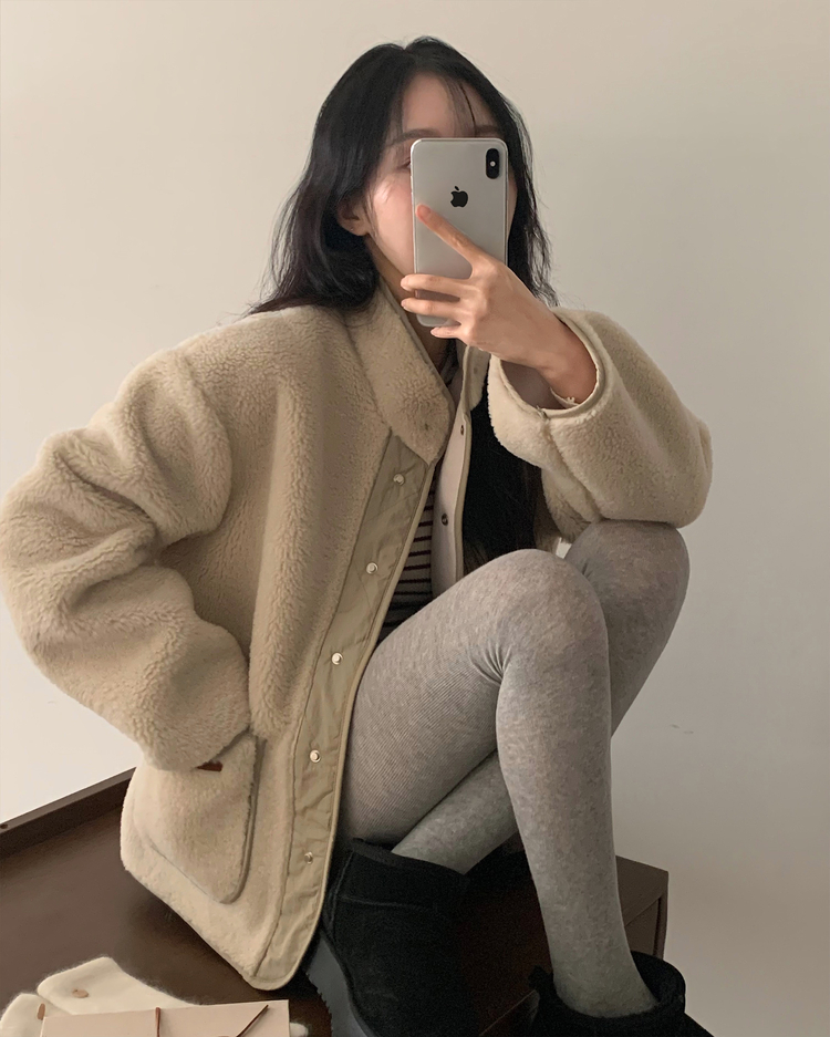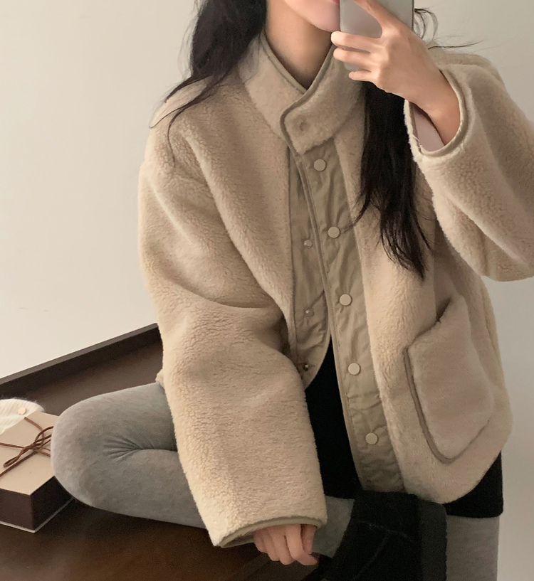 SJK14779 버터 플리스 양털 가죽패치 오버핏 덤블 배색 점퍼 자켓