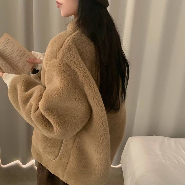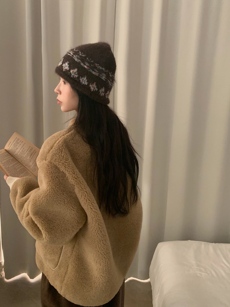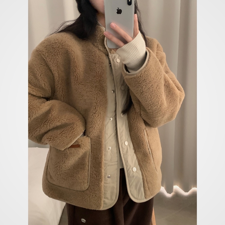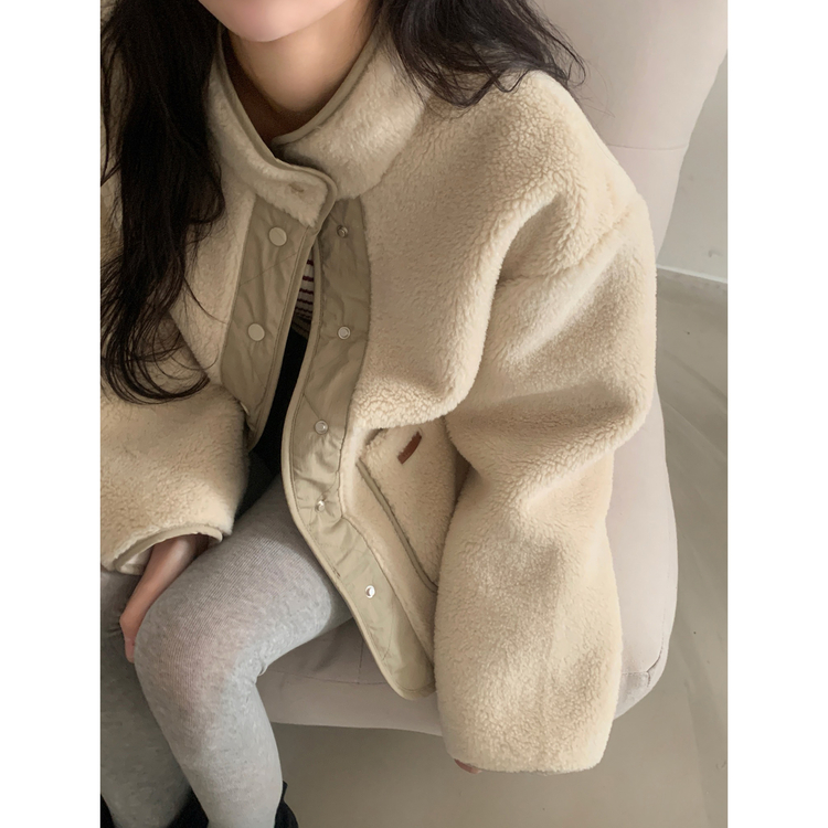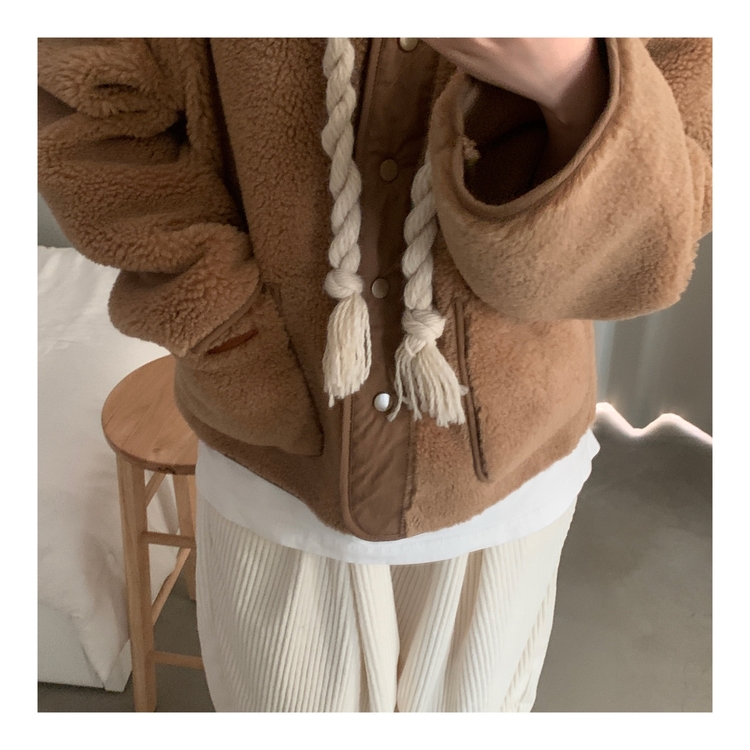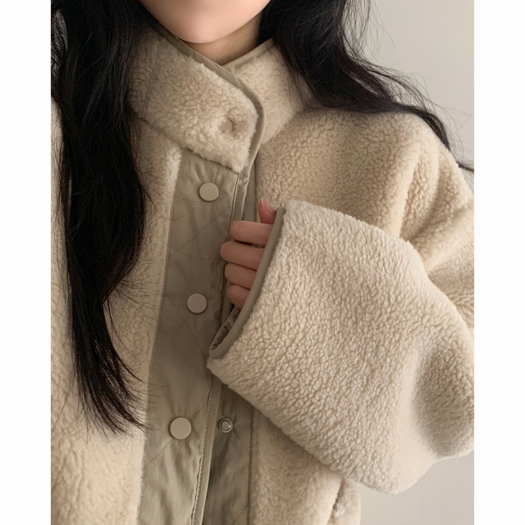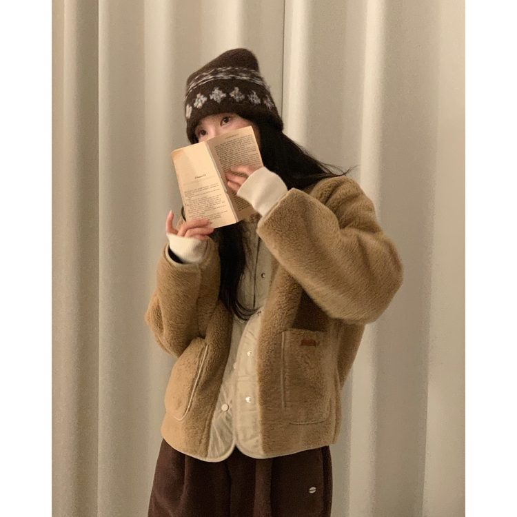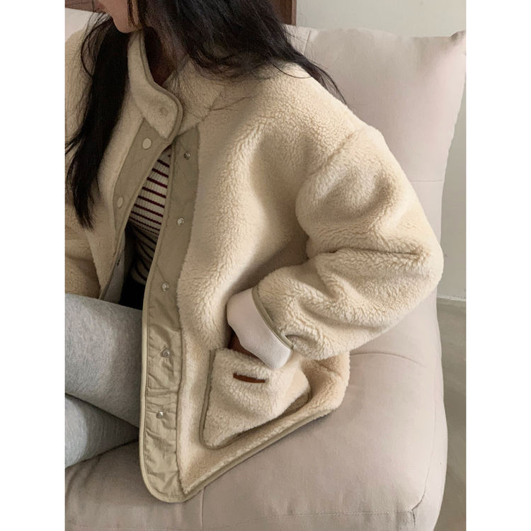 SJK14779 버터 플리스 양털 가죽패치 오버핏 덤블 배색 점퍼 자켓