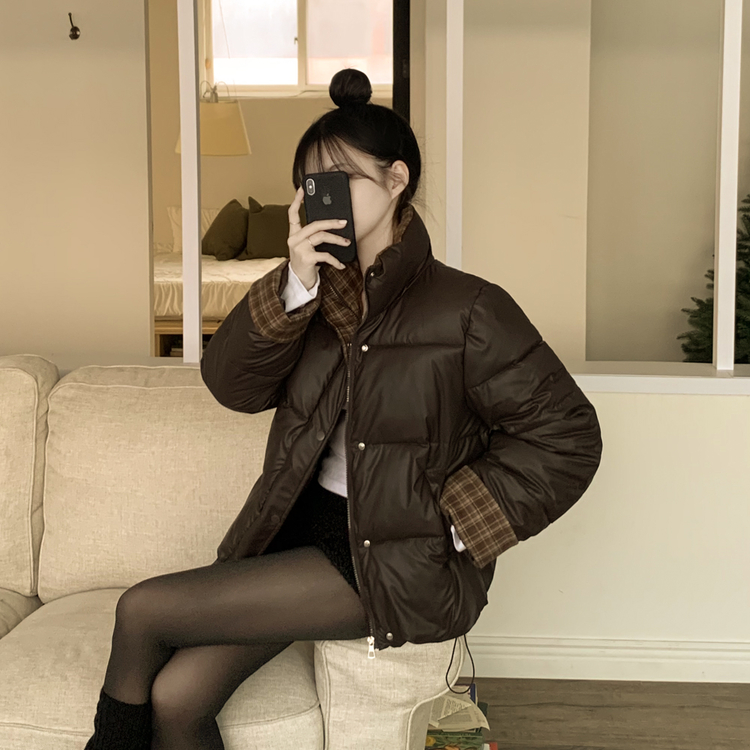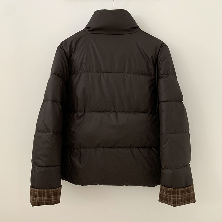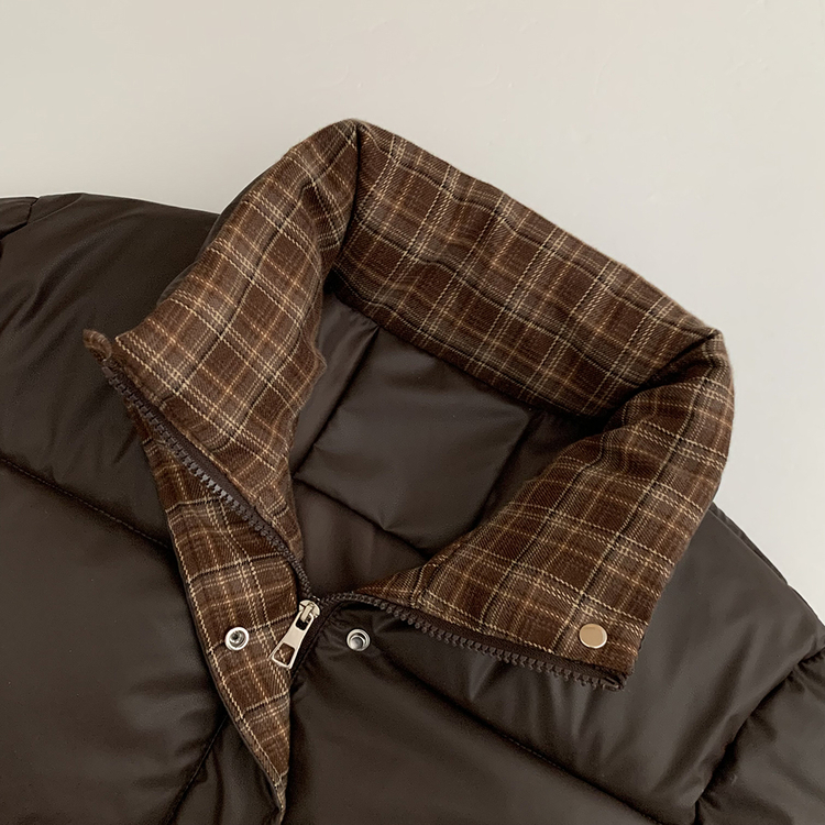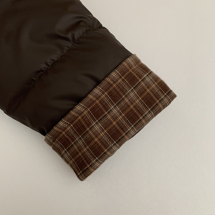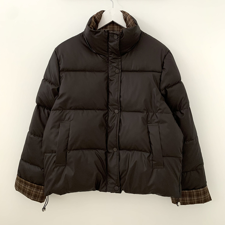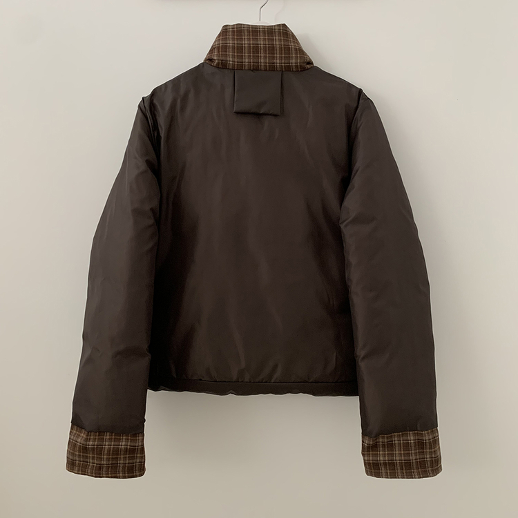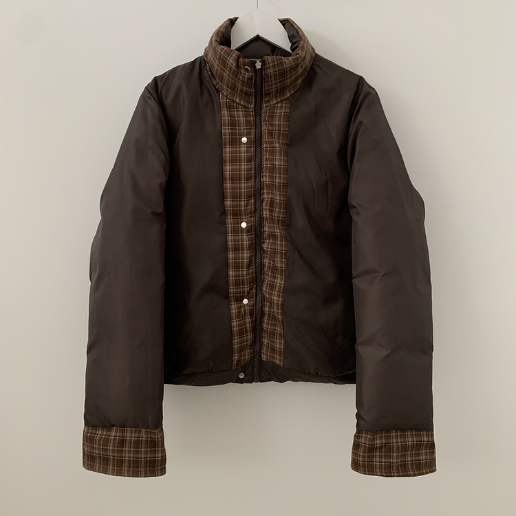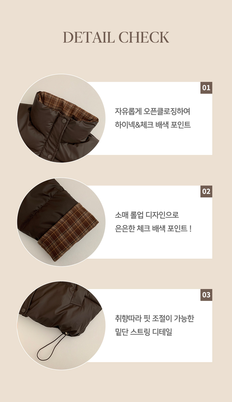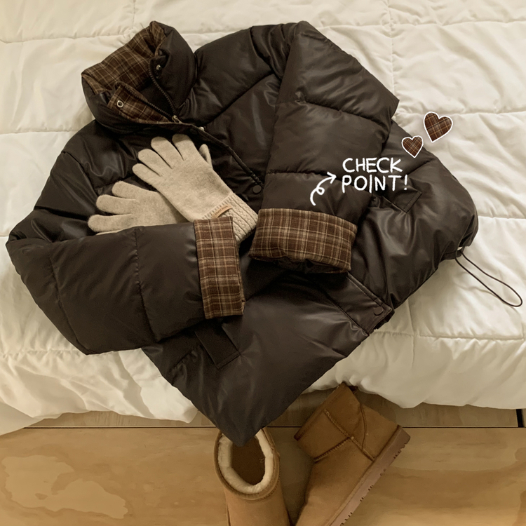 SJP18680 체크배색 하이넥 웰론 겨울 무광 가죽 빵빵 브라운 숏패딩 점퍼