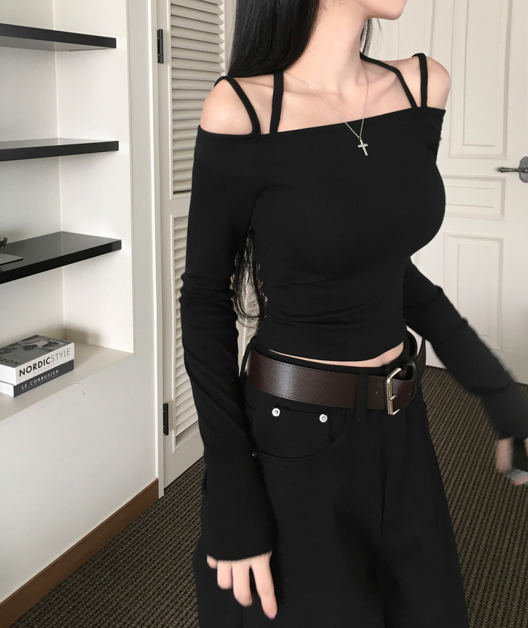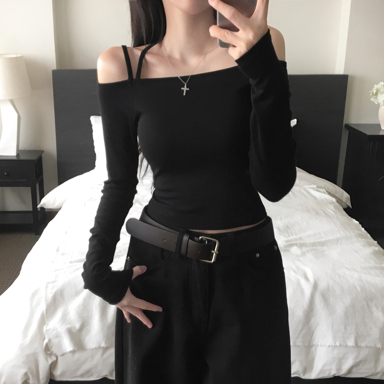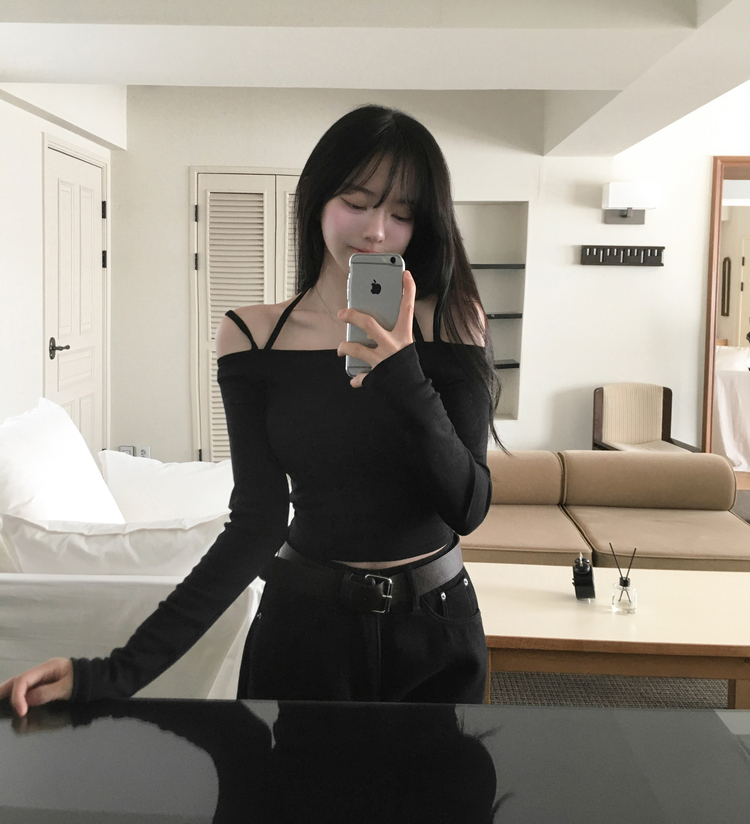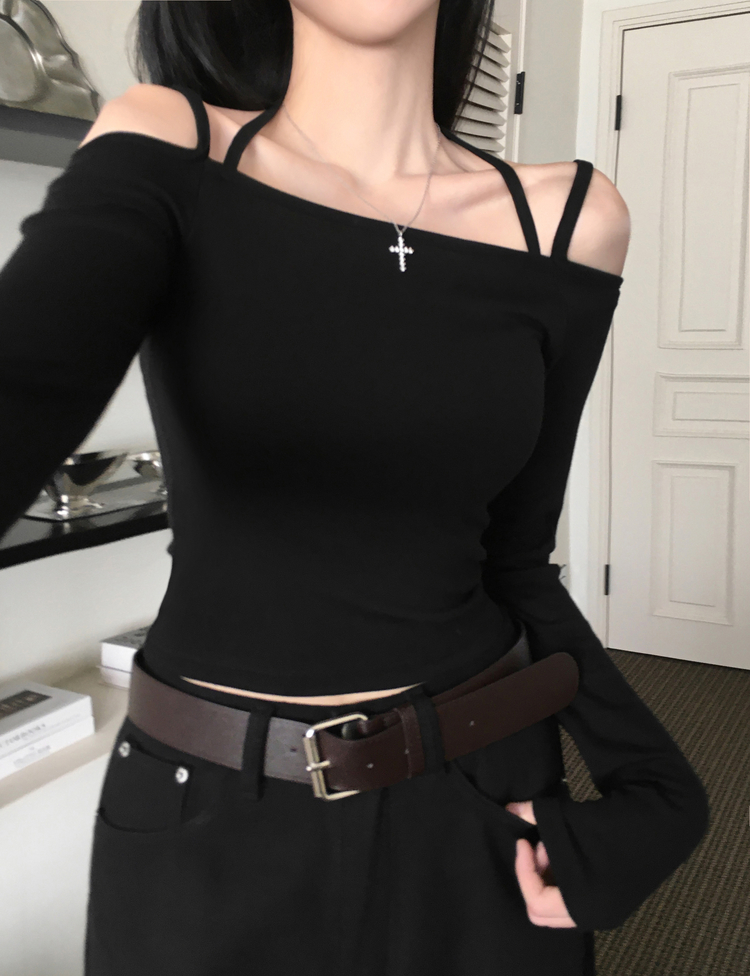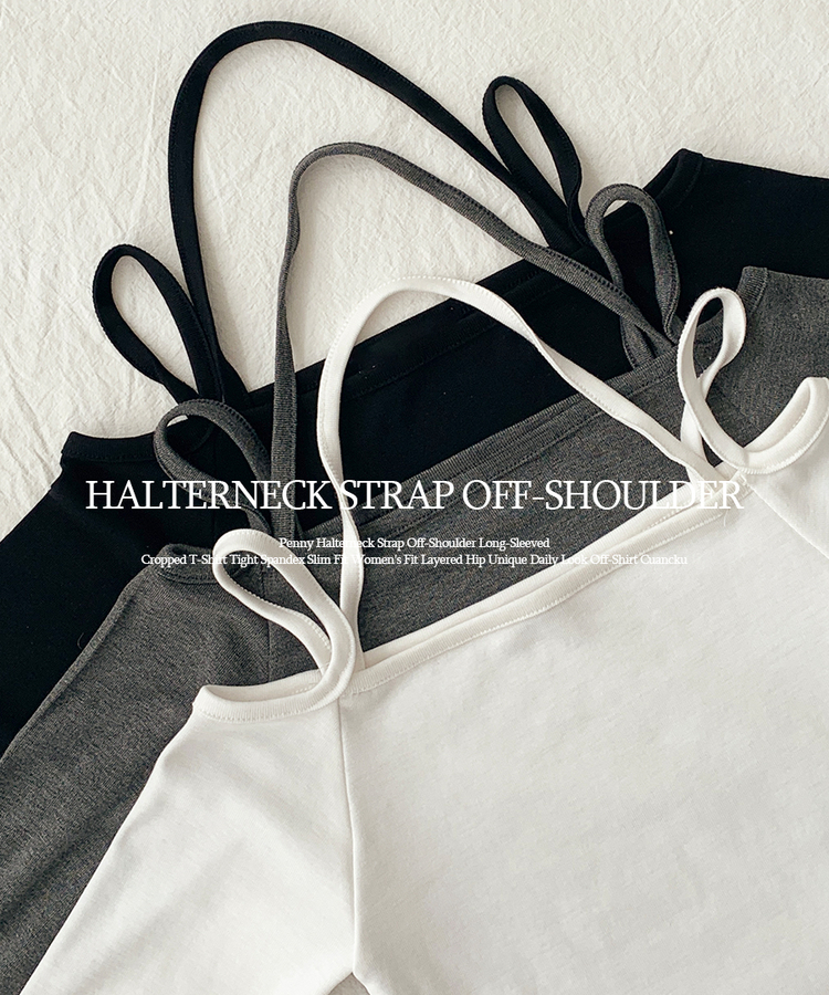 STS73472 페니 홀터넥 스트랩 오프숄더 긴팔 크롭 티셔츠