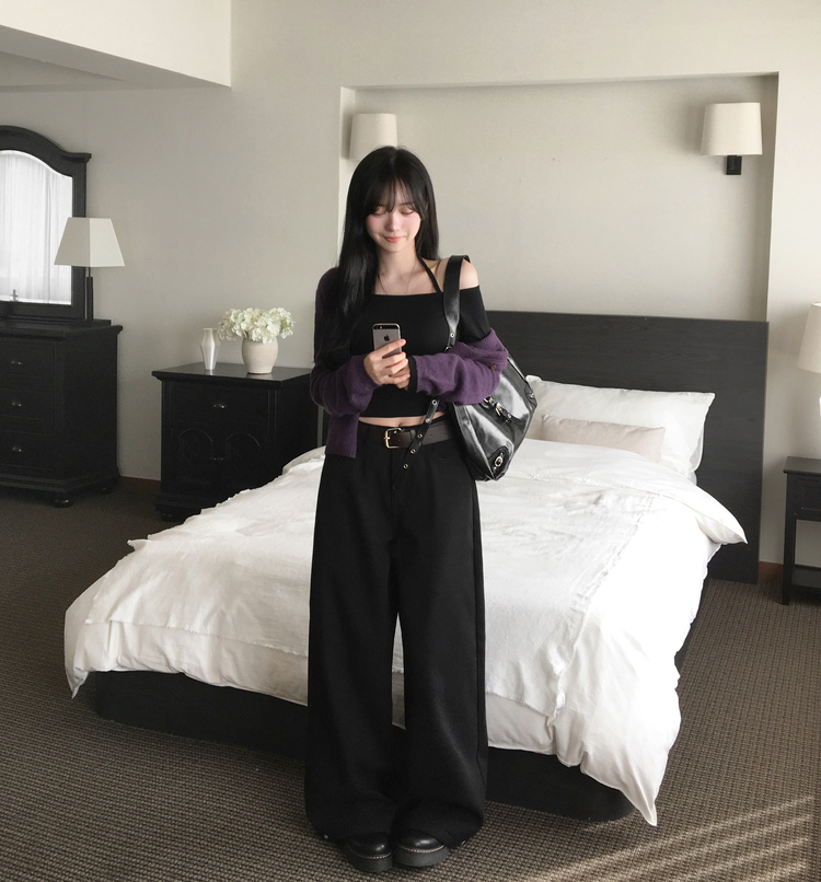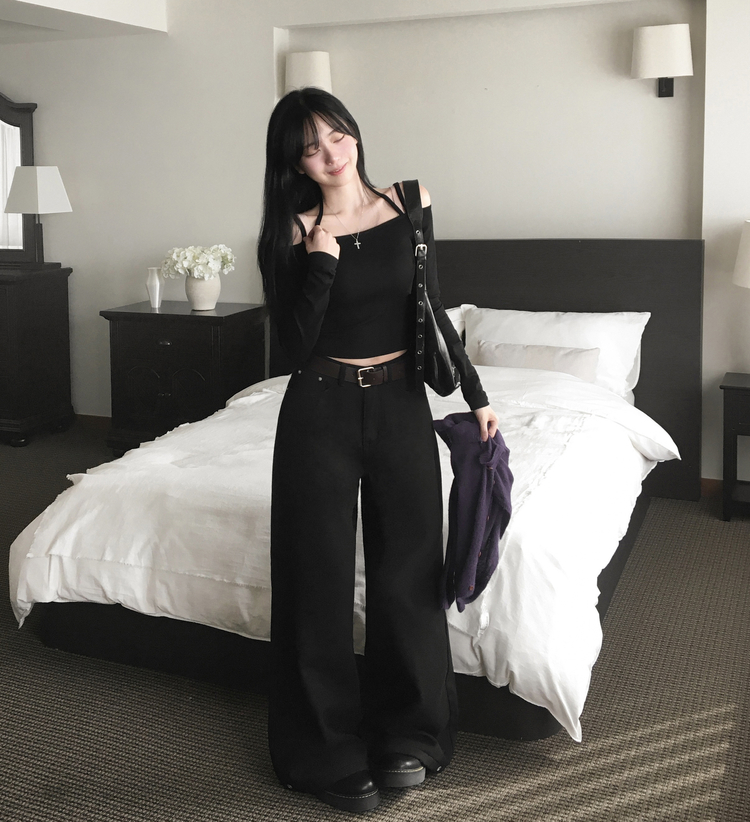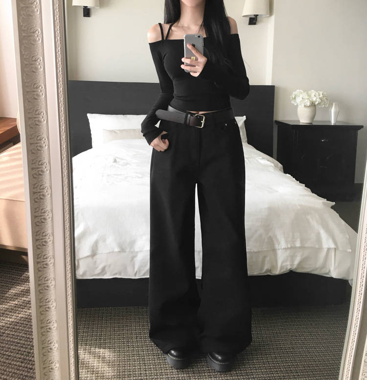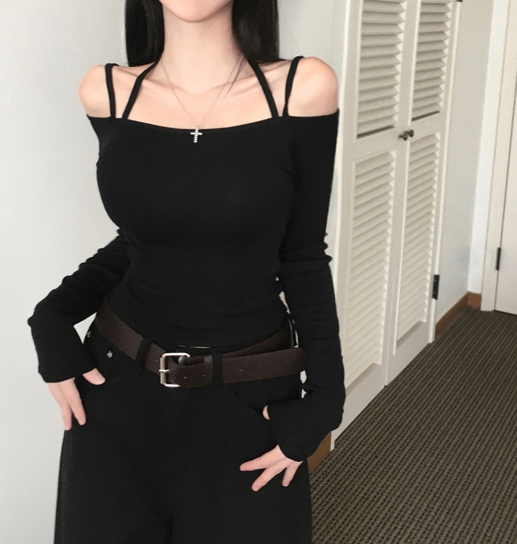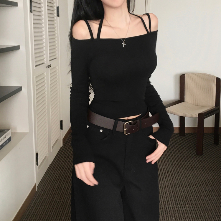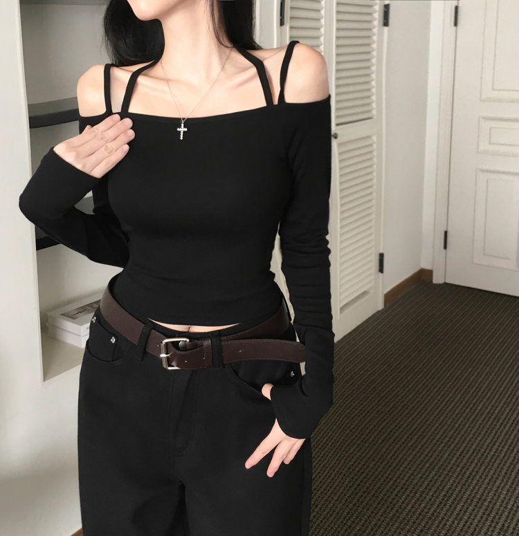 STS73472 페니 홀터넥 스트랩 오프숄더 긴팔 크롭 티셔츠